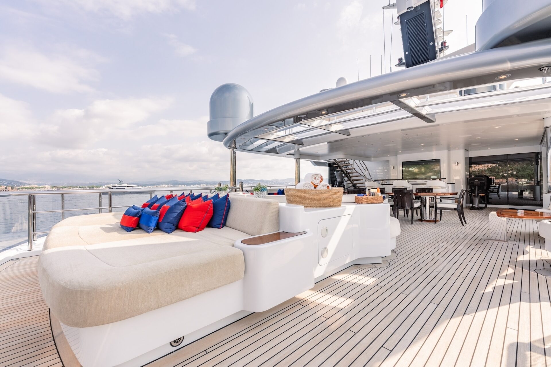On the bridge deck, you’ll find ARIENCE’s large sports bar with a built-in seating area and a widescreen TV. Another bar and dining area are located on the upper aft deck while the main aft deck has a delightful lounge. On the lower deck, ARIENCE’s beach club folds out to create a fabulous floating terrace.