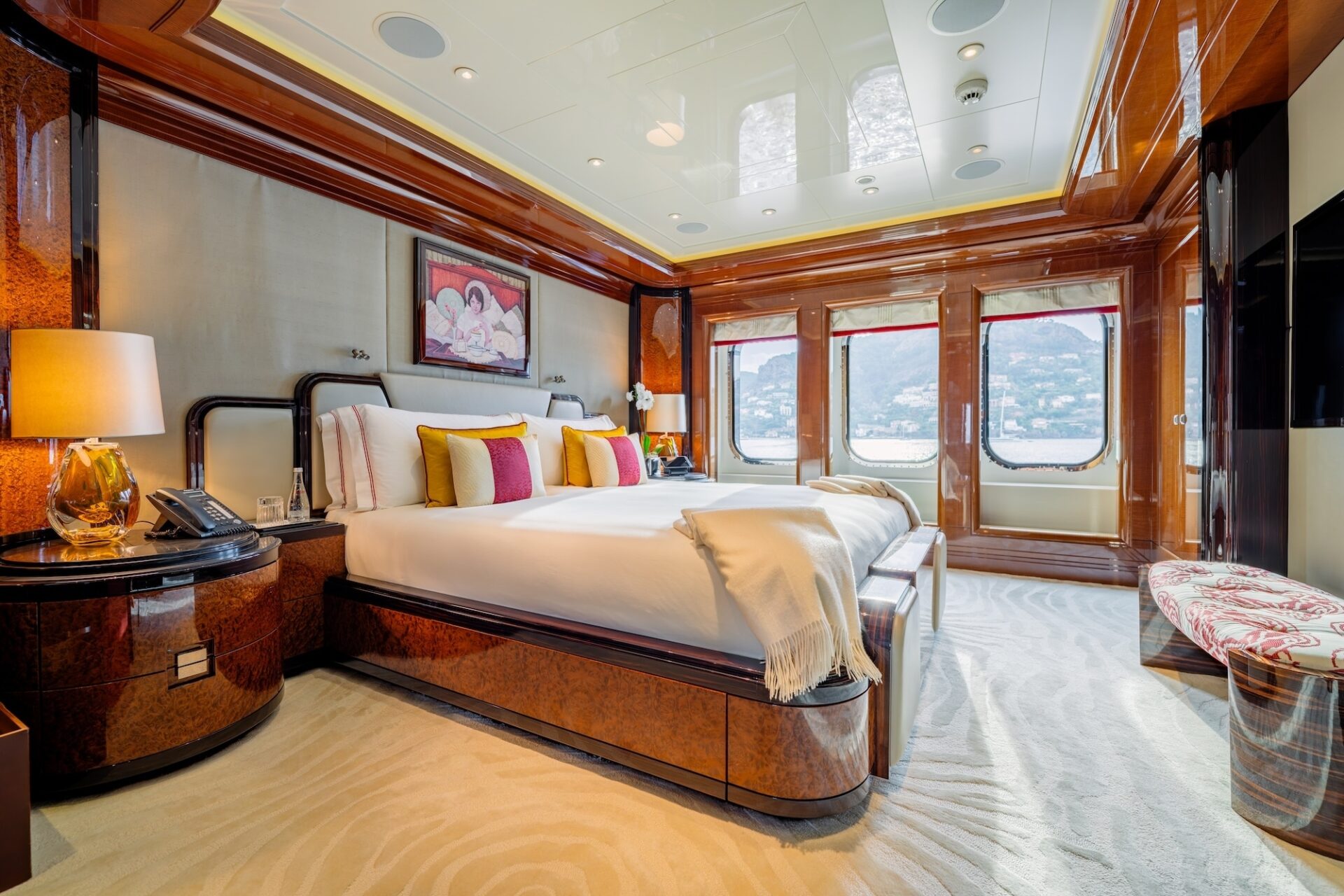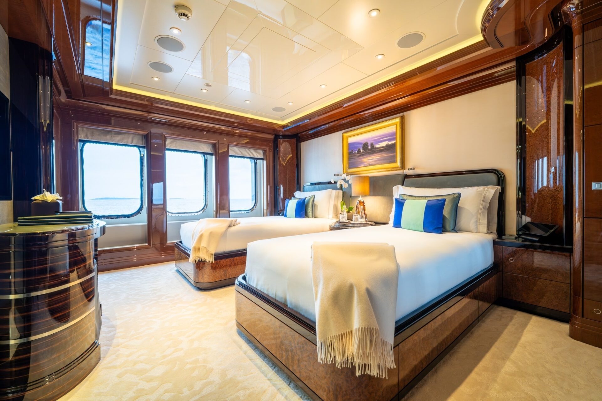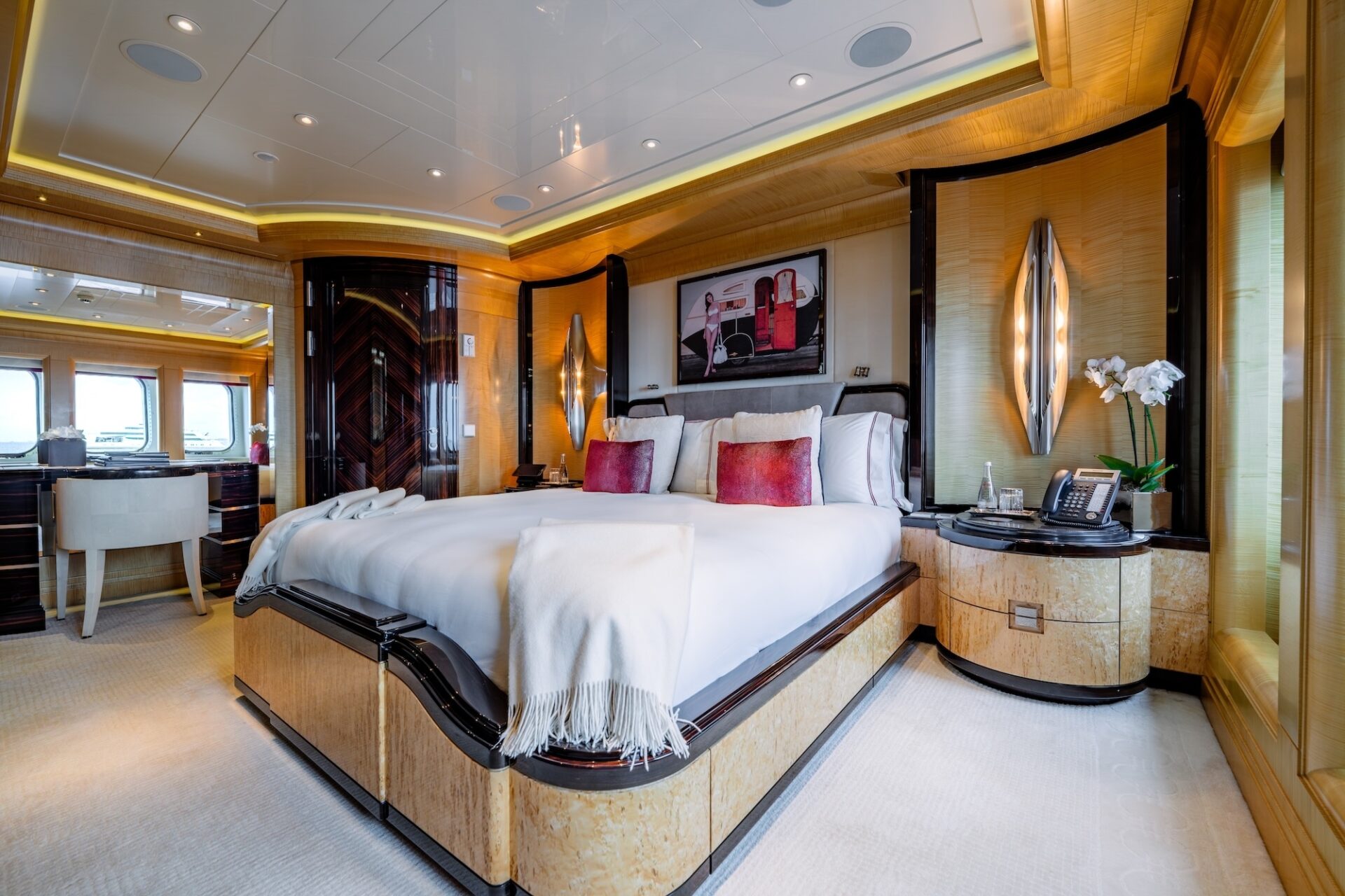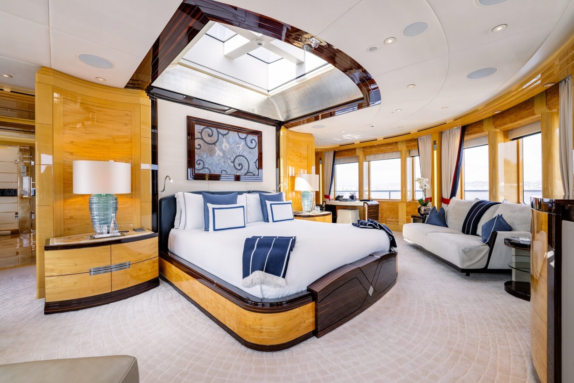 On the main deck, an elegant foyer with a glass lift leads into the main salon and dining area. Styled as an open-plan living space, the salon features a comfortable seating area with a deco-style wet bar. A central credenza with a hidden television separates the salon from the formal dining salon which seats 12 guests.