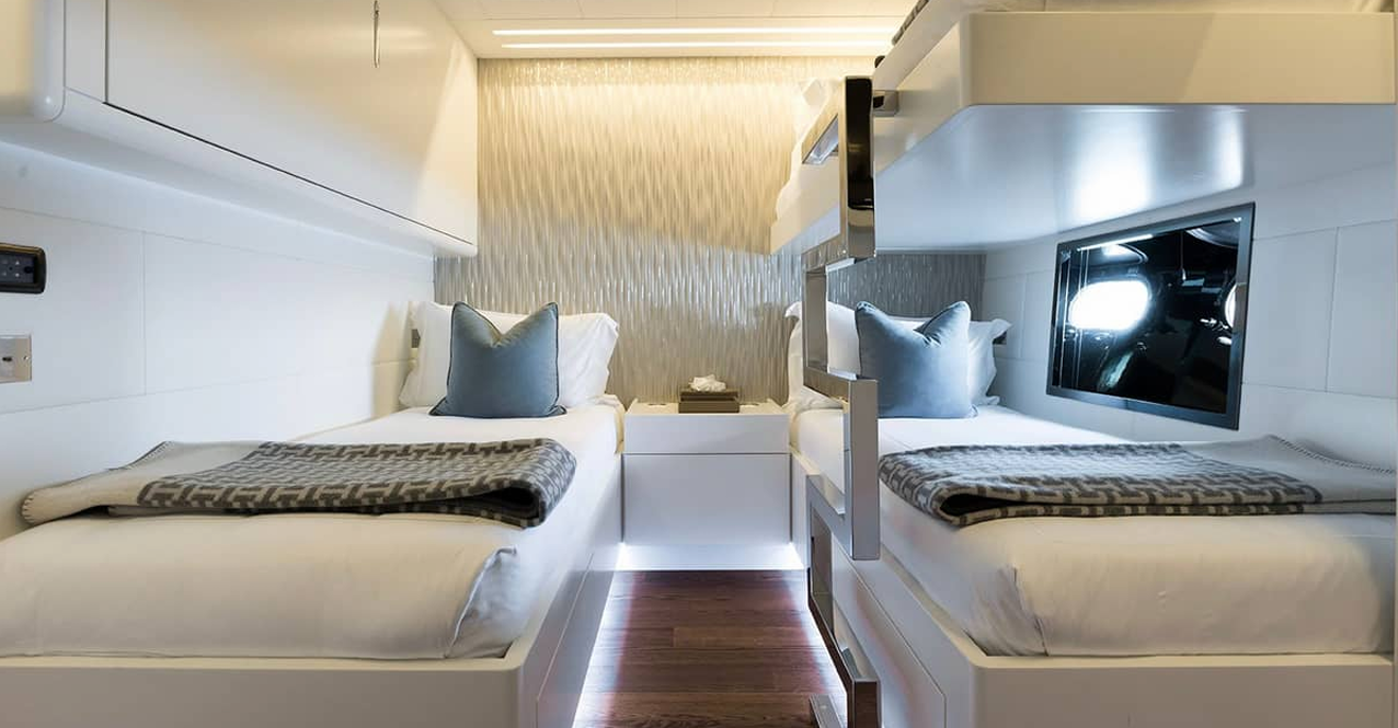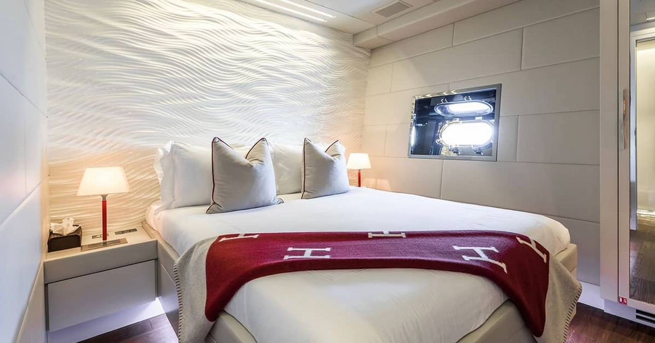 BEACHOUSE’s stylish guest accommodation includes also a VIP stateroom, a double cabin and a twin cabin with an additional Pullman bed. Each cabin has an individual colour scheme and is equipped with an ensuite bathroom. BEACHOUSE also has accommodation for her professional six-person crew on the lower deck.