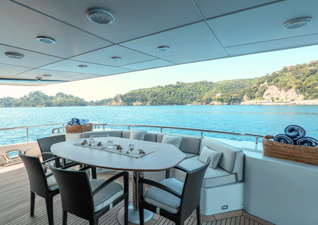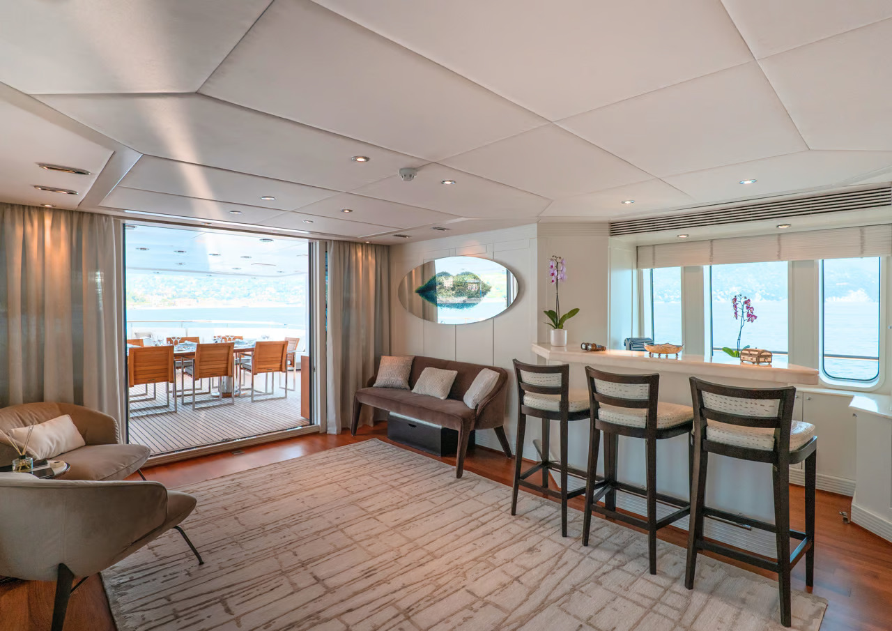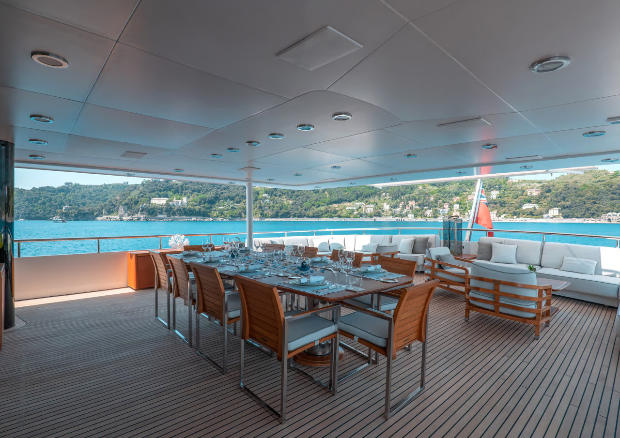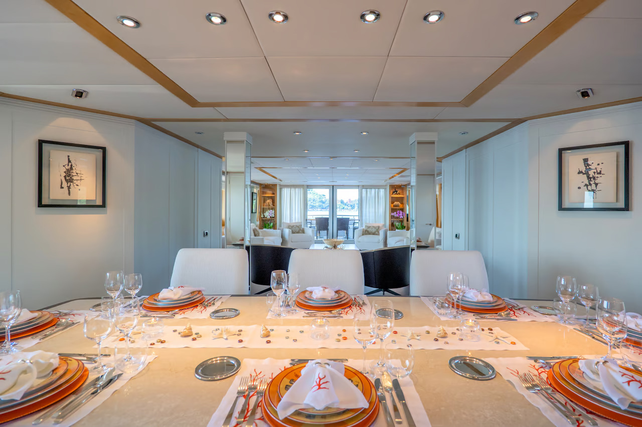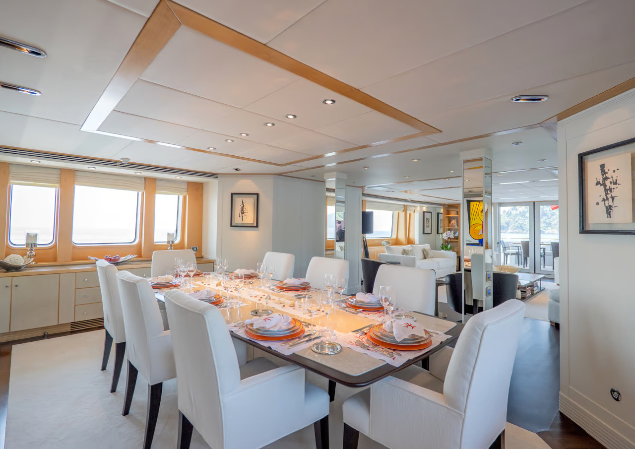 The dining area is linked to the galley with a video camera ensuring impeccable service by the crew during meals.