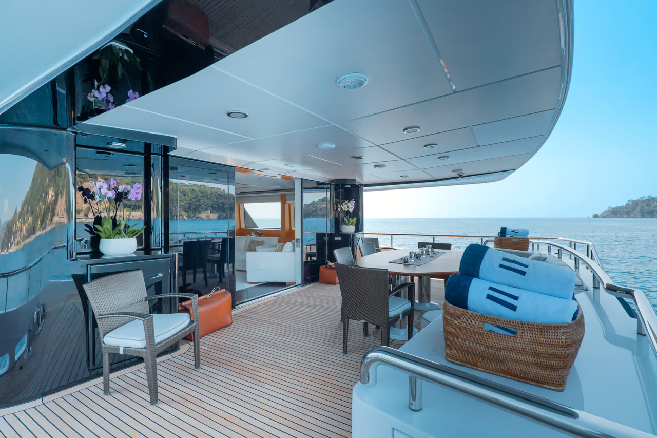 DEEP BLUE II has an elegant formal dining area for eight with an adjoining pantry. On the upper deck, the intimate skylounge has a bar plus a DJ station for onboard socialising and entertaining.