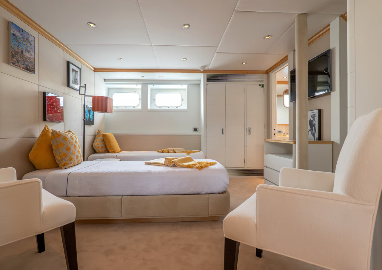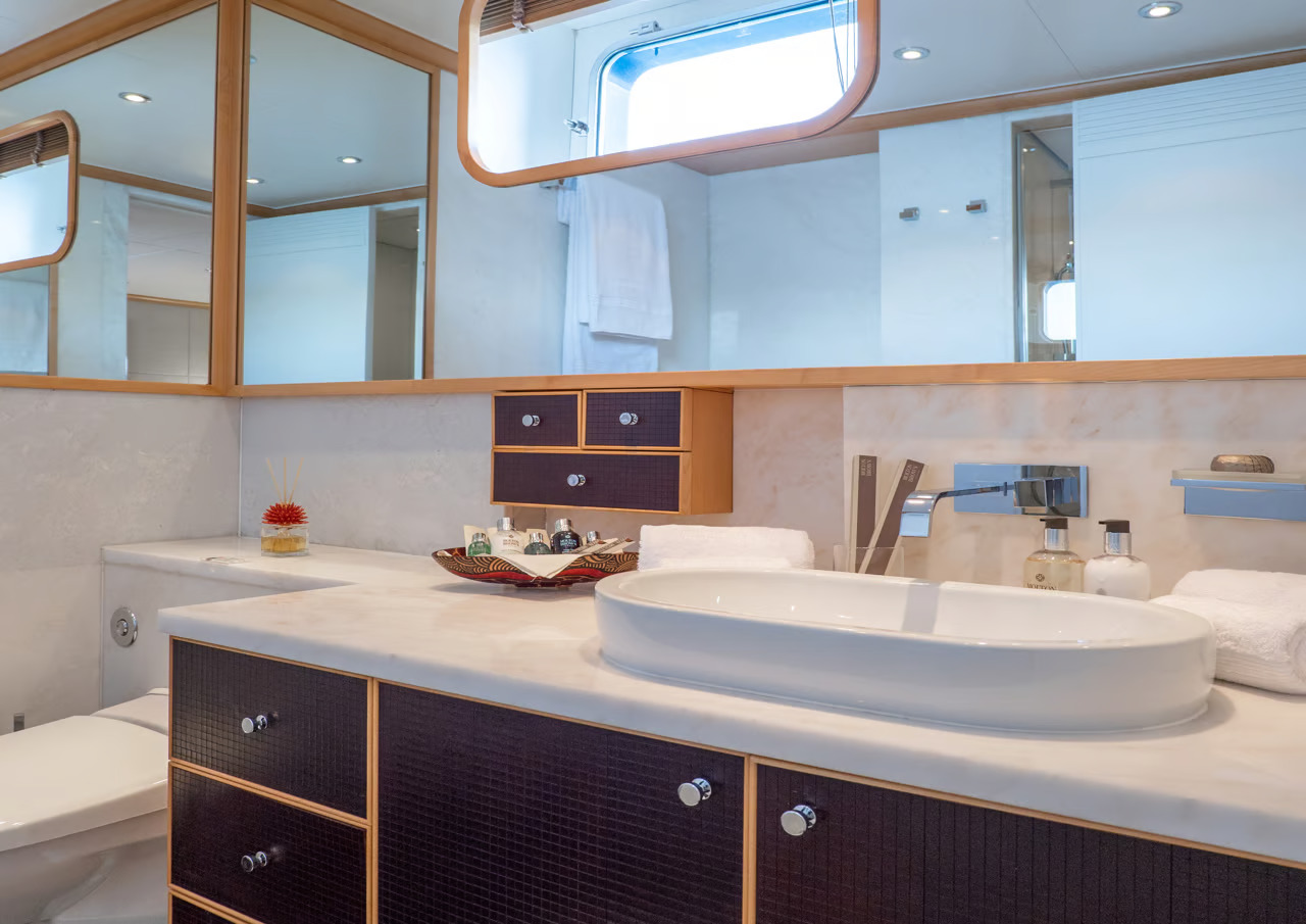 On the lower deck, an elegant full-beam VIP cabin can be conveniently converted into a fifth cabin for additional guests. The guest accommodation is also located on the lower deck and includes a double cabin and a twin cabin. All the staterooms are equipped with satellite TV, WIFI access, and a music system.