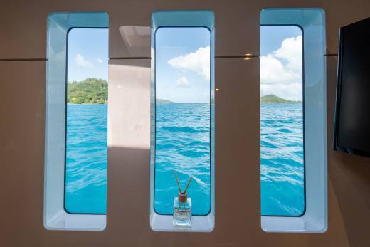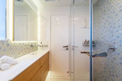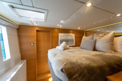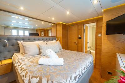 On her lower deck, DIANA can accommodate up to 8 guests including four double guest suites. Each of the cabins has beautiful en suite bathrooms and an individual smart TV and audio system. DIANA is an all-in-one catamaran that can be turned into either a family yacht or a party boat.