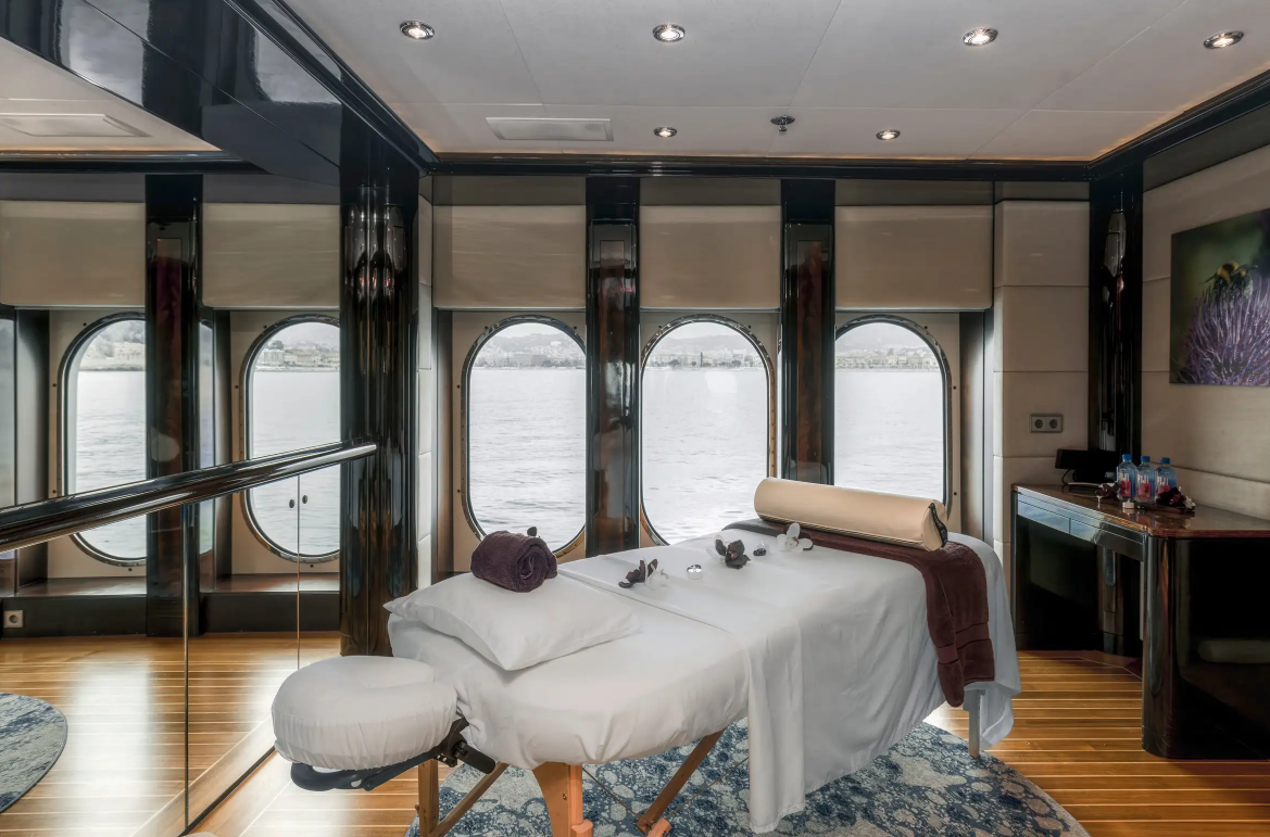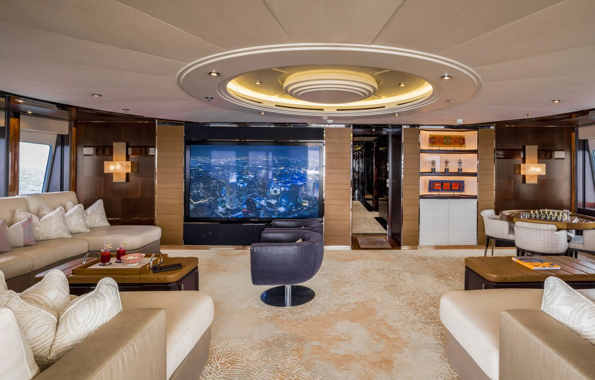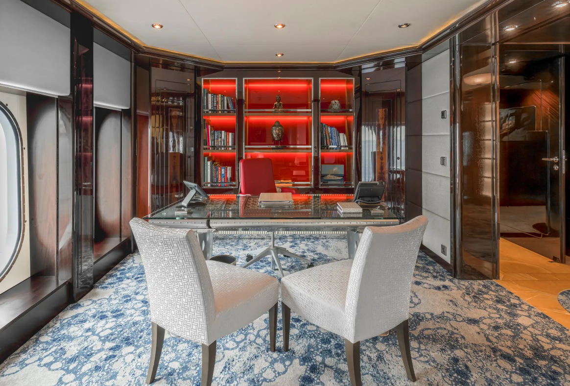 Relax in the spacious main salon with its comfortable seating area and high-tech entertainment system. Enjoy dinner in the elegant formal dining room which accommodates 10 guests. Catch up on work in the beautiful home office, get a workout in the bridge deck gym or watch a movie on the cinema screen up in the skylounge.