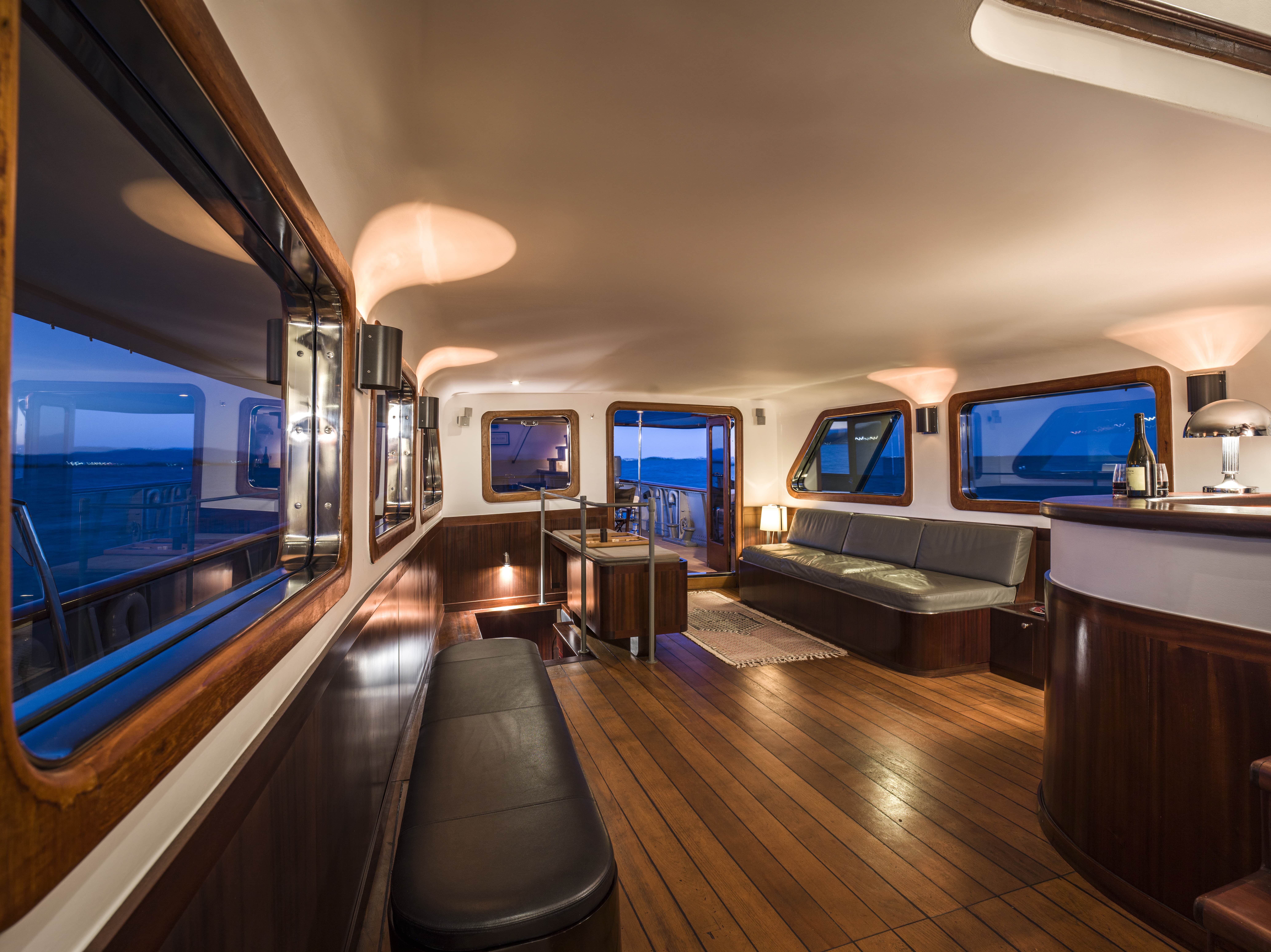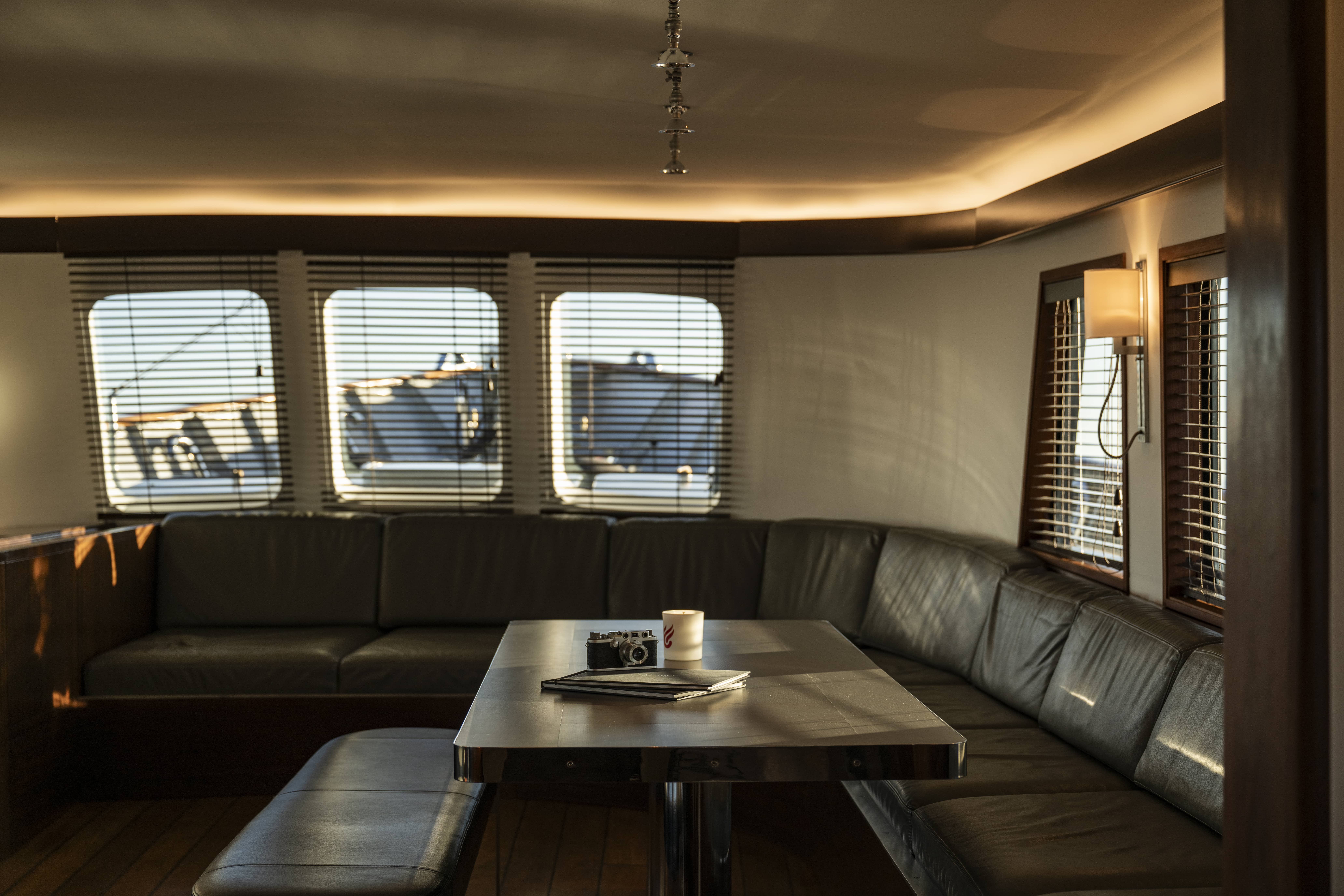 An interior design by Christian Liaigre, who was involved from 2005 to 2016, with his main input in the 2015/2016 refit, reflects a perfect balance between modern aesthetics and traditional charm, pairing dark wood flooring and panelling with leather accents. The open-plan layout creates a sense of spaciousness and connects the different living spaces throughout the yacht’s interior.