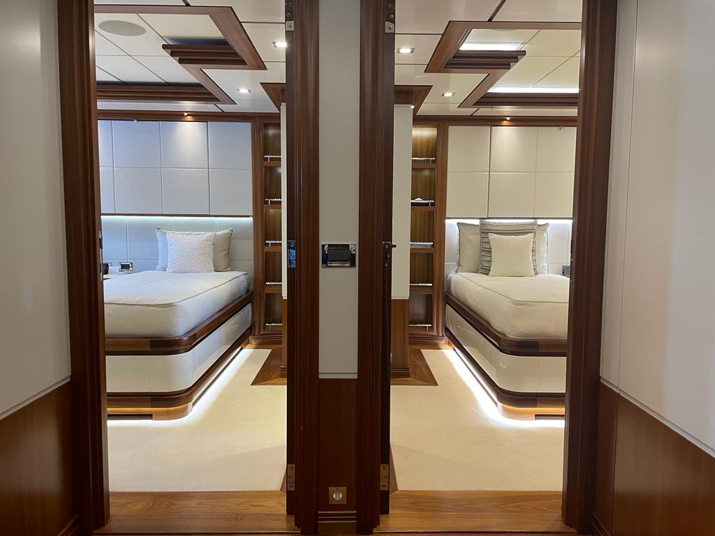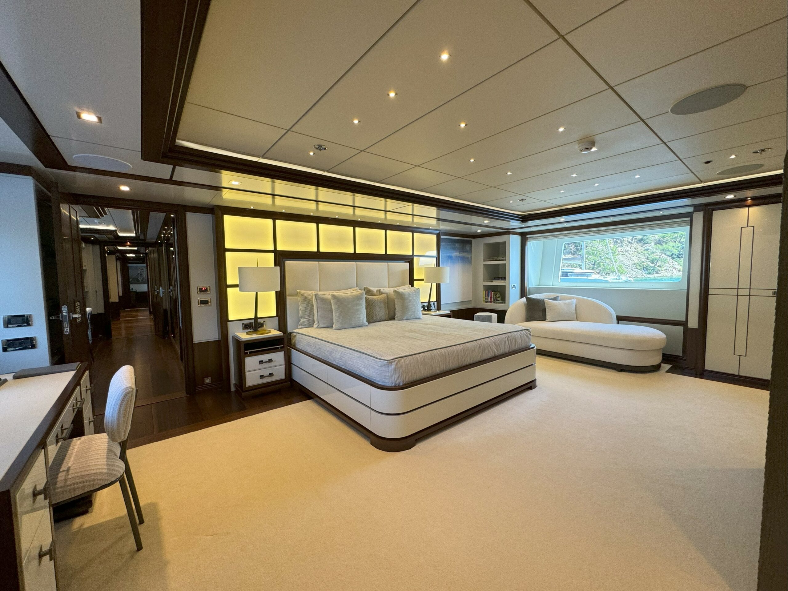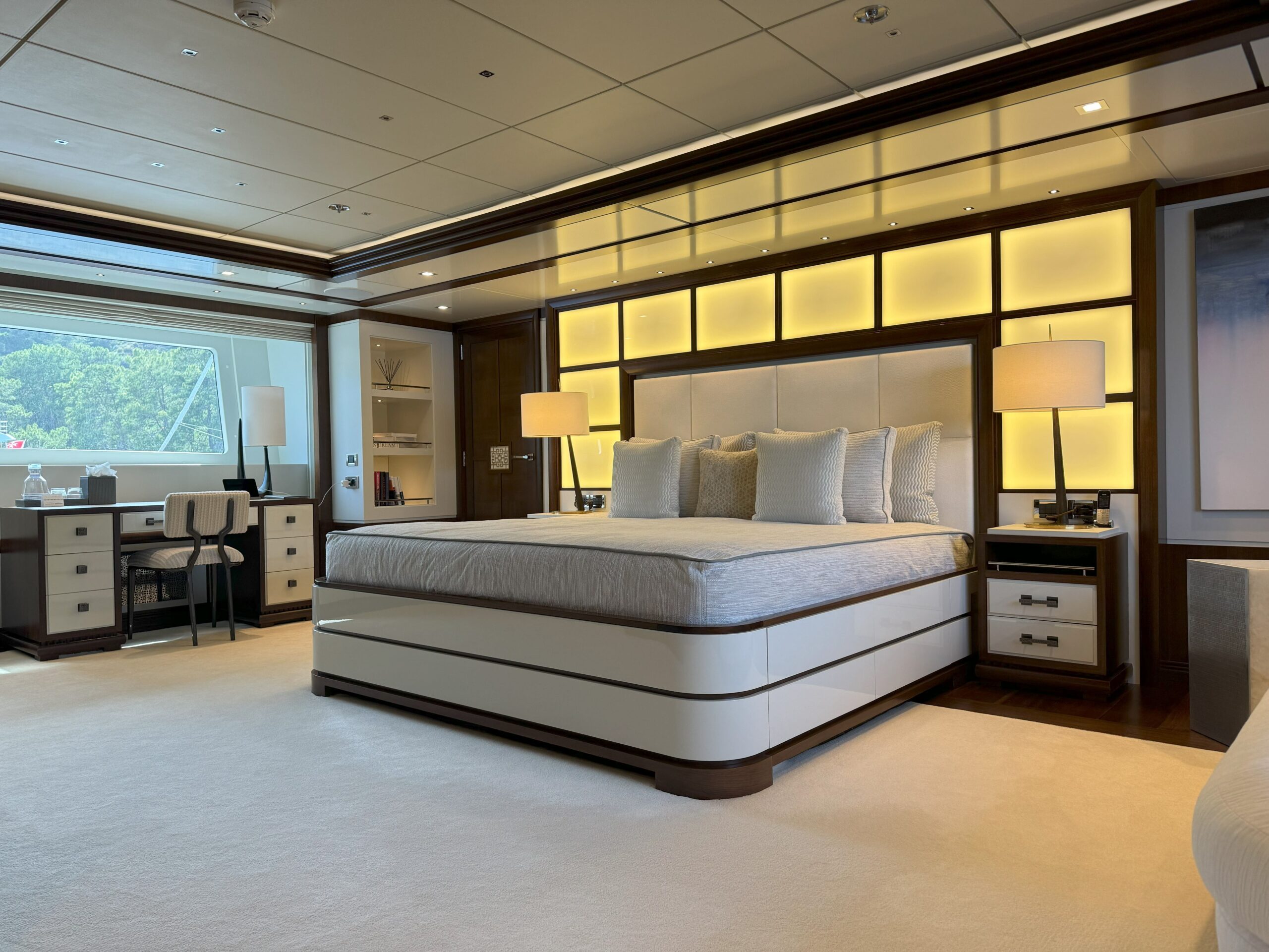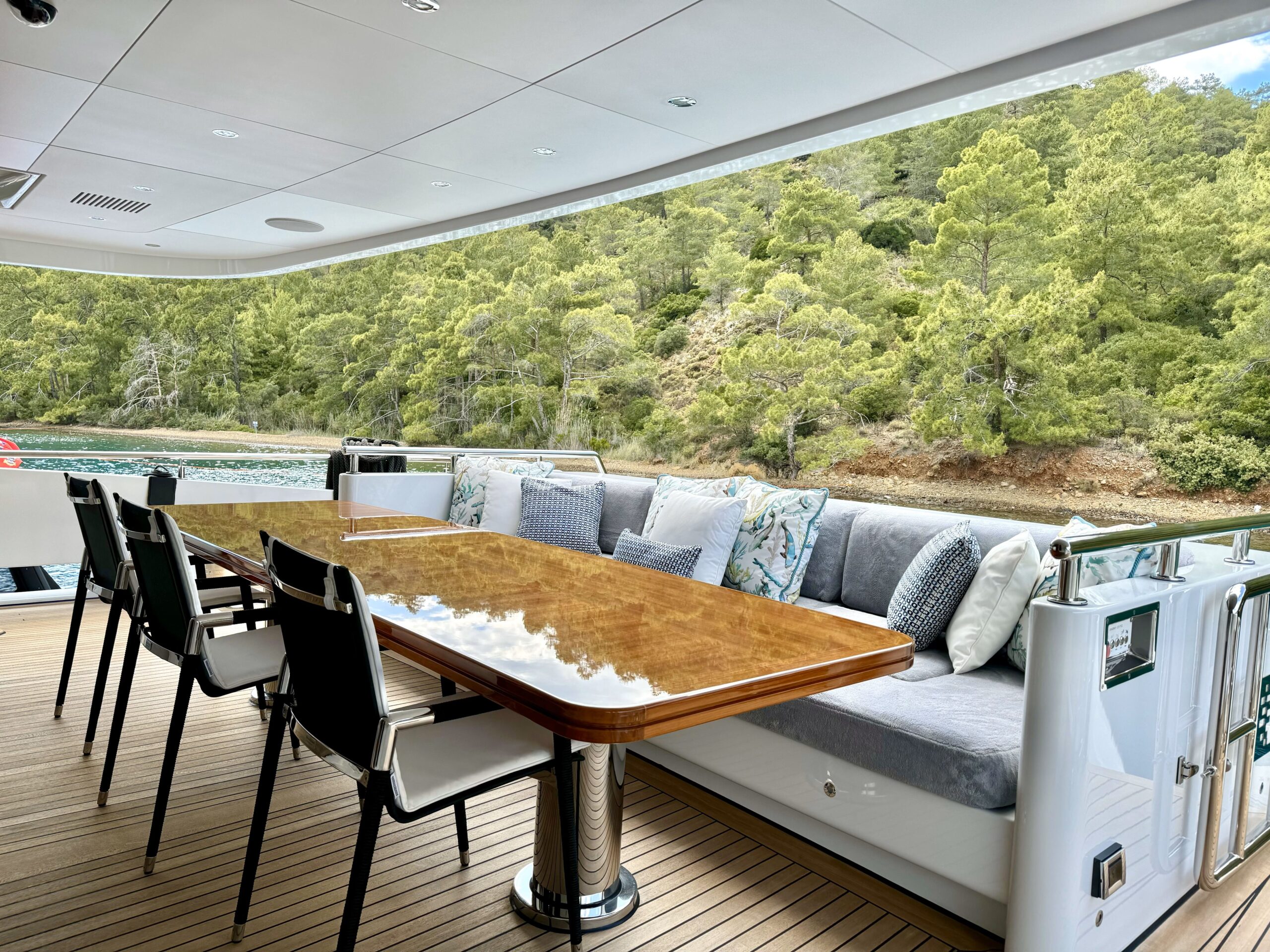 Ideal for dining alfresco, IMMERSIVE’s main deck aft features a teak dining table with seating while stairs lead down to the extended swim platform below. A huge aft terrace can also be found on the upper deck with a dining table plus lounge seating while forward, a private owner’s lounge overlooks the ocean.