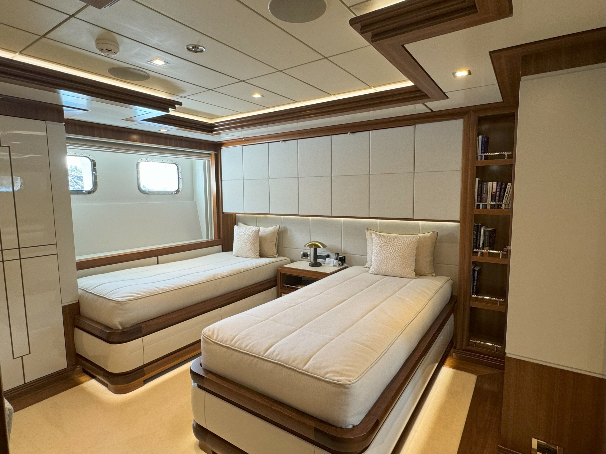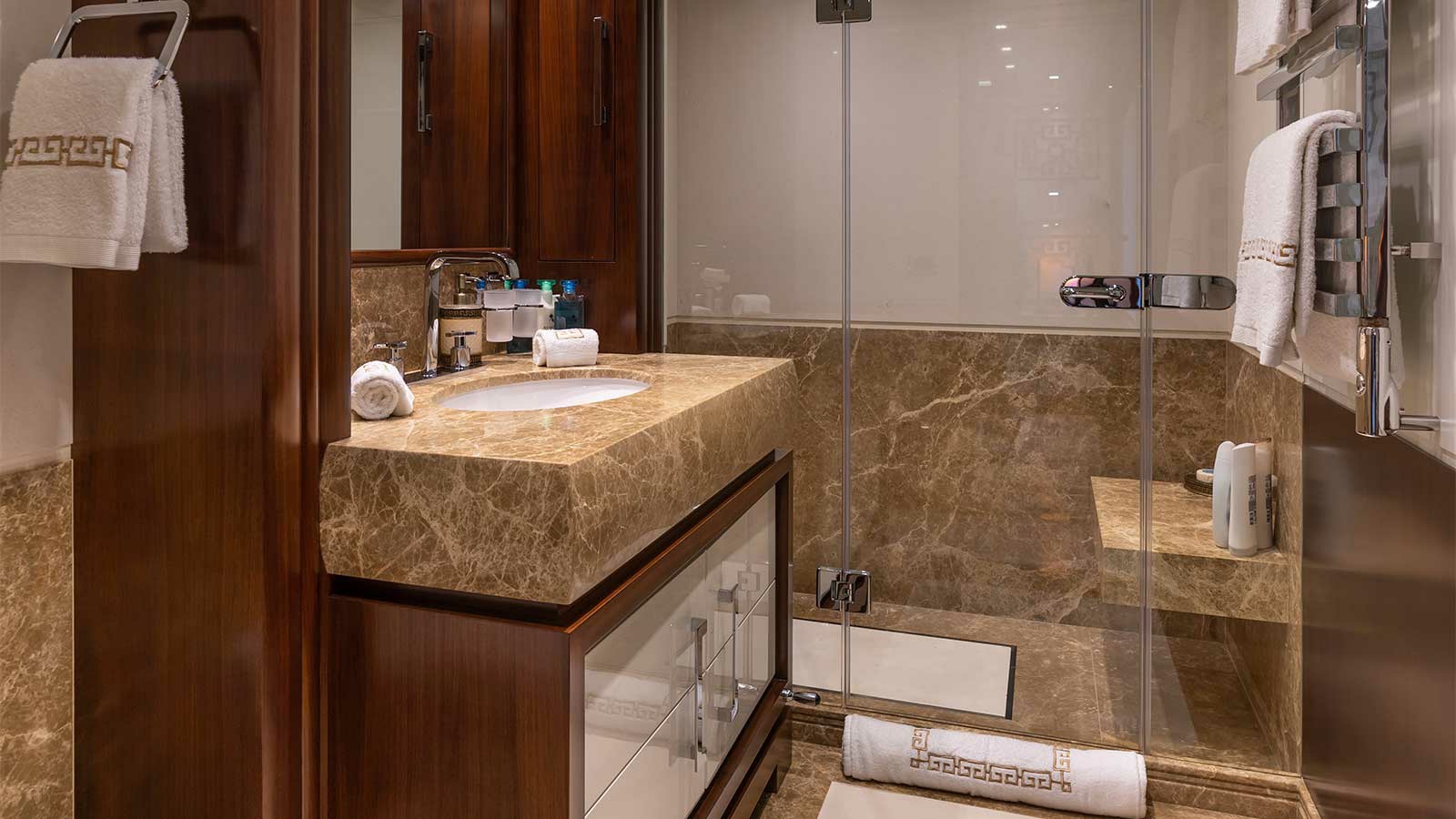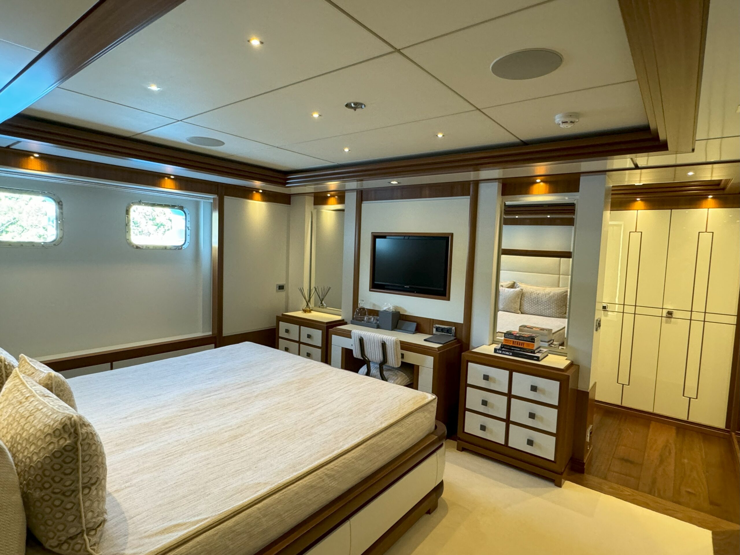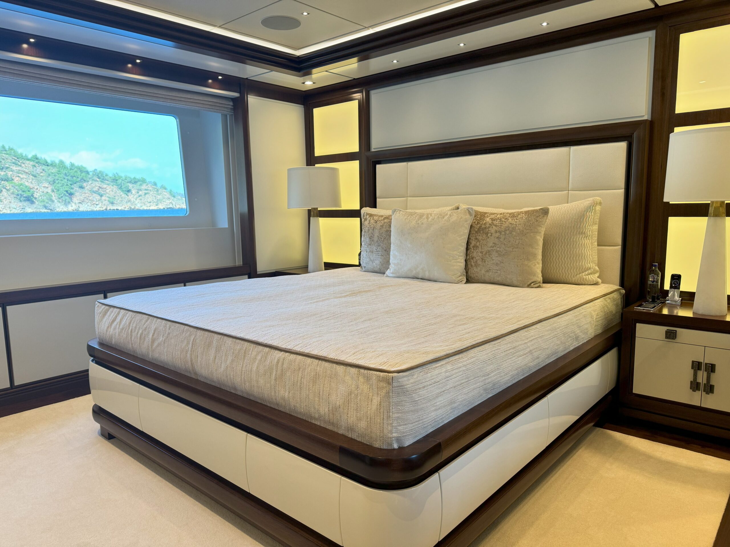 Ideal for dining alfresco, IMMERSIVE’s main deck aft features a teak dining table with seating while stairs lead down to the extended swim platform below. A huge aft terrace can also be found on the upper deck with a dining table plus lounge seating while forward, a private owner’s lounge overlooks the ocean.