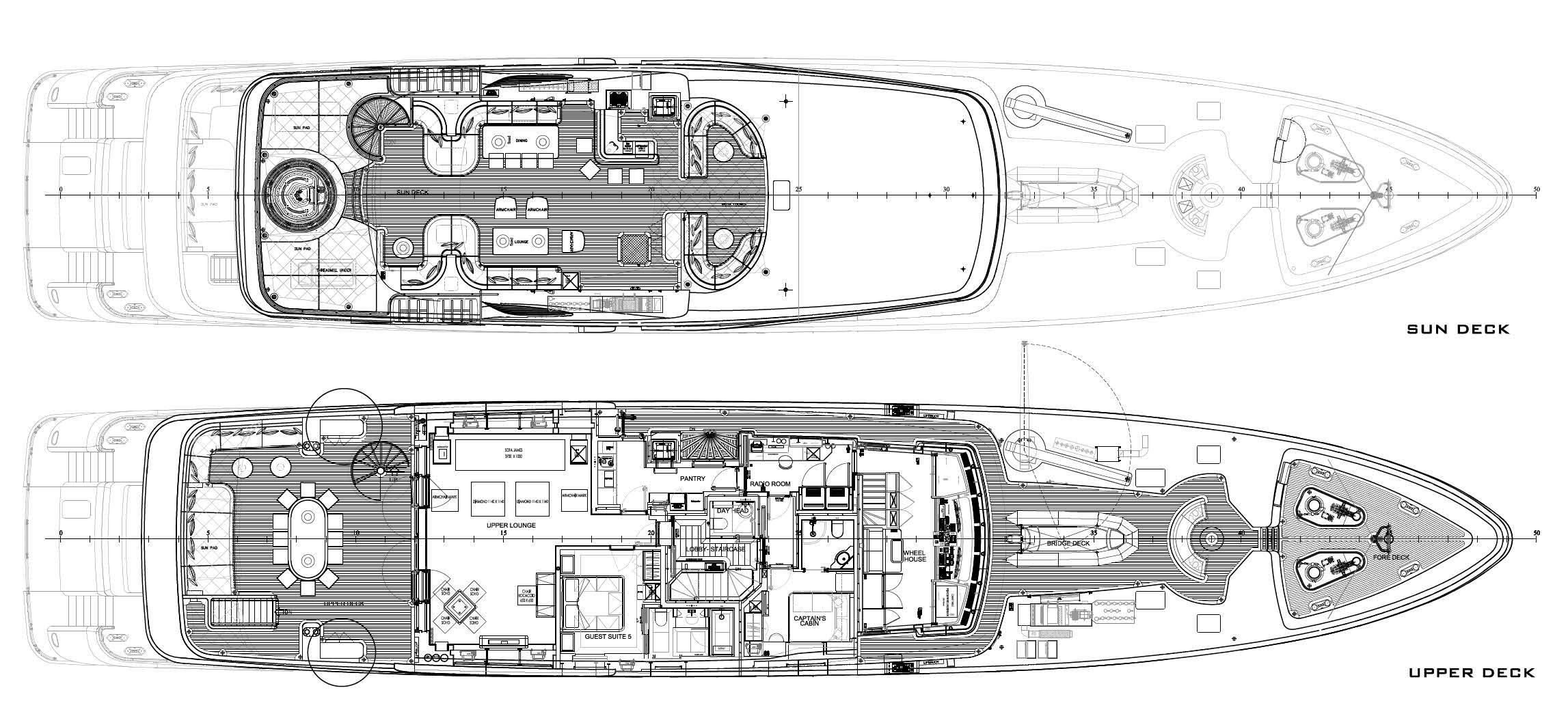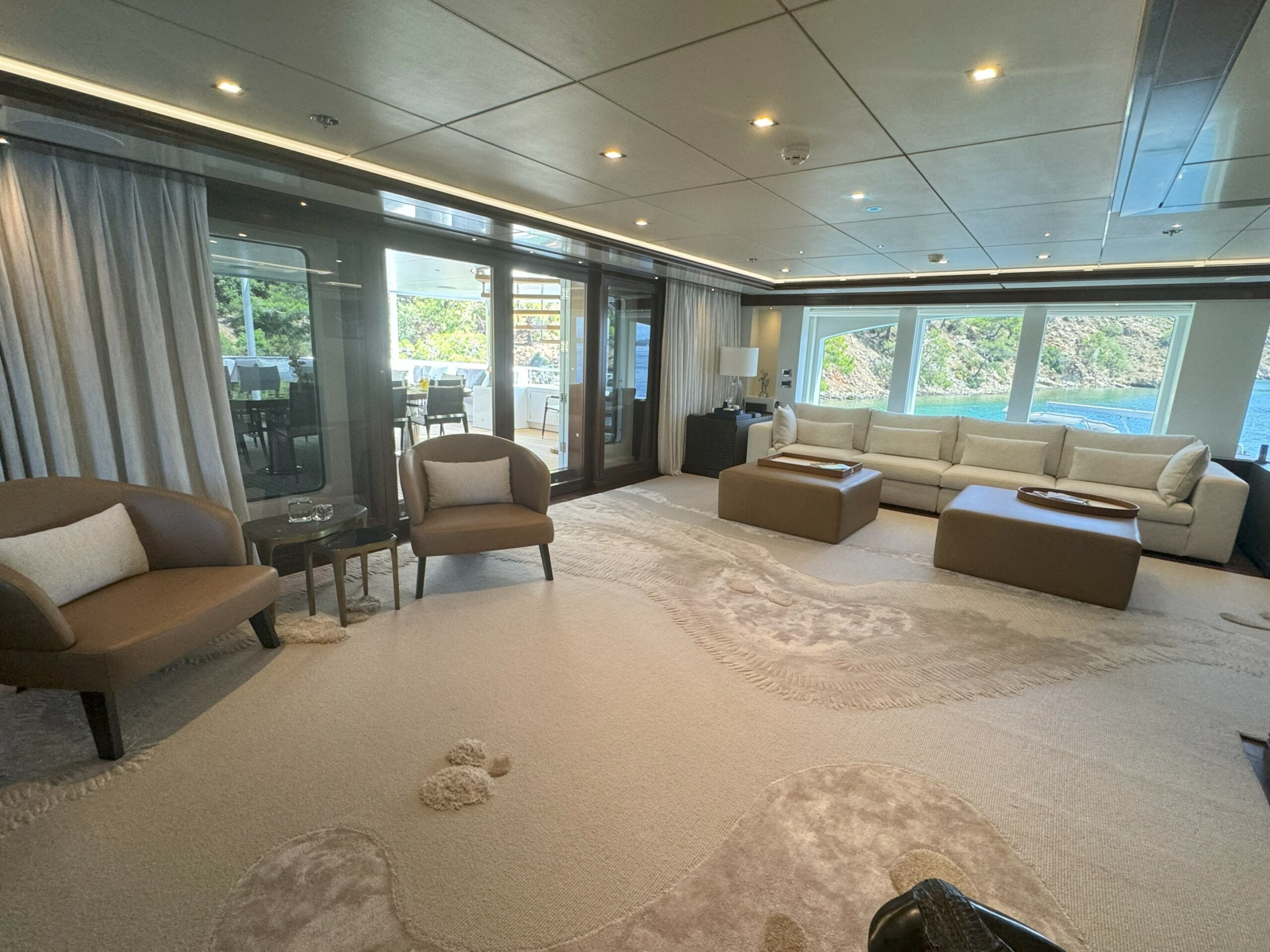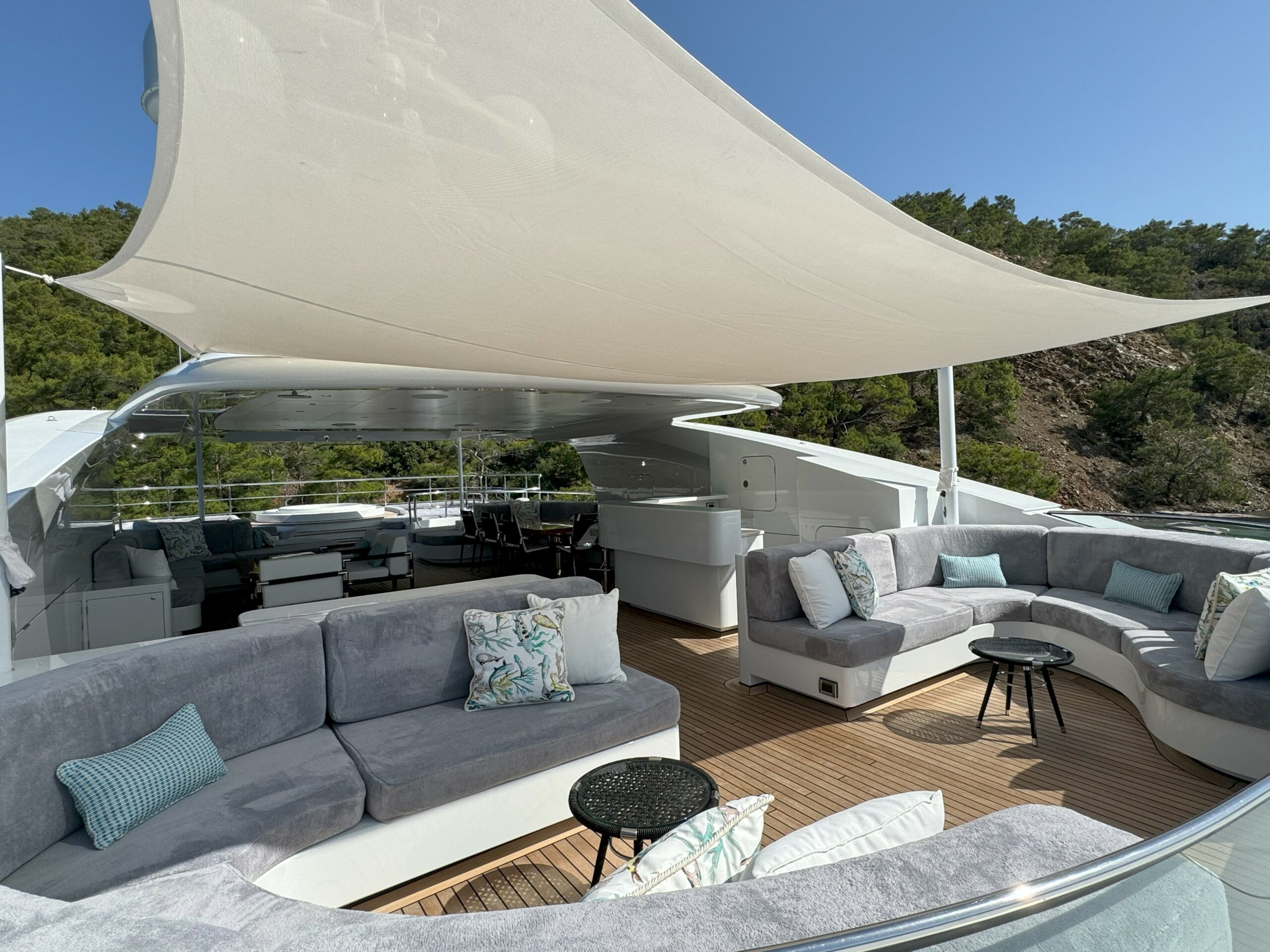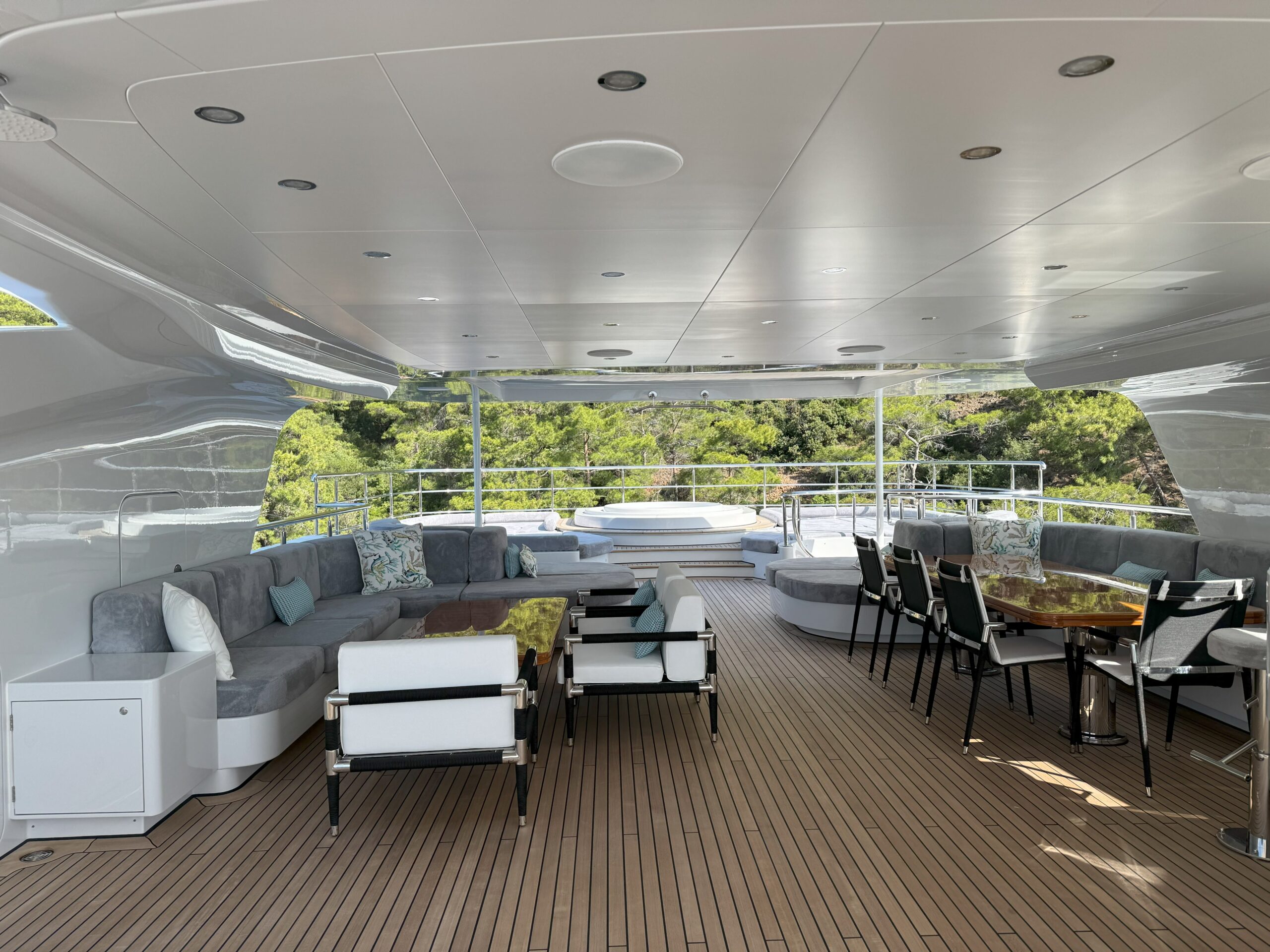 IMMERSIVE’s sun deck is spectacular with a vista seating area forward with wrap around seating and coffee tables on both sides. Further aft to port is a bar with a shaded dinning area aft and a lounging area. The sun deck aft is covered with a hardtop with a sliding sun shade. A jacuzzi is all the way aft in the sun with sun pads both sides.