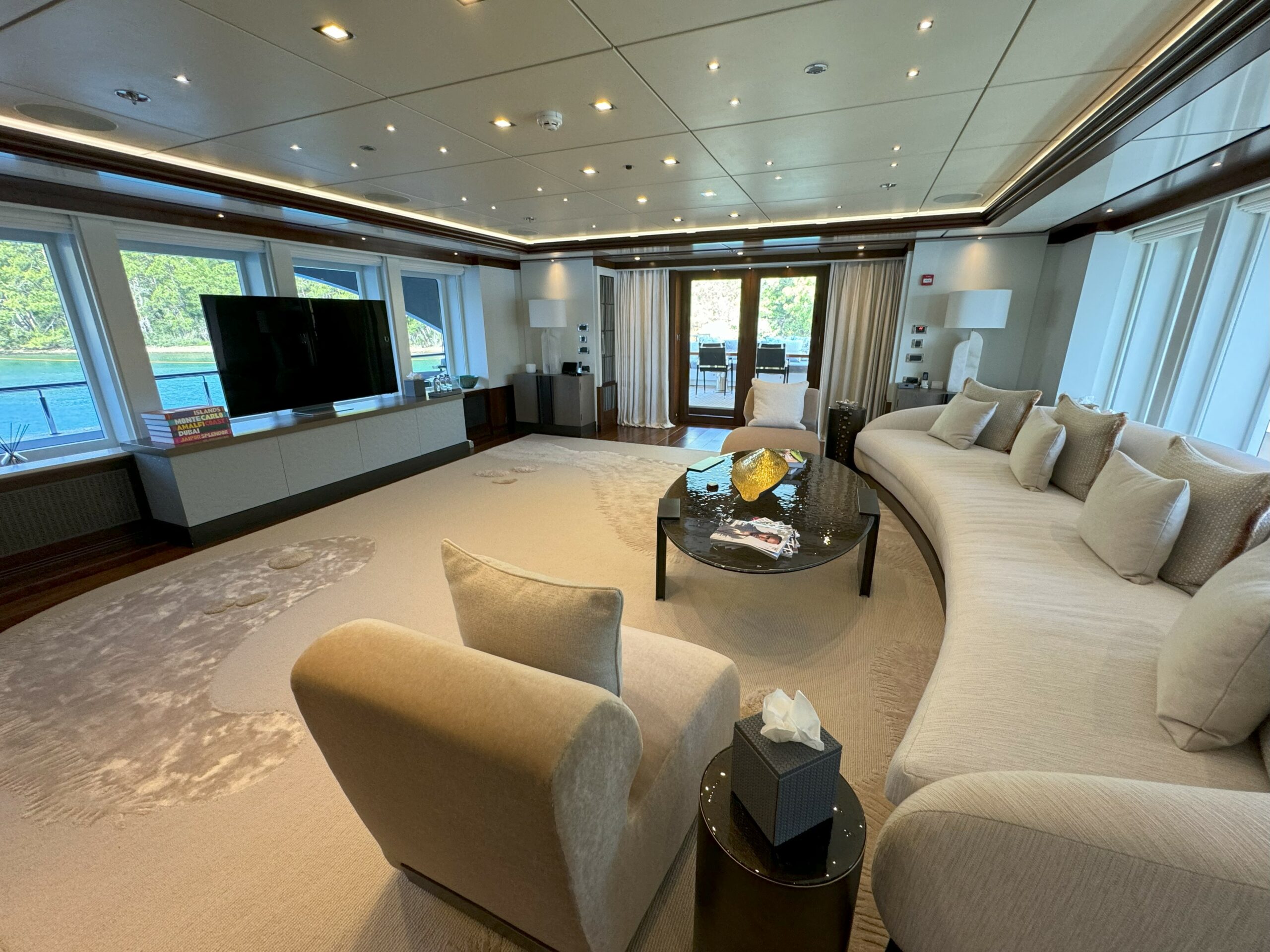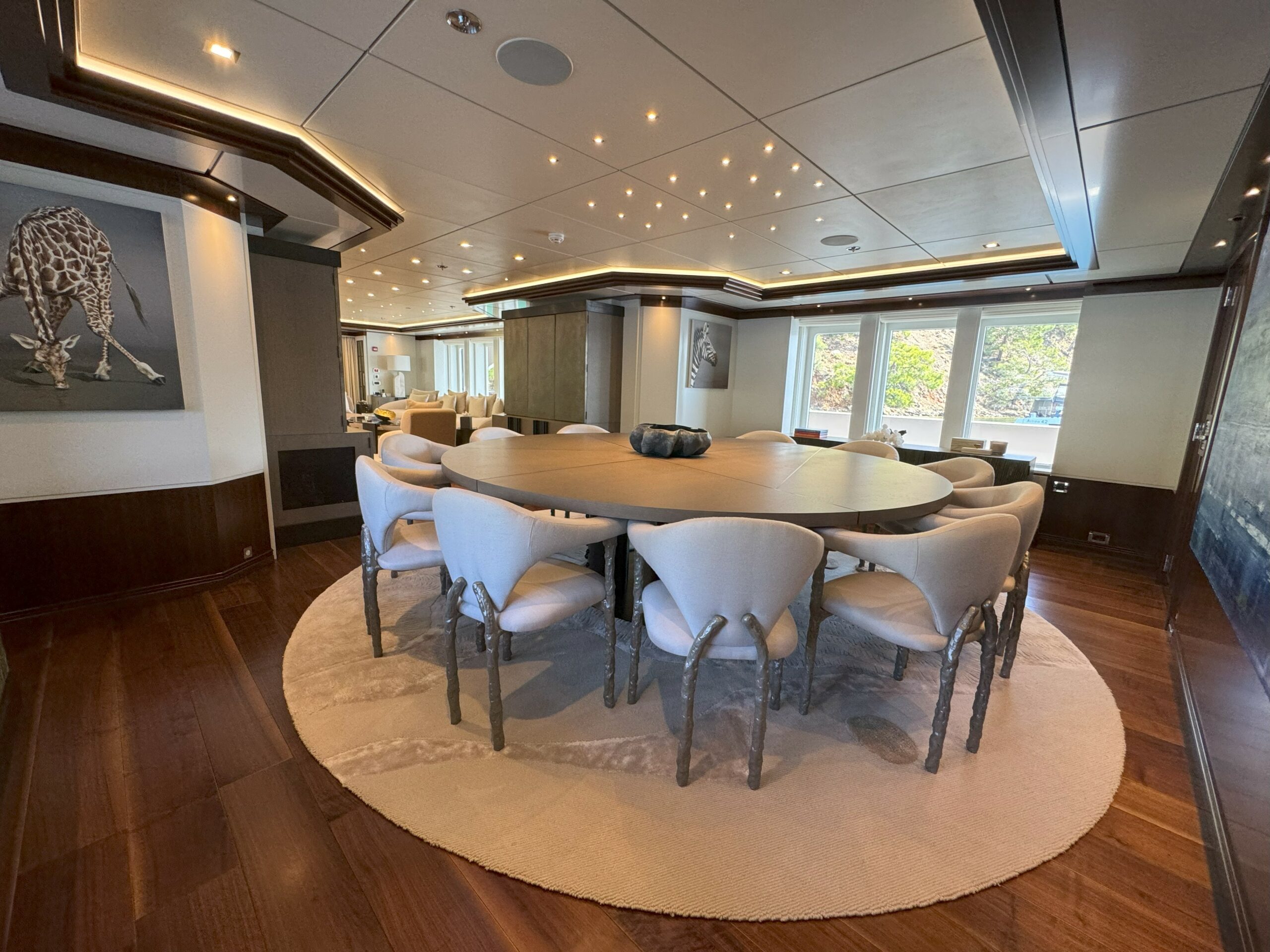 IMMERSIVE’s large full-beam salon can be found on the main deck and features both a comfortable lounge space plus a formal dining area with a round table for fourteen. A neutral colour palette dominates the space providing a perfect backdrop for the ever-changing ocean views from the oversized windows.