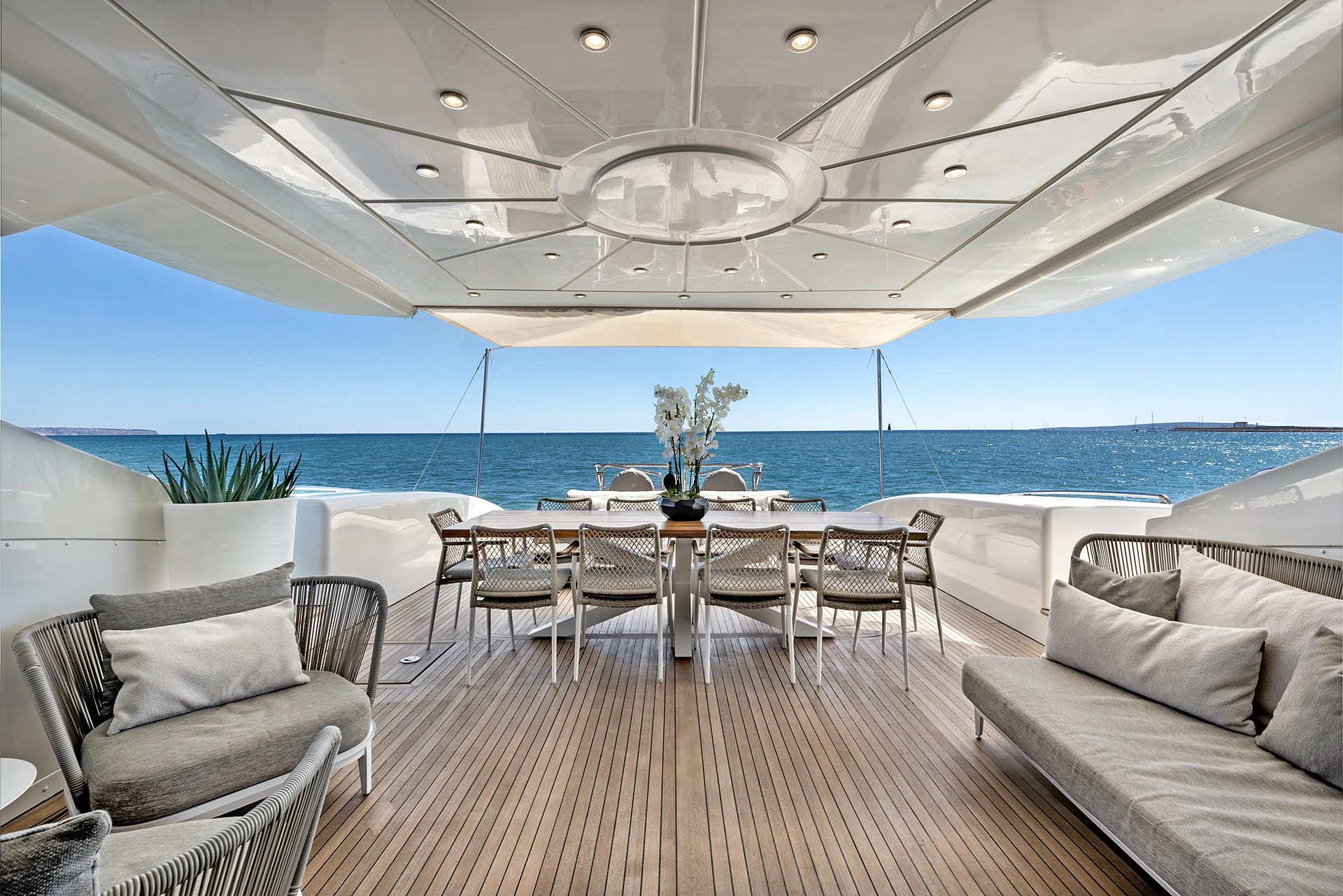 MRS GREY’s aft deck is the ideal spot to enjoy cocktails or an alfresco meal with friends. Spacious and open with built-in seating plus comfortable sunpads, twin staircases lead down from the aft deck to MRS GREY’s large swim platform below.