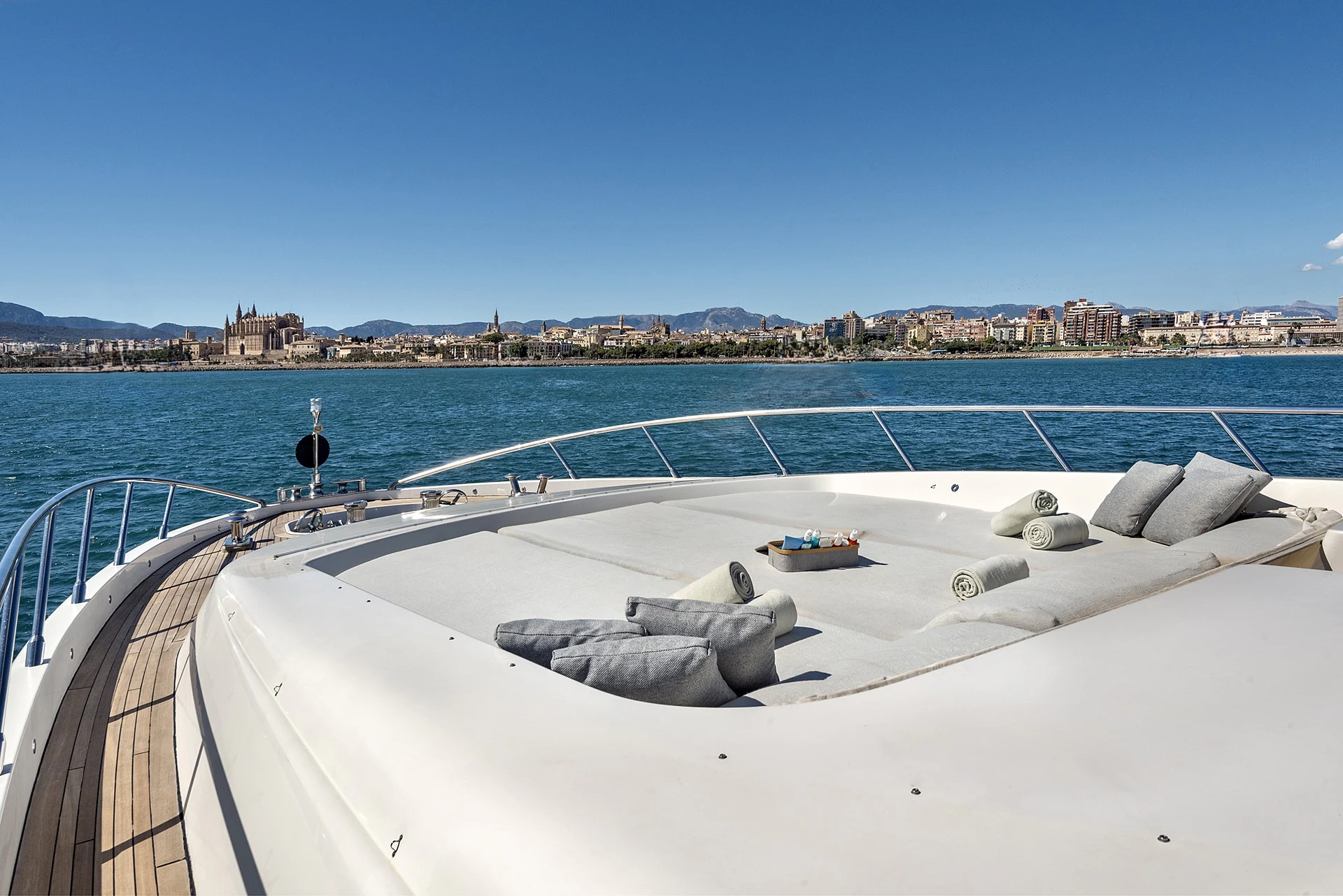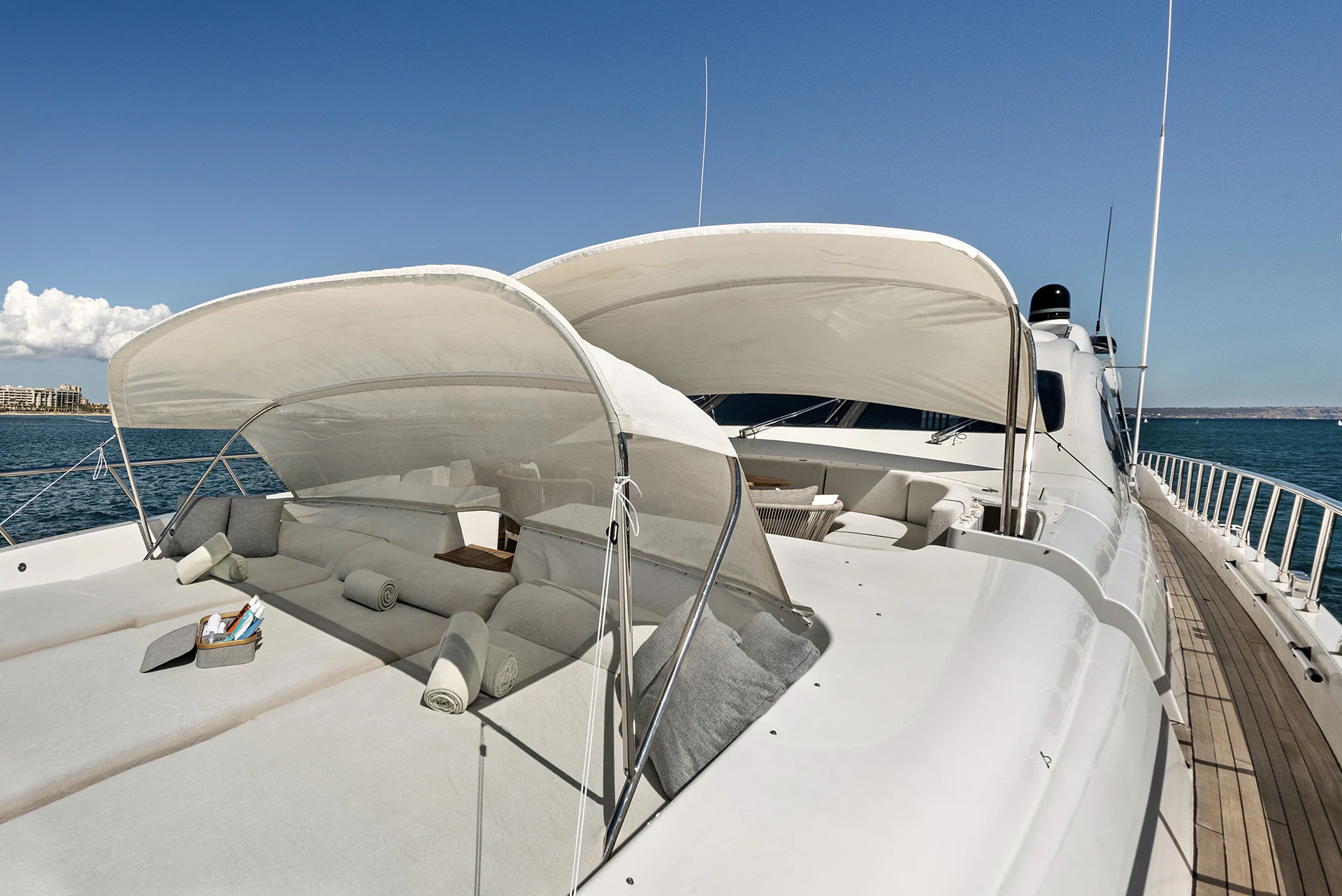 Offering unparalleled views of the ocean, MRS GREY’s large foredeck is set up for entertaining. Enjoy a leisurely lunch at the built-in dining table or top up your tan whilst reclining on the comfortable 6-person sunpad.