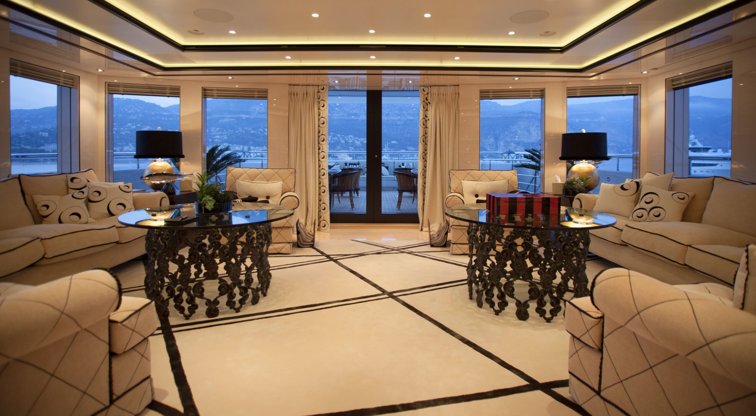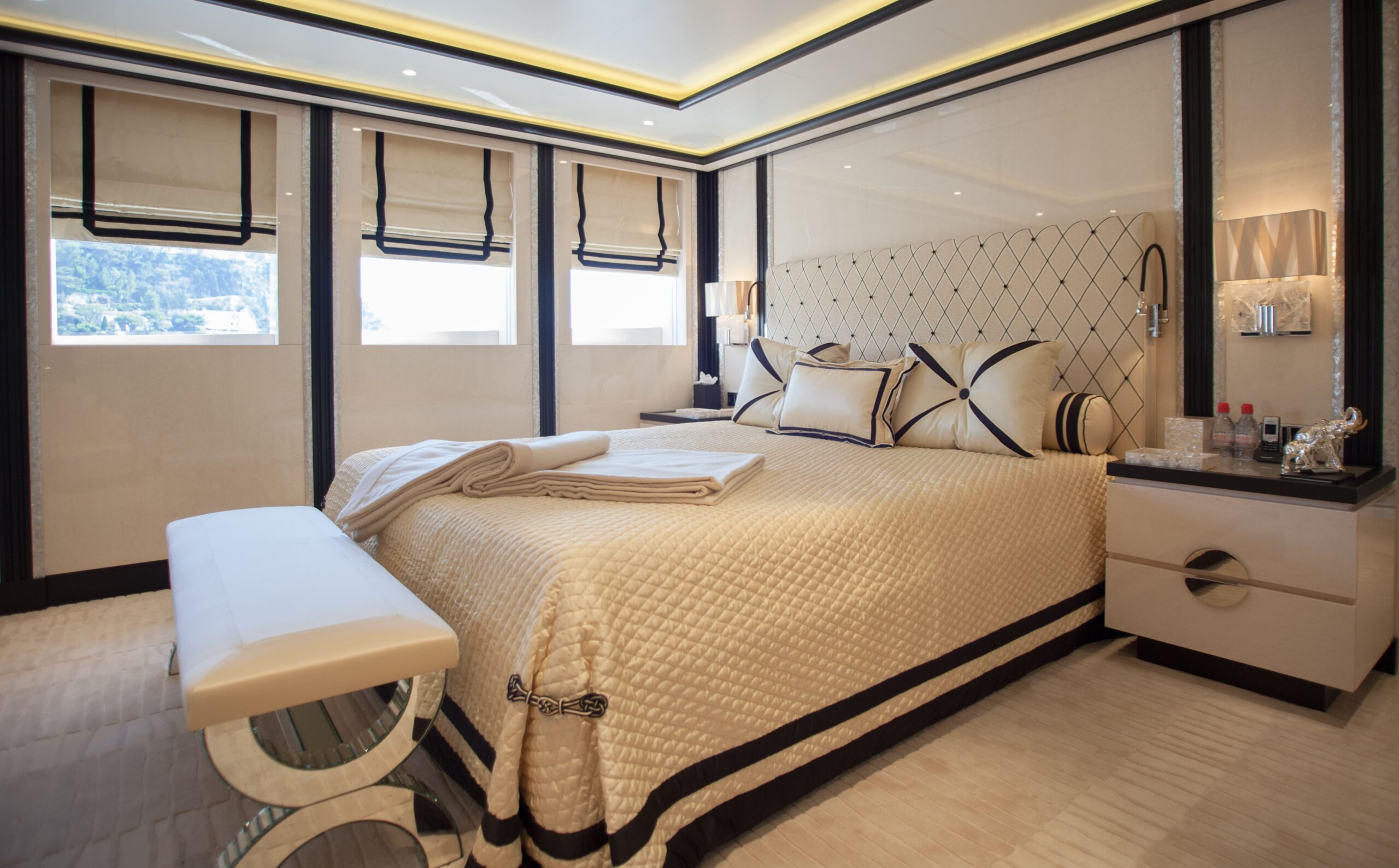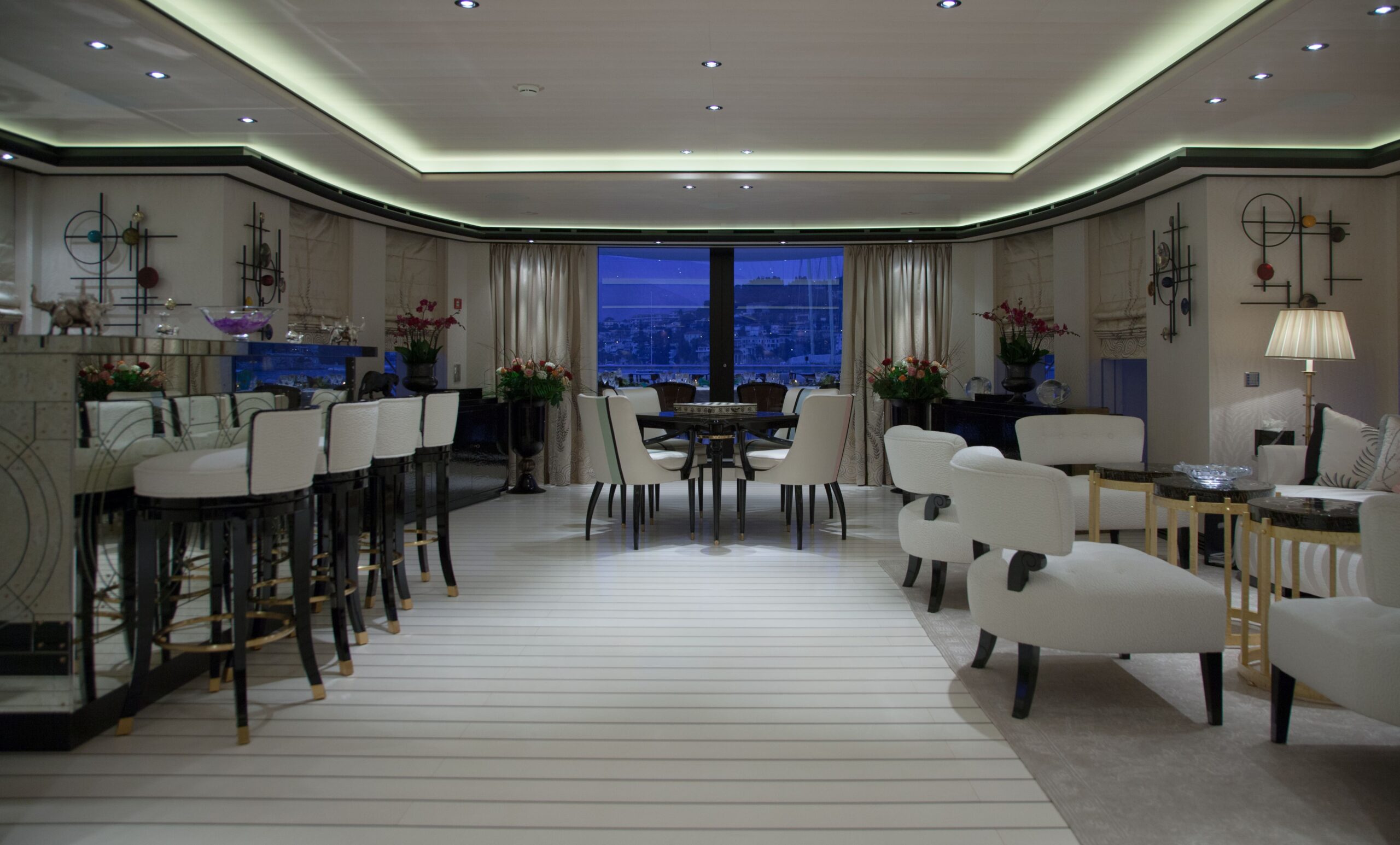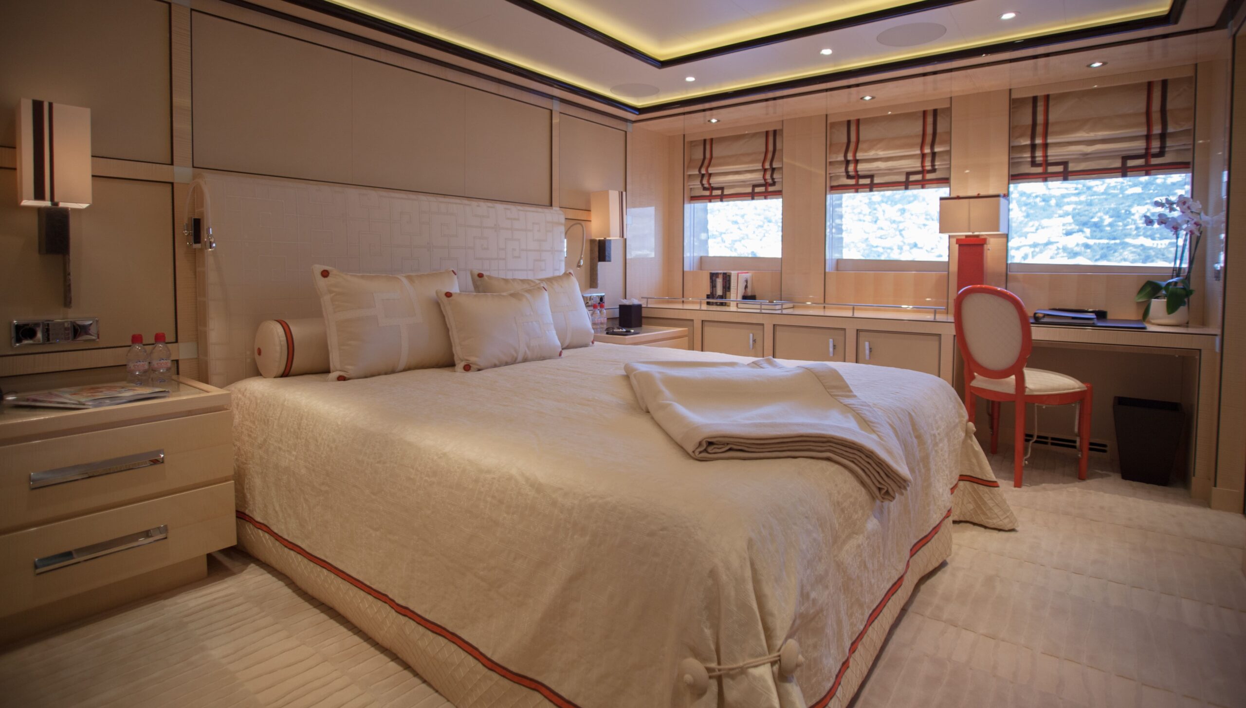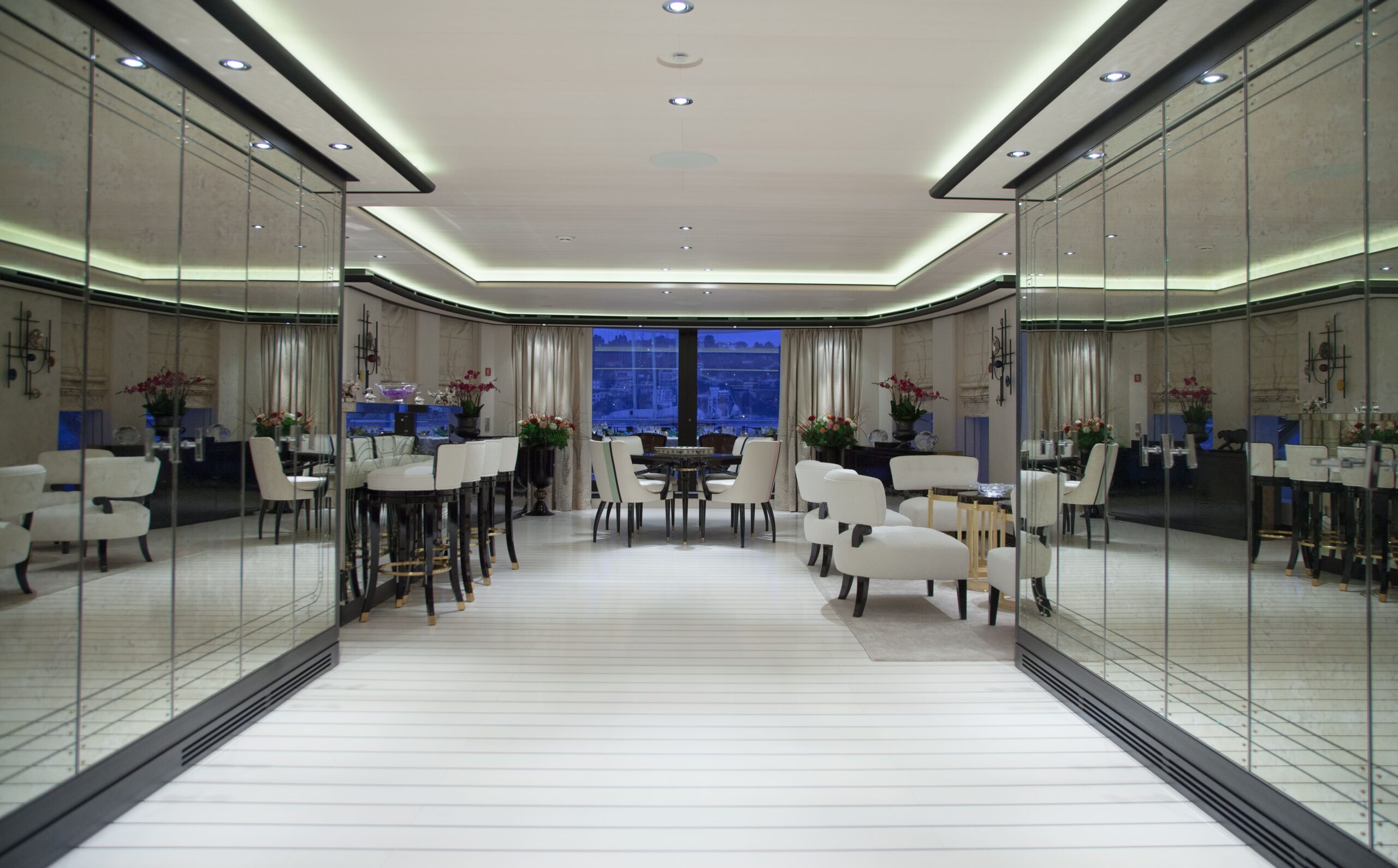 The main salon on the main deck flows seamlessly into an elegant formal dining area that comfortably seats 12 guests. Designed by Alberto Pinto, the interiors showcase a refined monochrome palette with cream tones, mirrored finishes, and custom furnishings that strike a balance between contemporary sophistication and timeless style. Expansive windows and twin sliding glass doors flood the space with natural light, accentuating curated artworks and soft textures throughout.