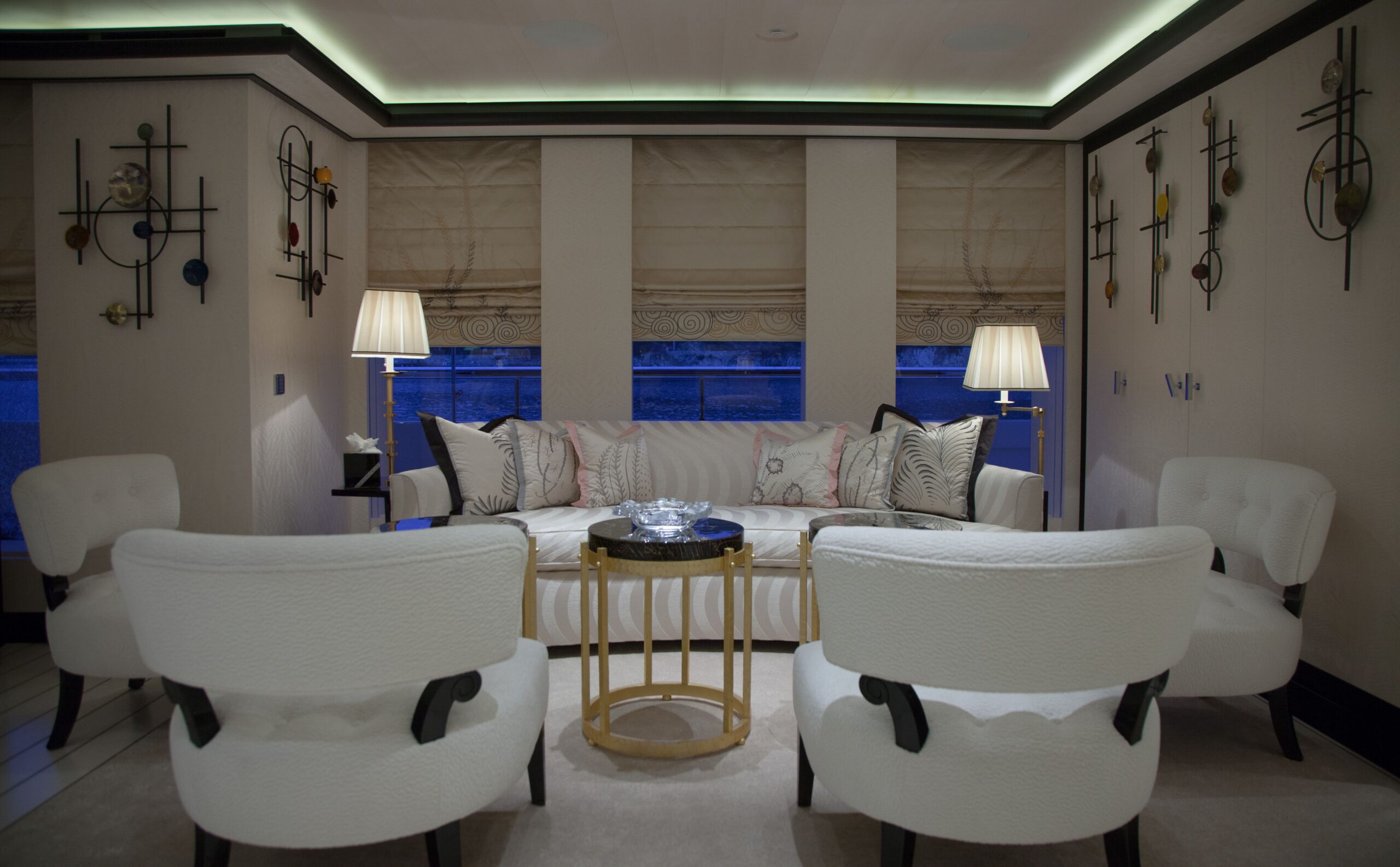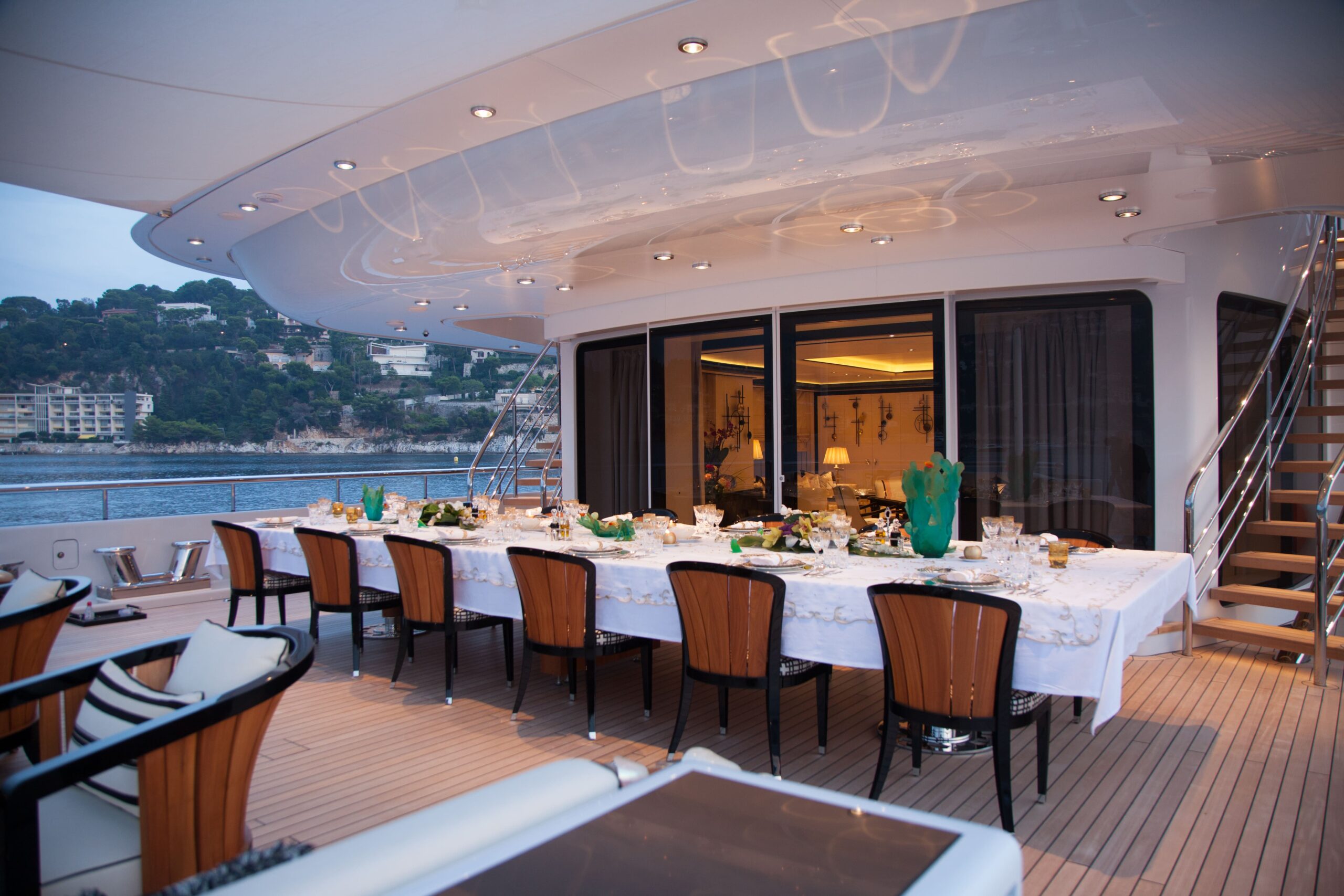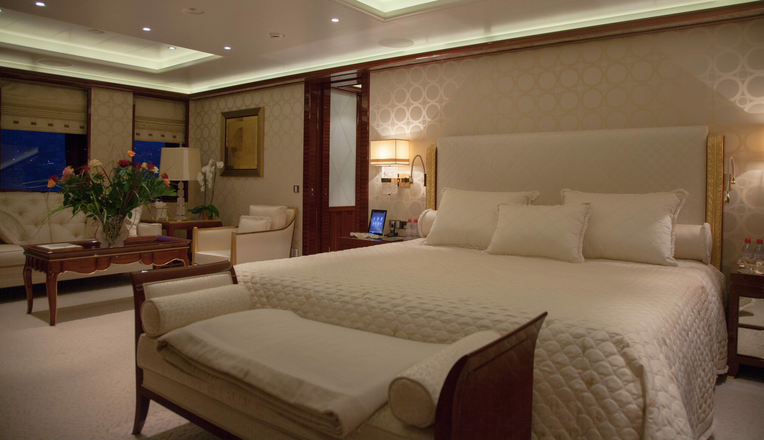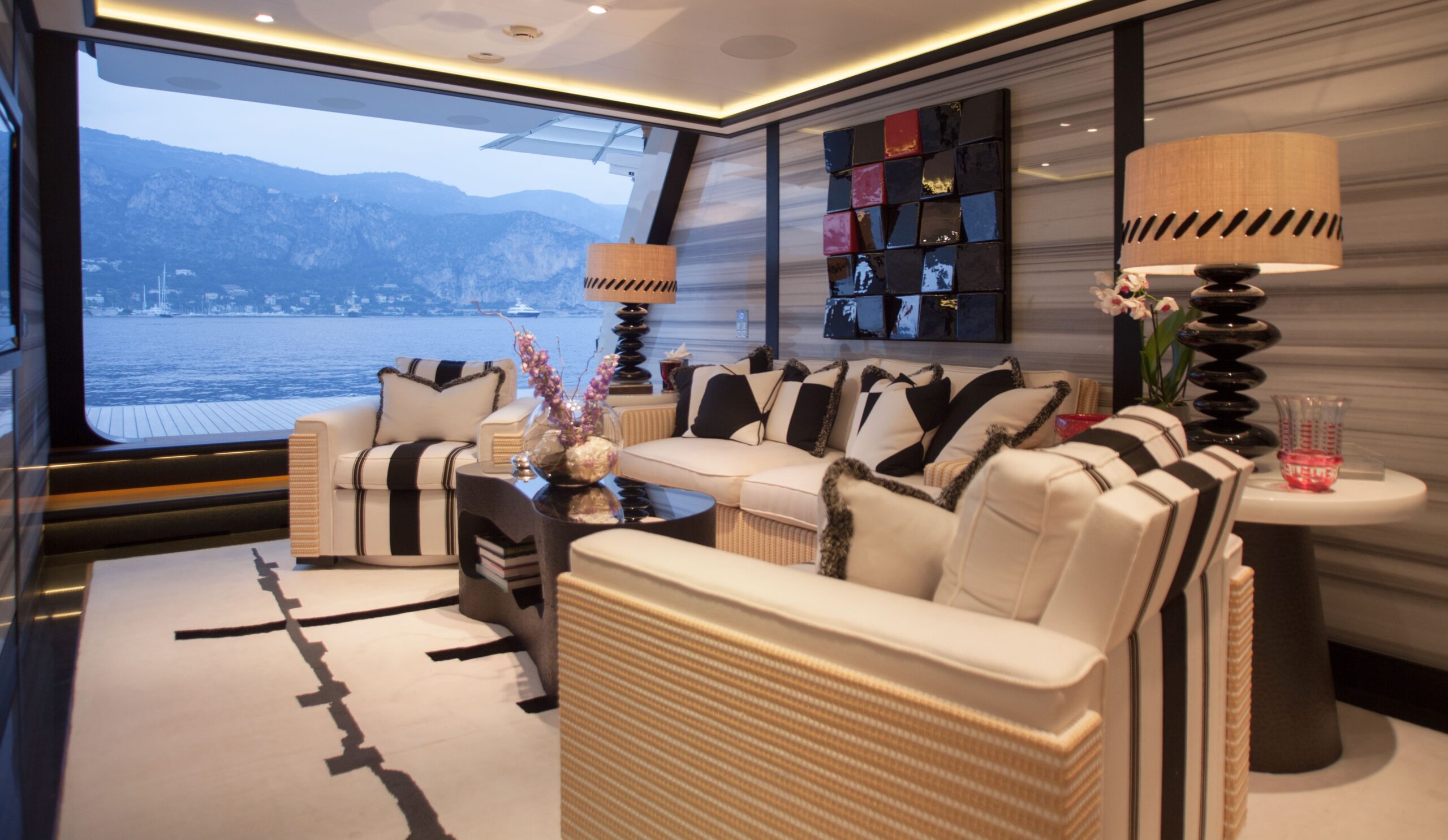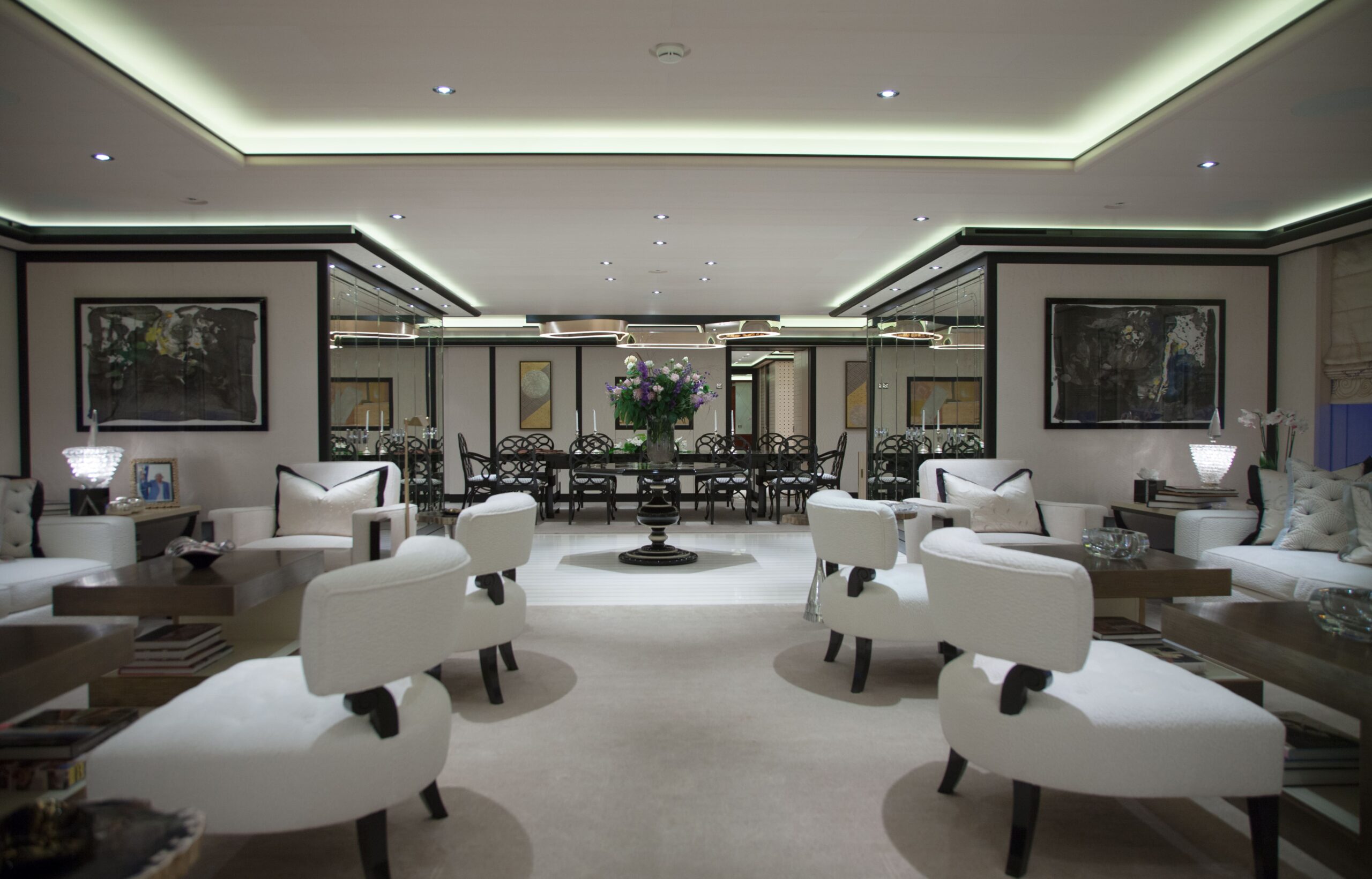 The main salon on the main deck flows seamlessly into an elegant formal dining area that comfortably seats 12 guests. Designed by Alberto Pinto, the interiors showcase a refined monochrome palette with cream tones, mirrored finishes, and custom furnishings that strike a balance between contemporary sophistication and timeless style. Expansive windows and twin sliding glass doors flood the space with natural light, accentuating curated artworks and soft textures throughout.