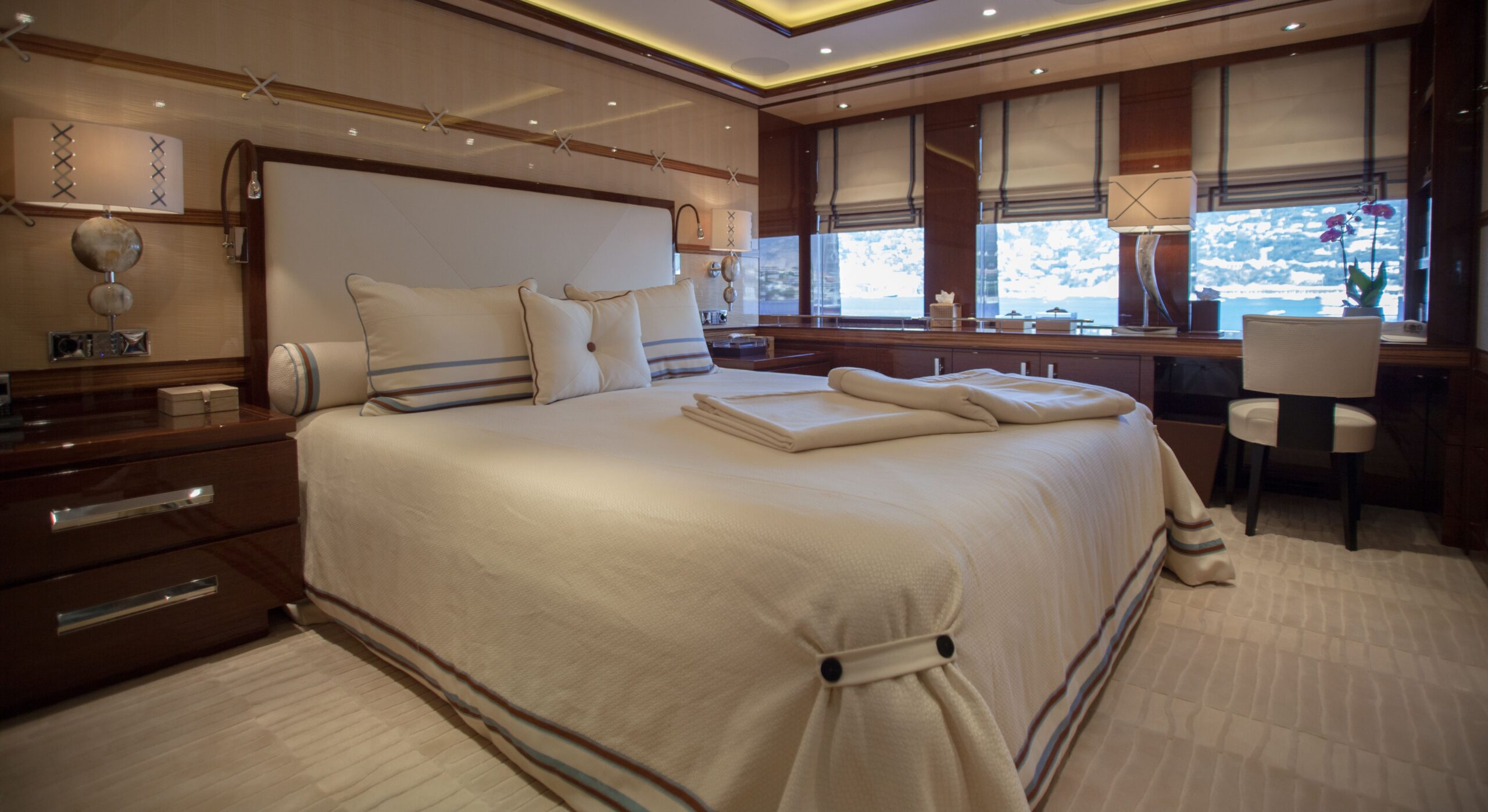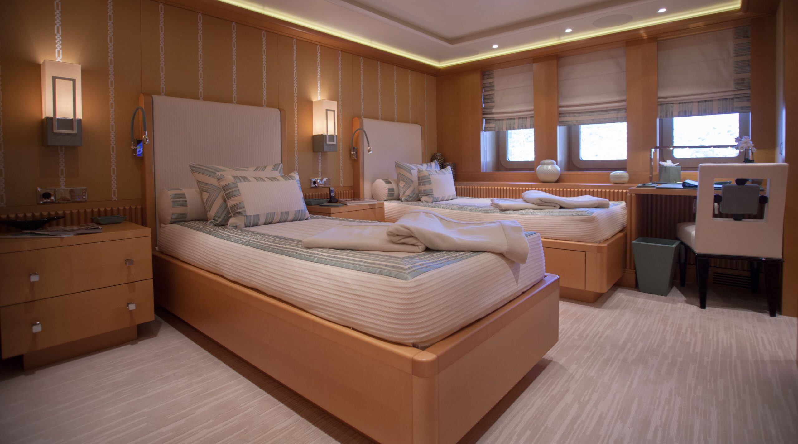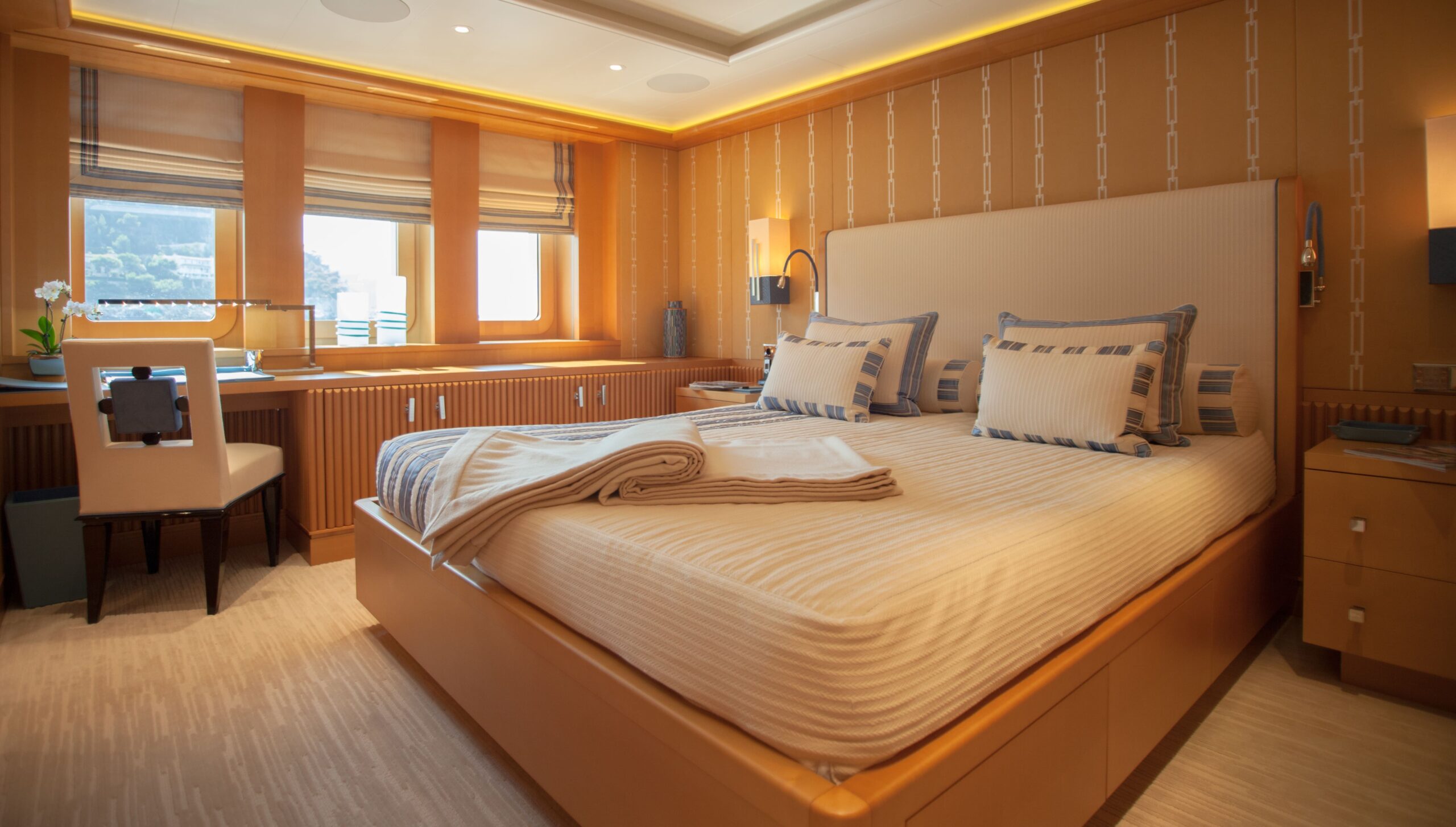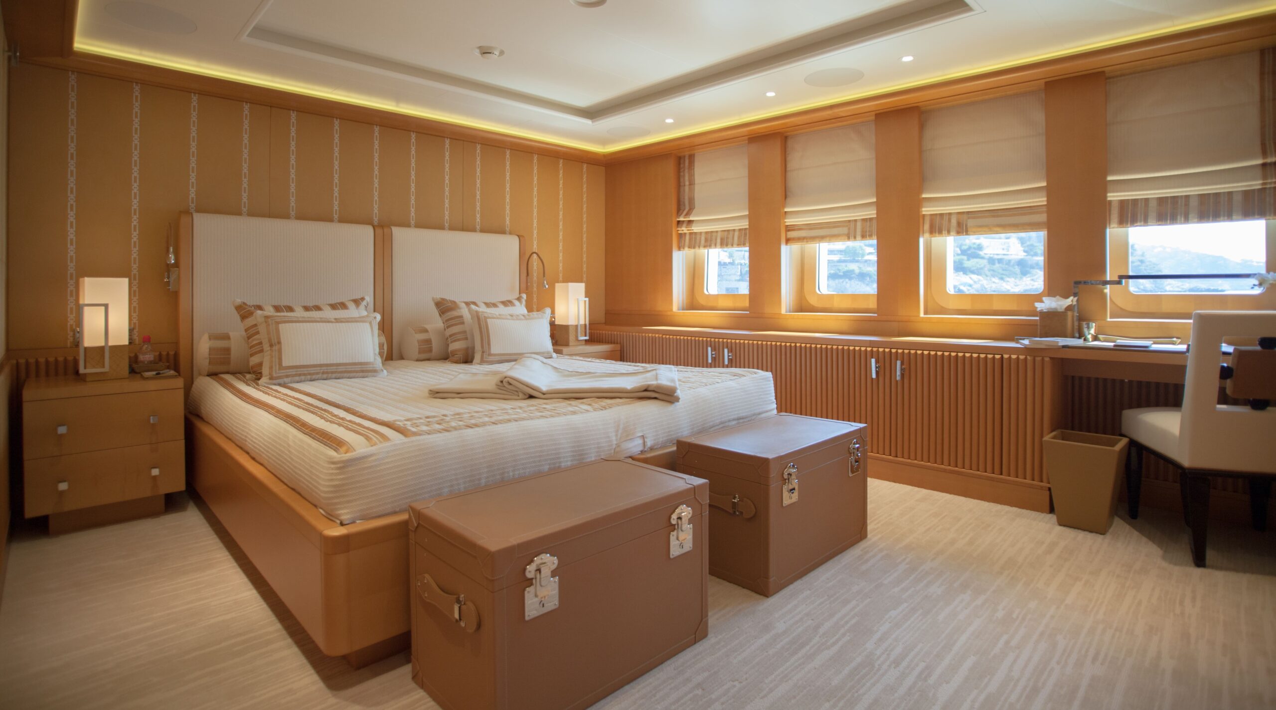 Three VIP cabins are situated on the bridge deck, each featuring expansive windows, luxurious en suite bathrooms with bespoke marble finishes, and a timeless interior palette of warm woods and patterned finishes that enhance the abundance of natural light and views.