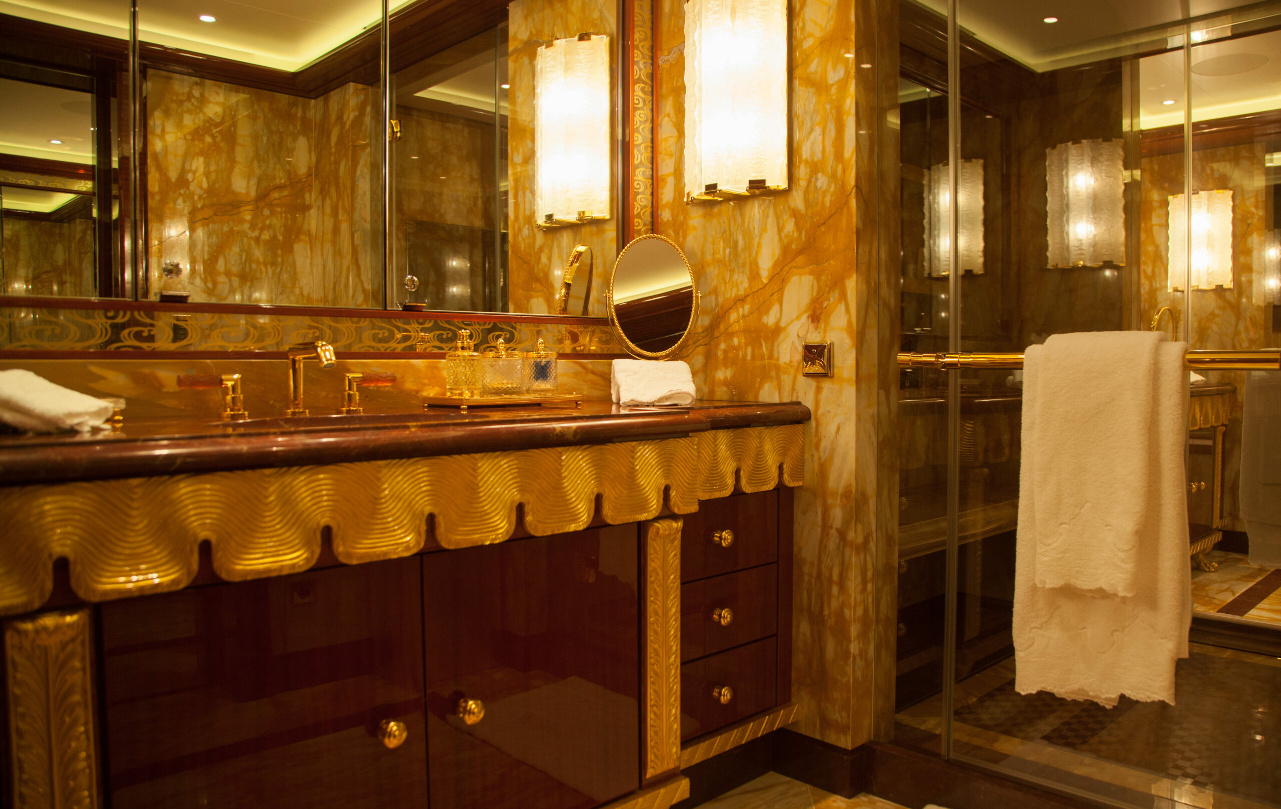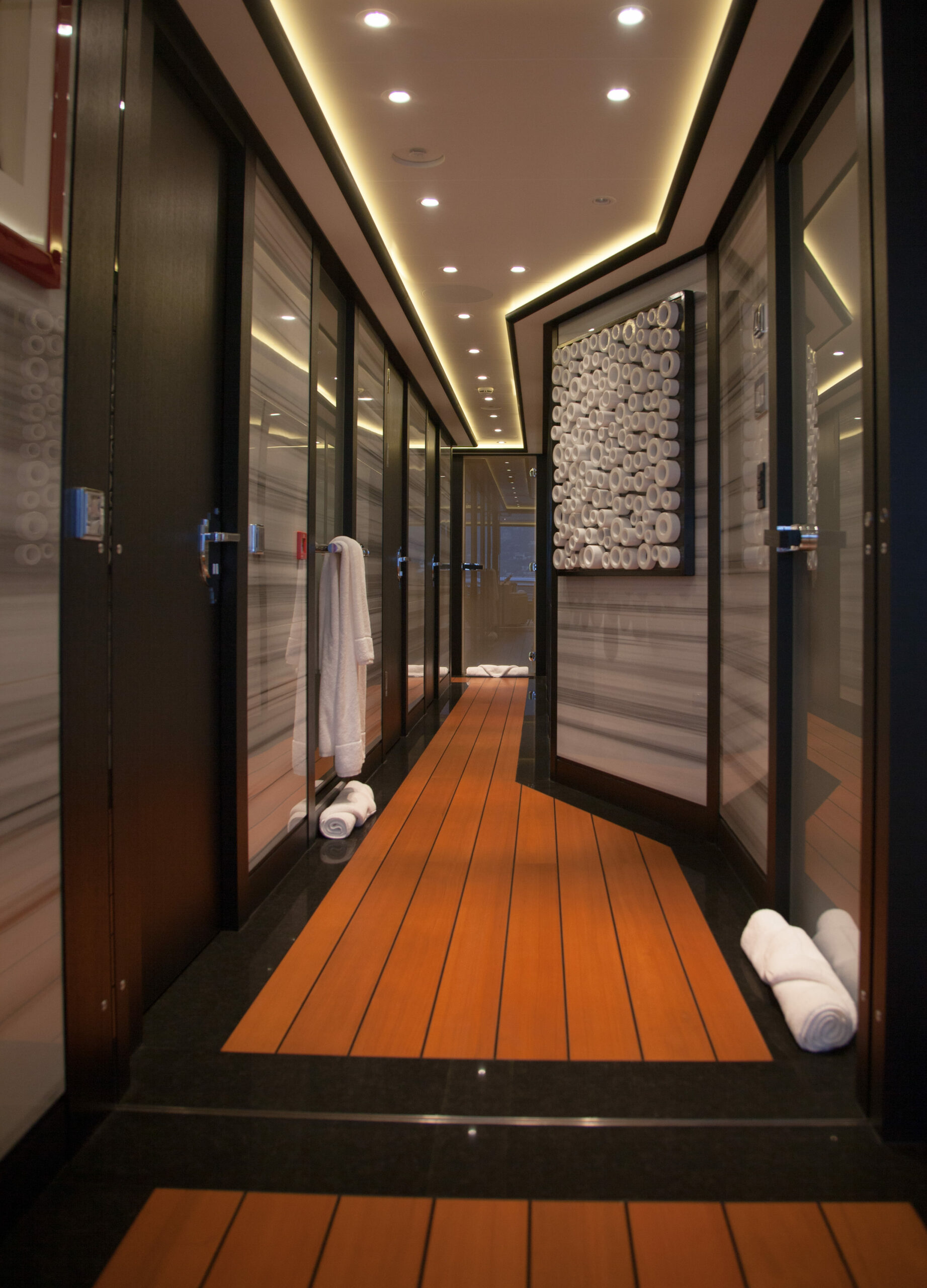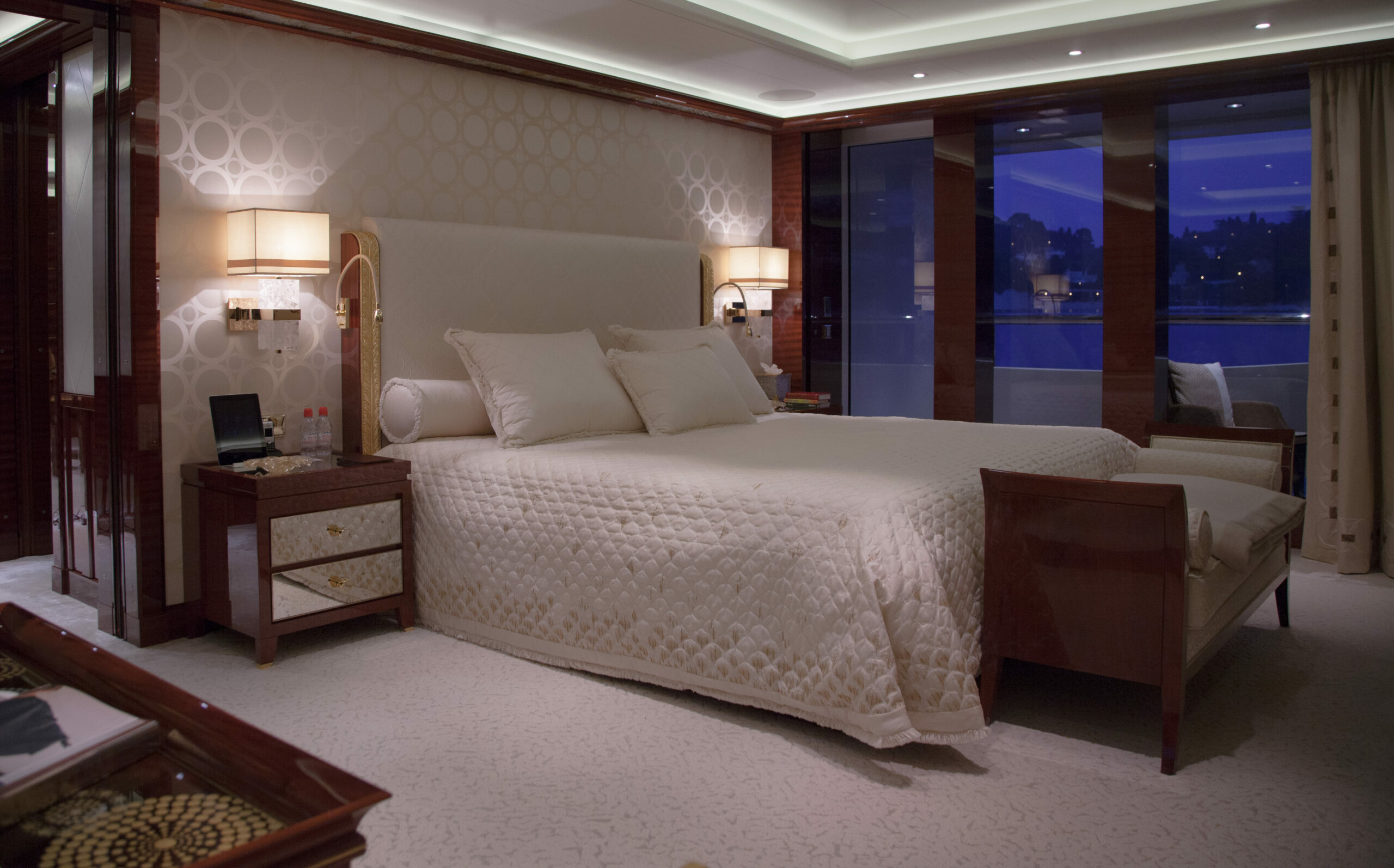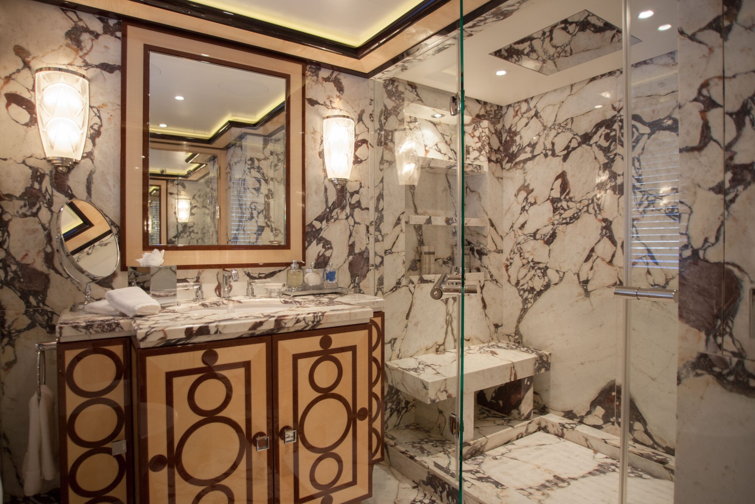 Three VIP cabins are situated on the bridge deck, each featuring expansive windows, luxurious en suite bathrooms with bespoke marble finishes, and a timeless interior palette of warm woods and patterned finishes that enhance the abundance of natural light and views.