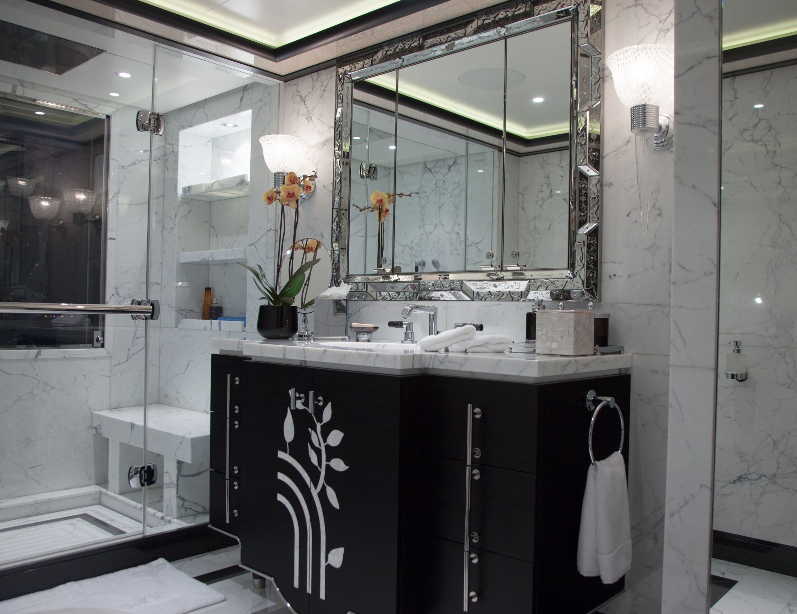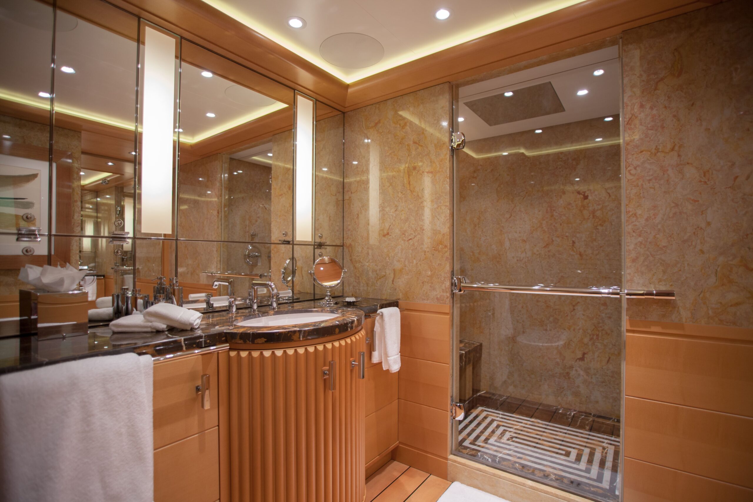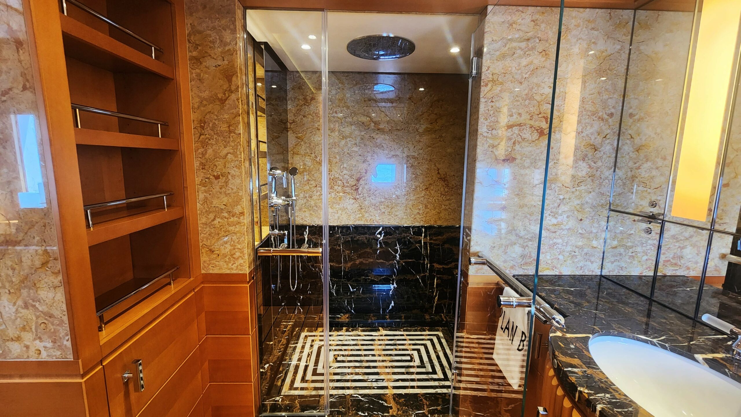 PLAN B accommodates up to 12 guests across eight beautifully appointed suites. The spacious master suite, located on the main deck, offers seclusion and was designed as a sanctuary of elegance and calm. A hallmark of the suite’s thoughtful design is its his-and-hers dressing rooms, a spacious ensuite bathroom with intricate marble inlays, and a private balcony — the ideal setting for breakfast with a sea breeze or a quiet moment away from the main guest areas. A separate owner’s office ensures that business or personal work can be handled discreetly and comfortably while cruising.