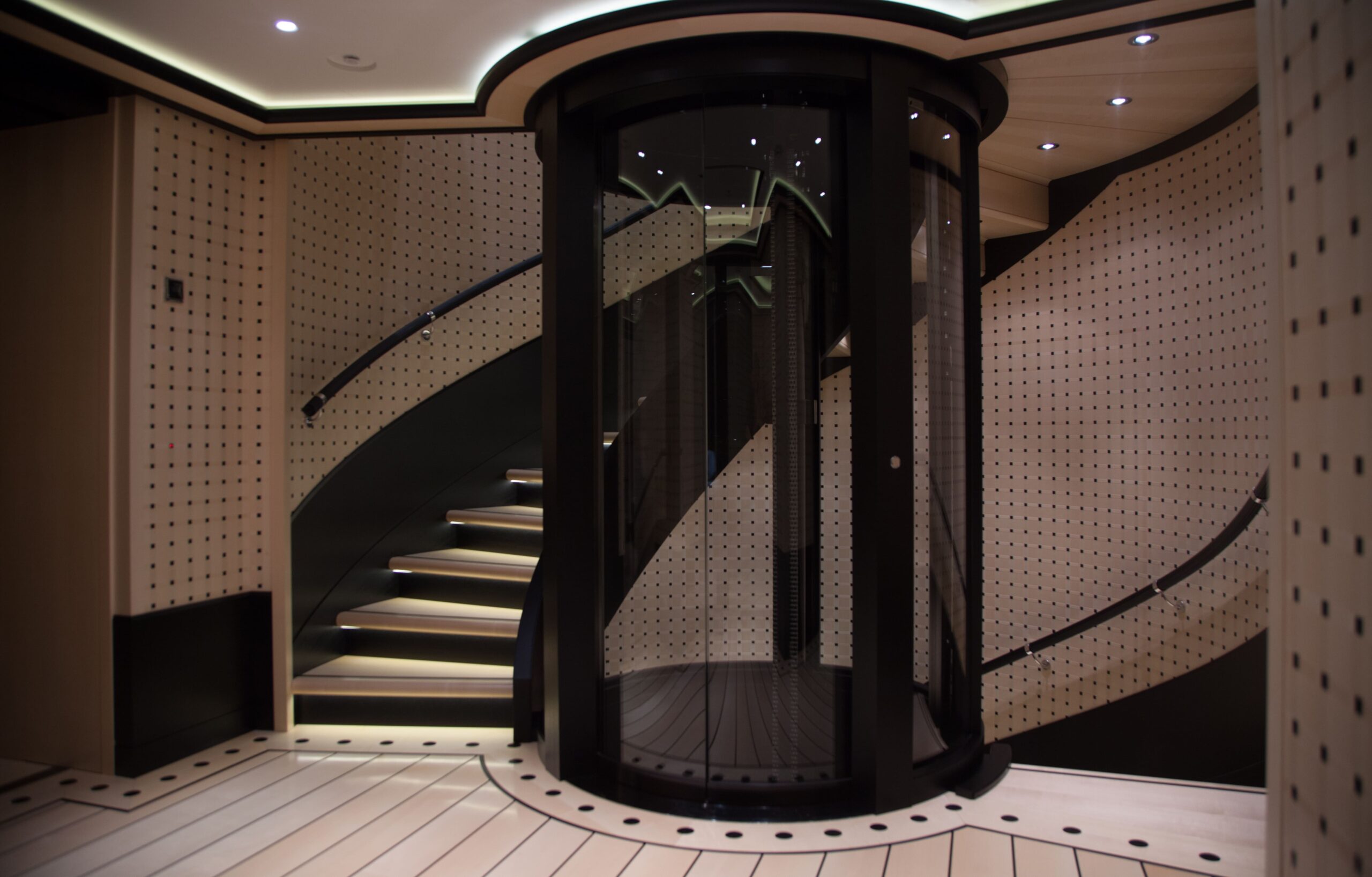 An internal elevator connects the lower, main, and bridge decks, ensuring easy movement between key guest areas on board.
