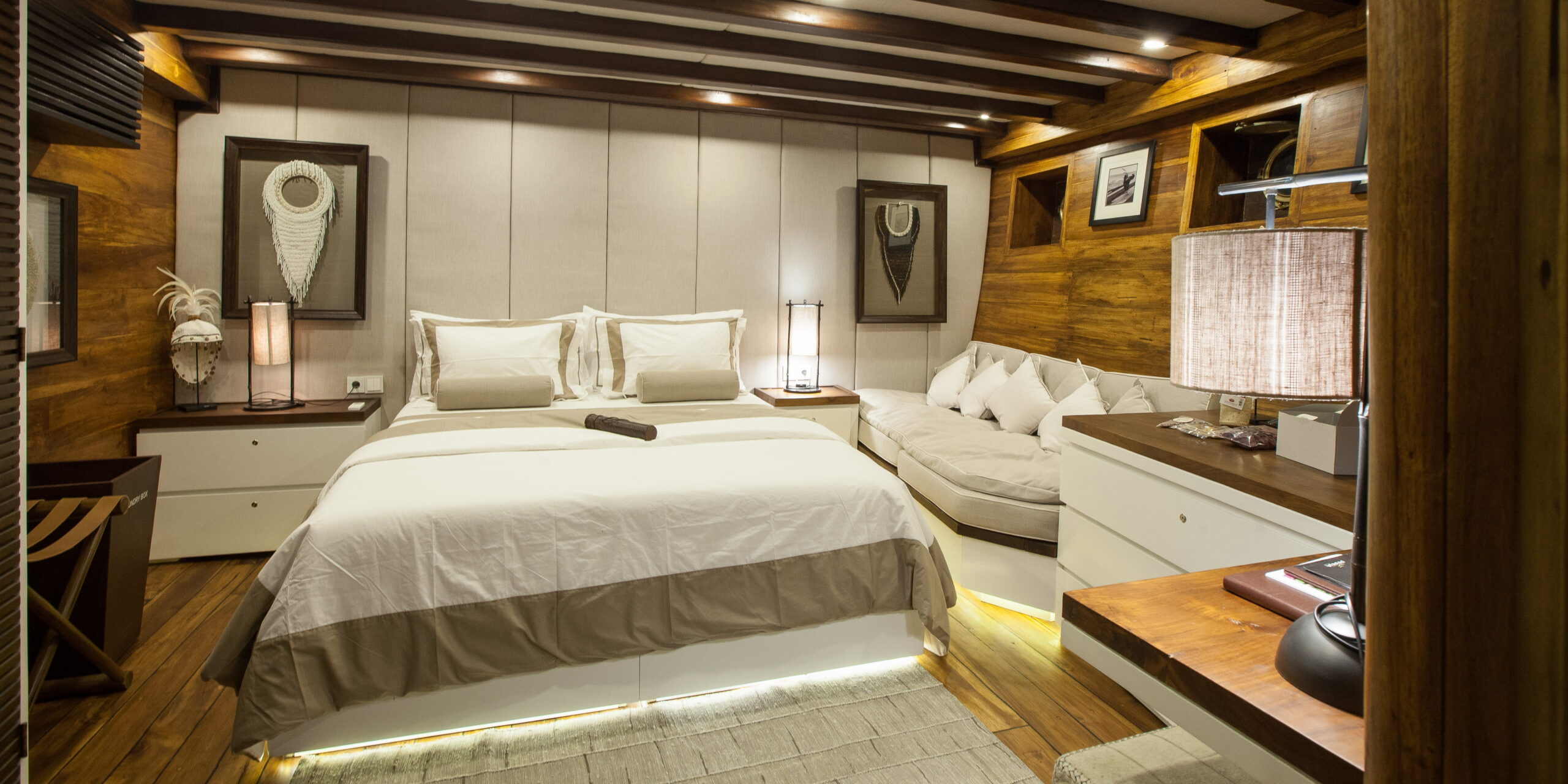 PRANA presents nine opulent cabins accommodating 18 guests, each accompanied by an exclusive ensuite, mini fridges, Smart TV and sound systems. These cabins are categorised into various tiers: 1 Master, 1 Grand, 2 Deluxe, 3 Superior, and 2 Standard. Meticulously designed, guests benefit from contemporary conveniences, crafted from genuine materials, delivering an unparalleled sense of luxury onboard.Â