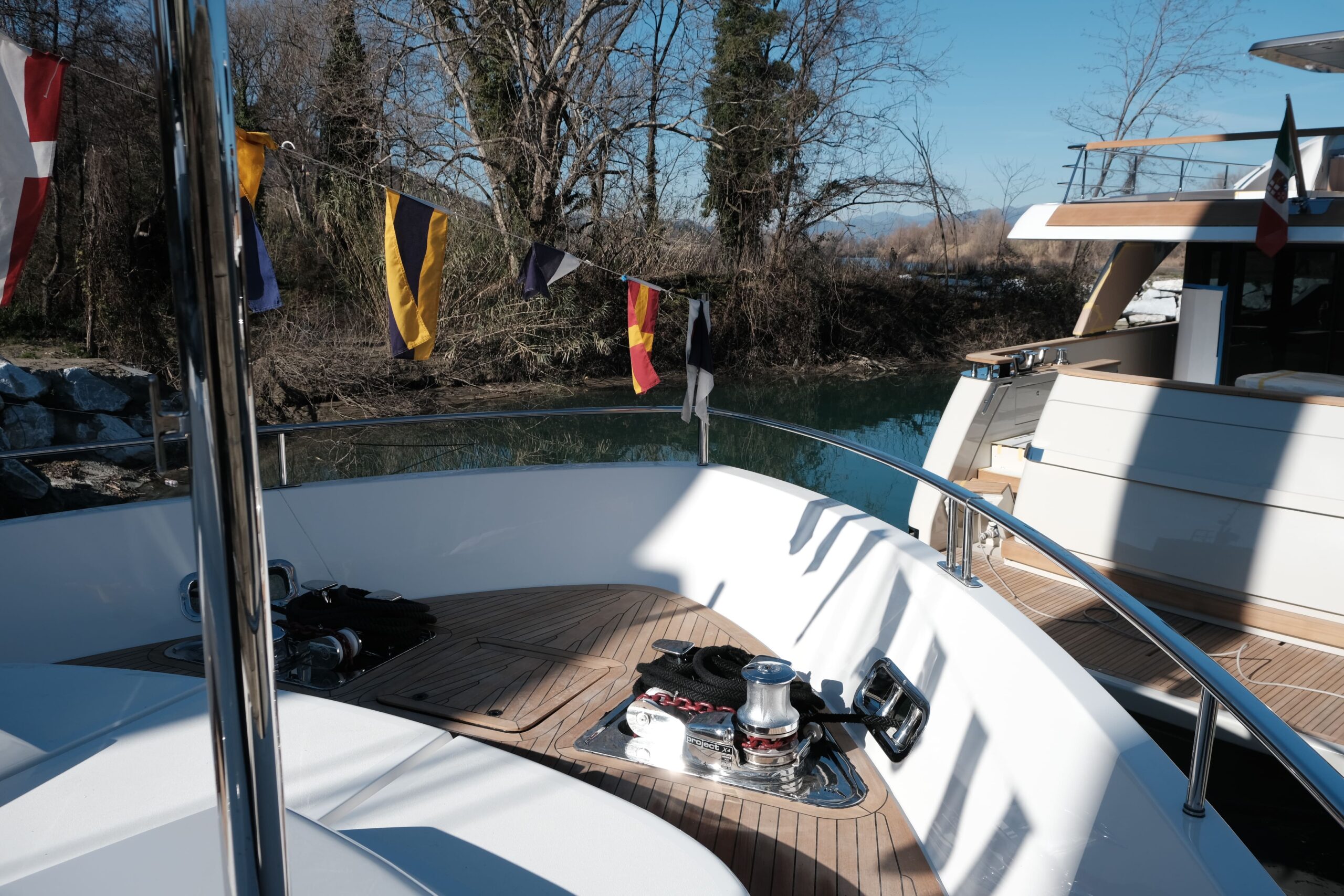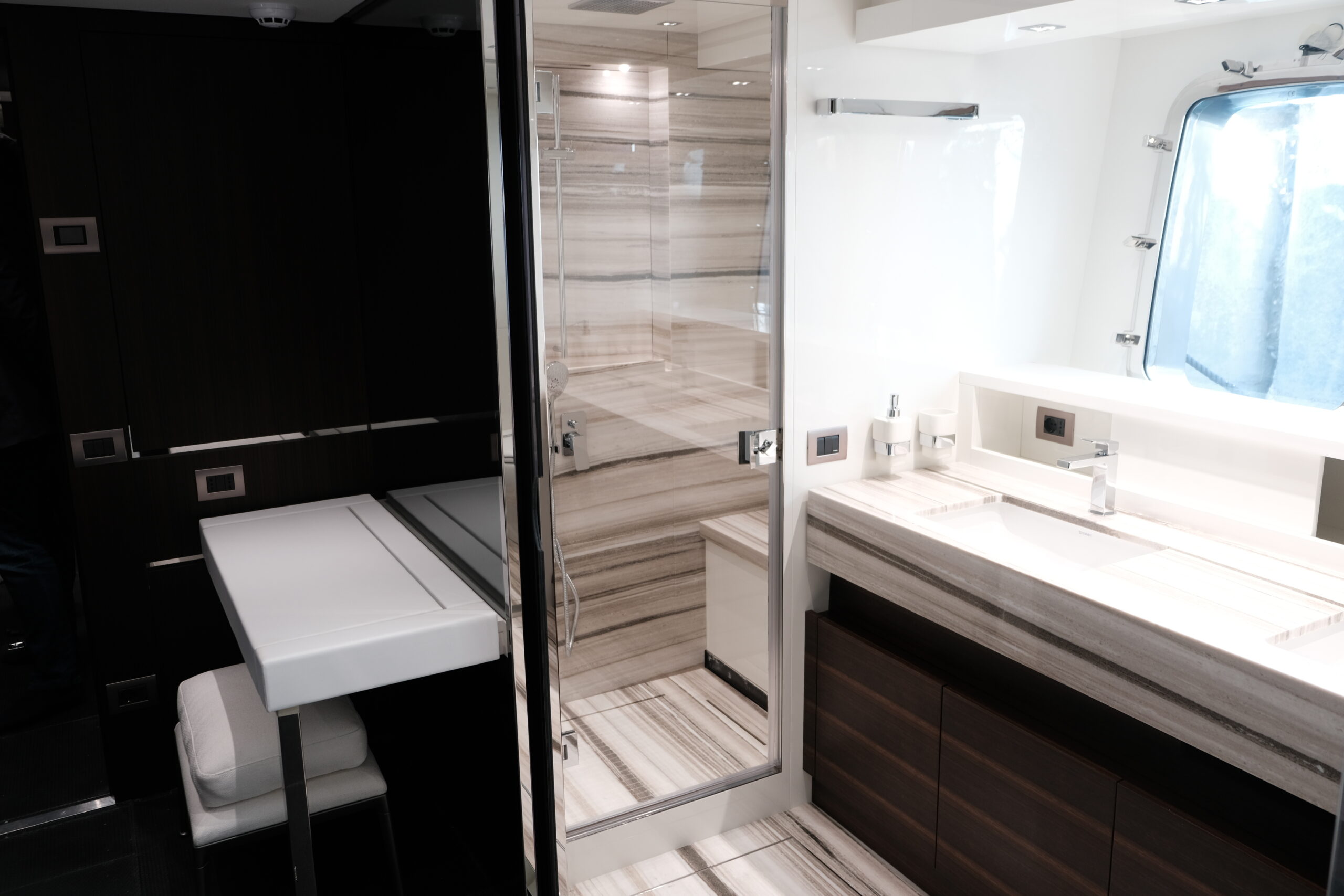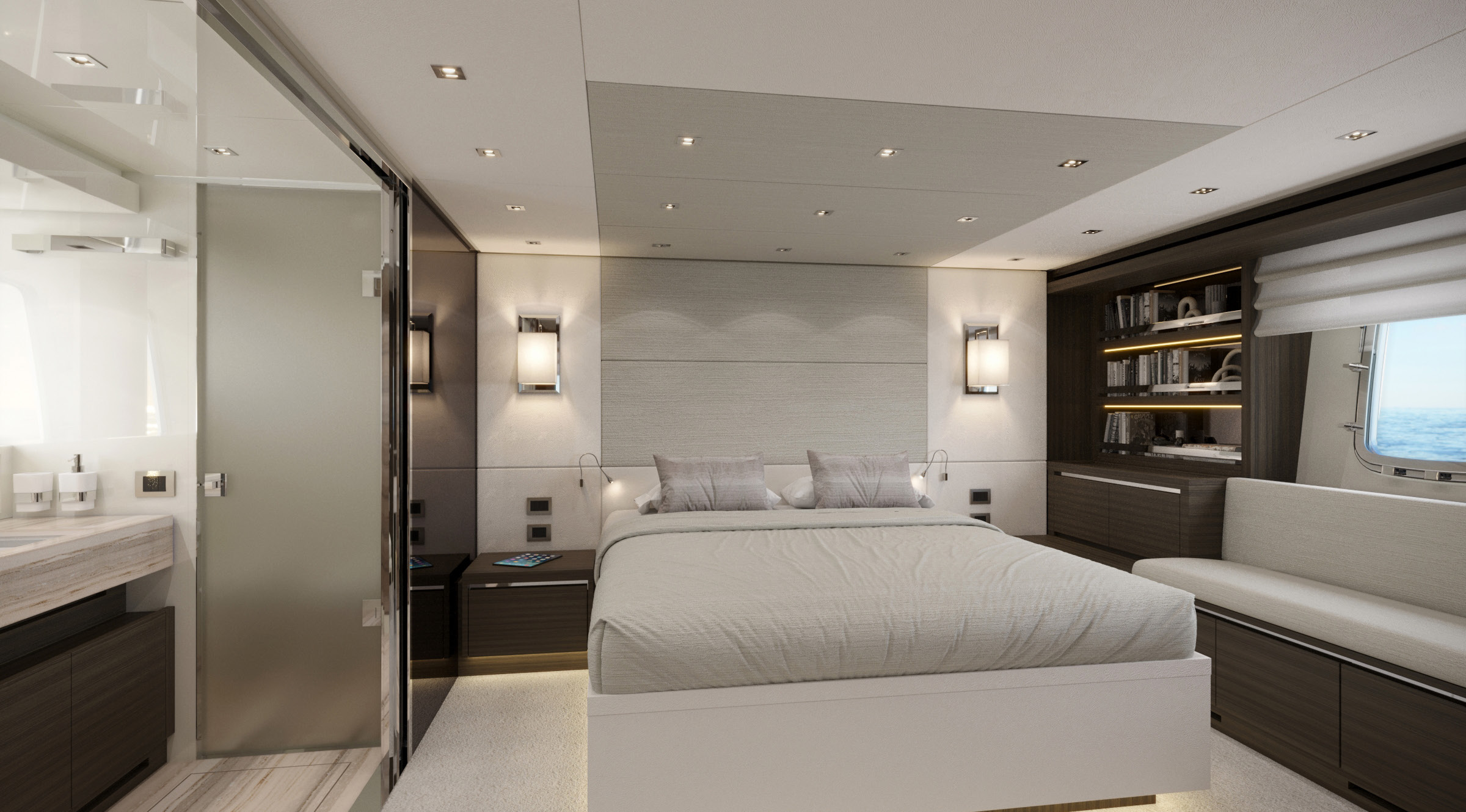 Designed with a fresh modern feel, QUEEN MARTINA’s chic interior features bleached wood floors, contrasting wood panelling plus chrome and leather accents. Her open-concept layout and open staircase enhance the flow between the indoor living areas, allowing for a seamless transition from the salon to the dining area and beyond.