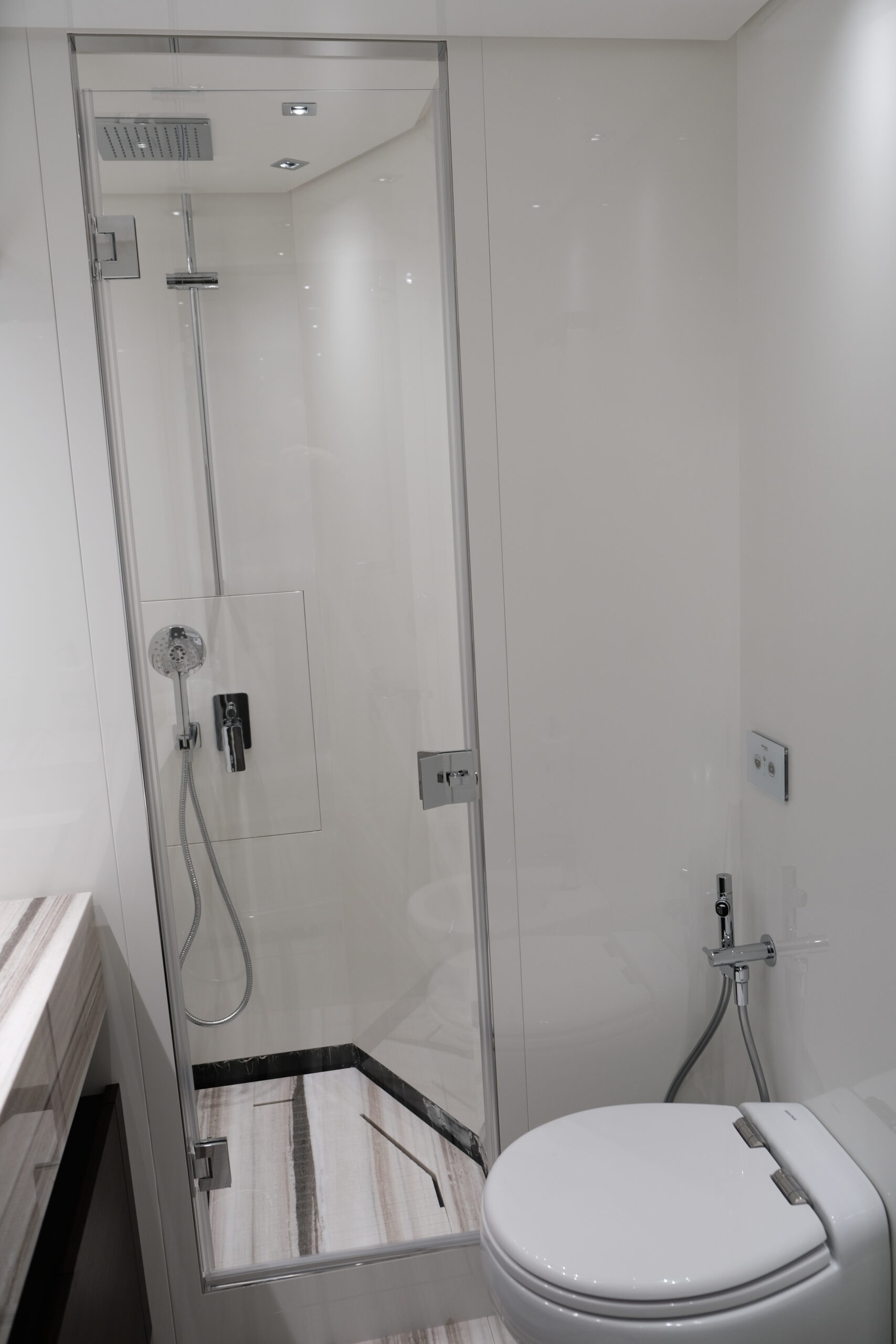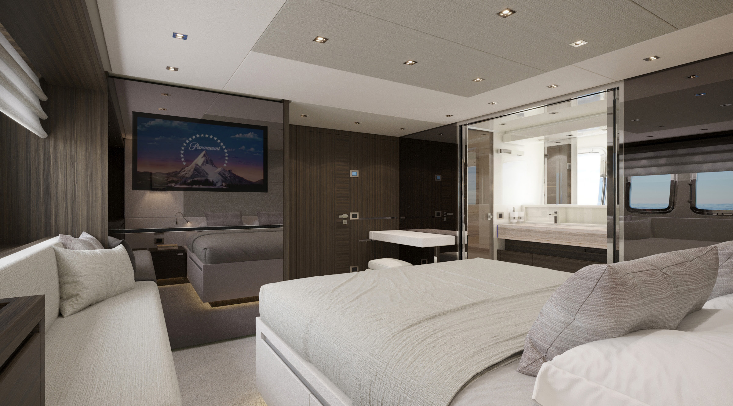 On the main deck, QUEEN MARTINA’s vast full-beam salon is perfect for entertaining or unwinding with a lounge area and bar plus a formal dining area for up to eight guests. Open and airy, her bulwark is cut to let the larger side windows catch as much light as possible allowing guests to enjoy panoramic sea views from every corner of the salon.