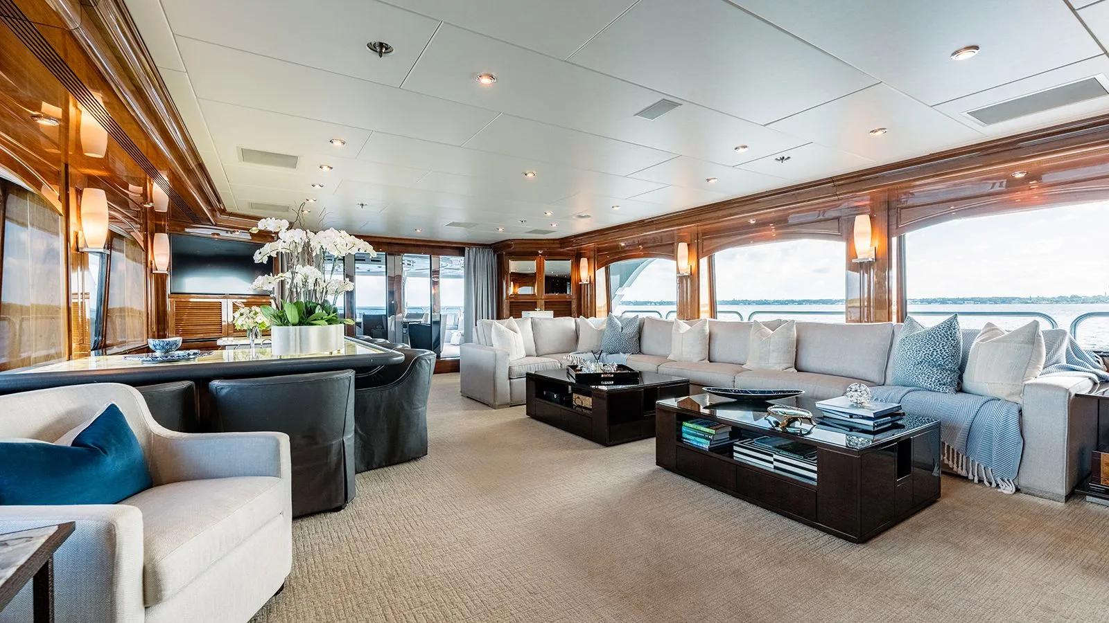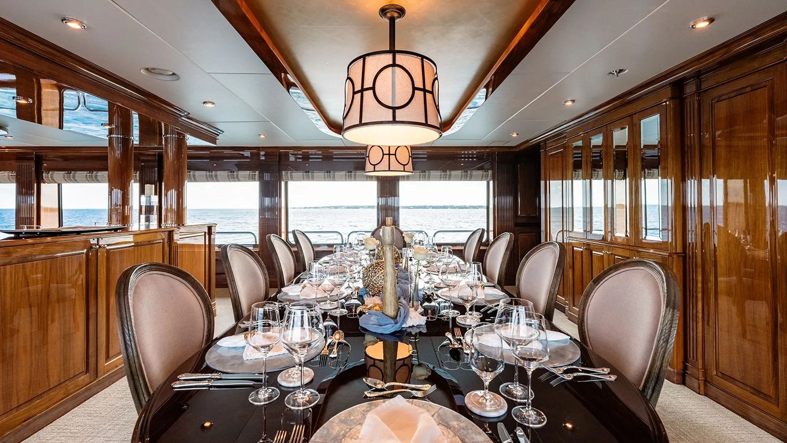 On the main deck, REMEMBER WHEN has a spacious open-plan salon. A comfortable seating area is centered around a coffee table while a Hamilton piano provides onboard entertainment. The lounge opens directly into REMEMBER WHEN’s formal dining area which can seat up to 12 guests in comfort.