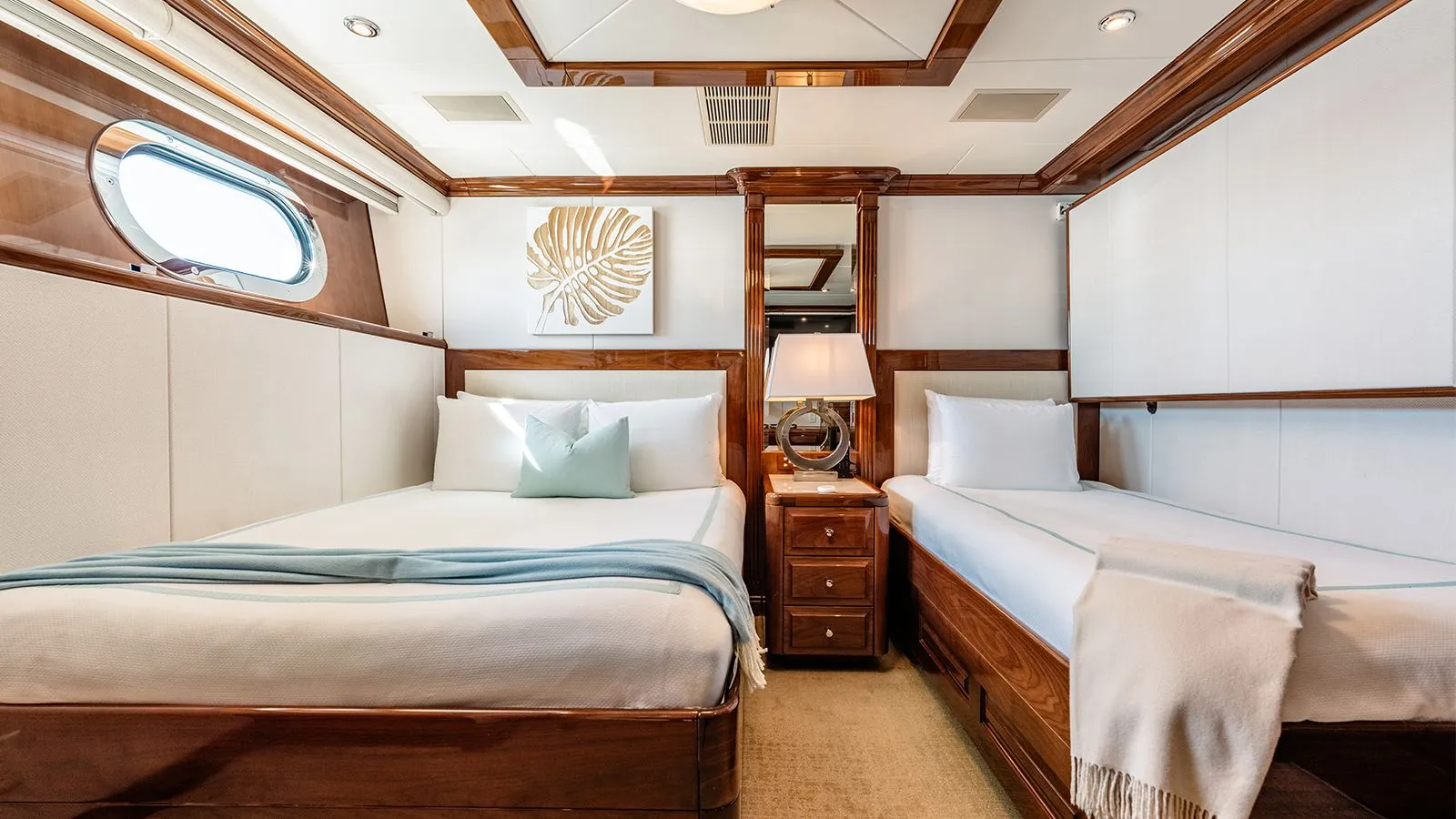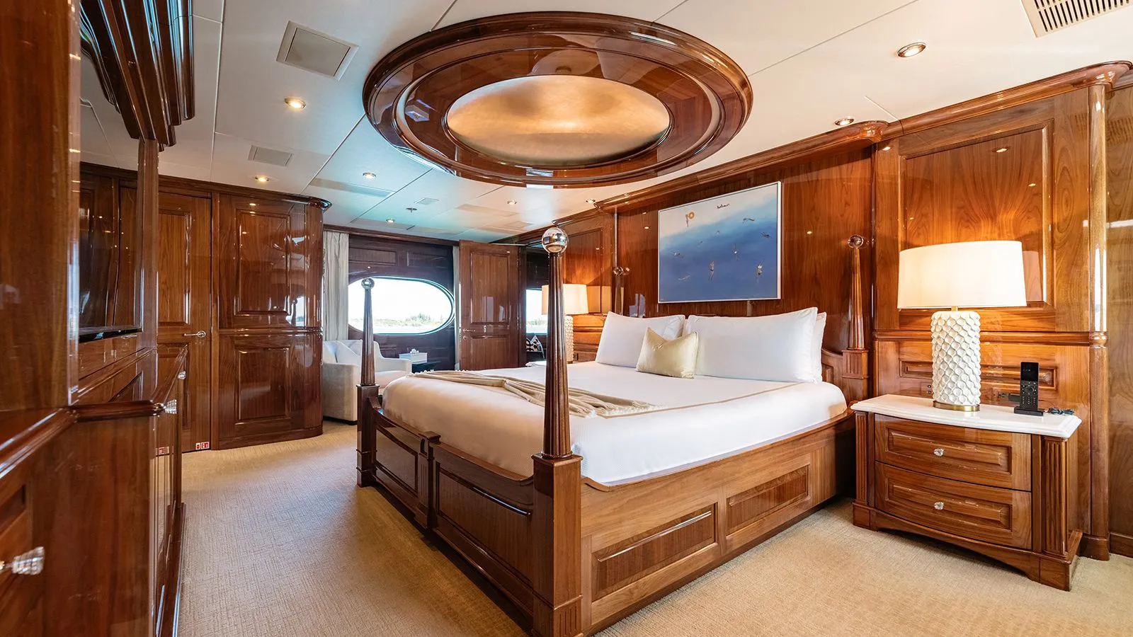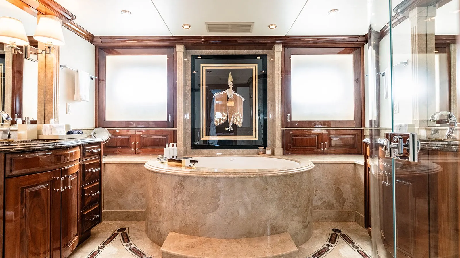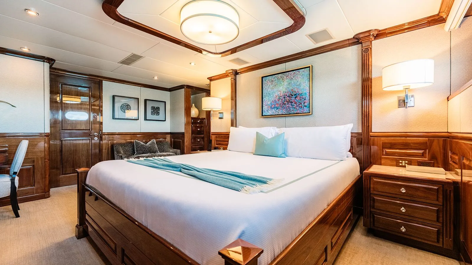 REMEMBER WHEN has 6 magnificent staterooms with accommodation for up to 12 guests onboard overnight. Each of the staterooms features an ensuite bathroom and is equipped with a full entertainment and music system. Located forward on the main deck, REMEMBER WHEN’s enormous full-beam master suite is classically elegant. The suite is accessed from the main foyer via a private office with a double sofa bed.