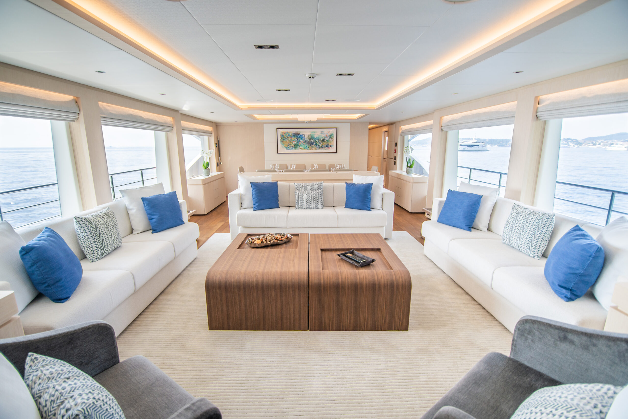 SANTOSH’s cabins (1 Master, 1 VIP, 1 Double, 2 Twin) can support up to 12 guests overnight, with the Master cabin featuring an exceptionally beautiful view. She also has accommodation for 6 crew members. The interior and exterior also benefit from being designed by the boat’s manufacturer: Gulf Craft. A unique art style of beautiful furnishings and inviting areas permeates all areas of the vessel.