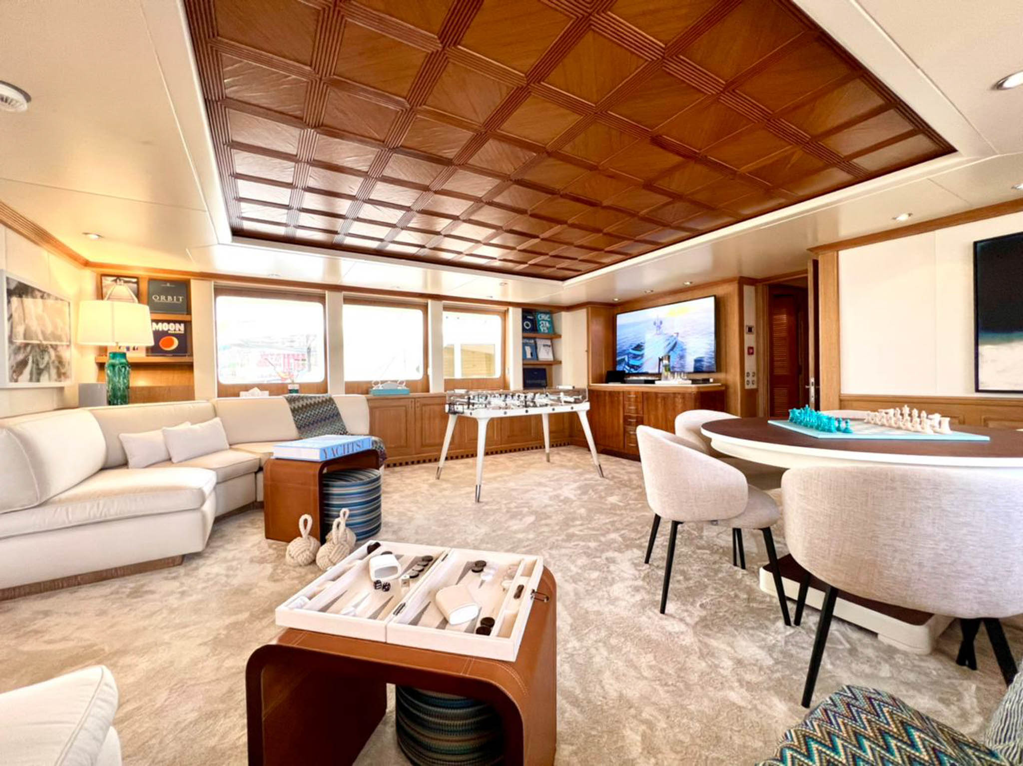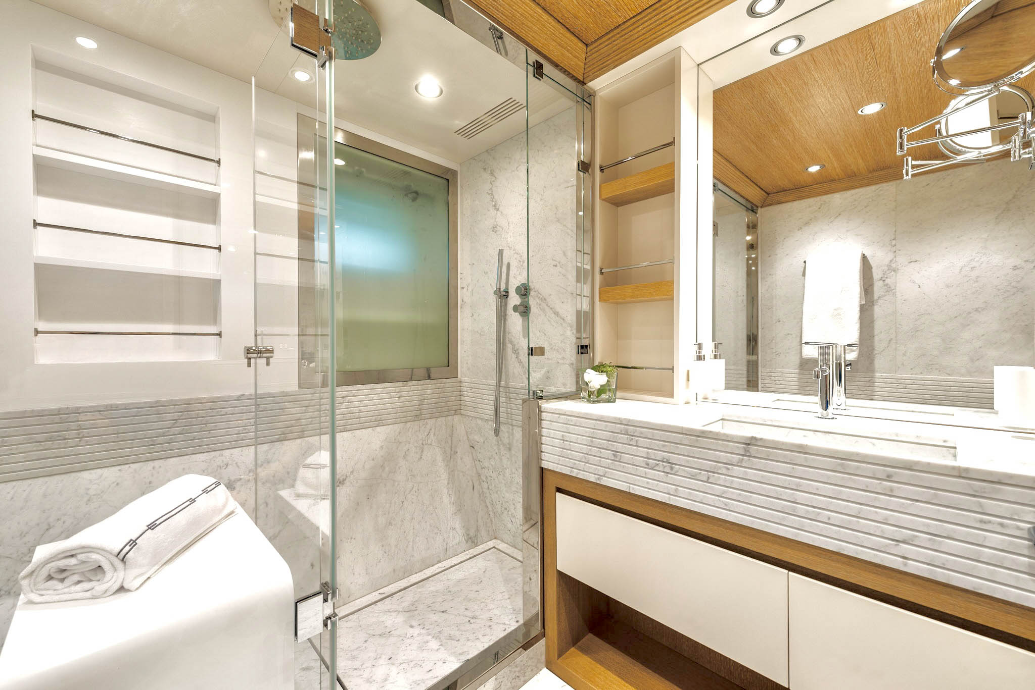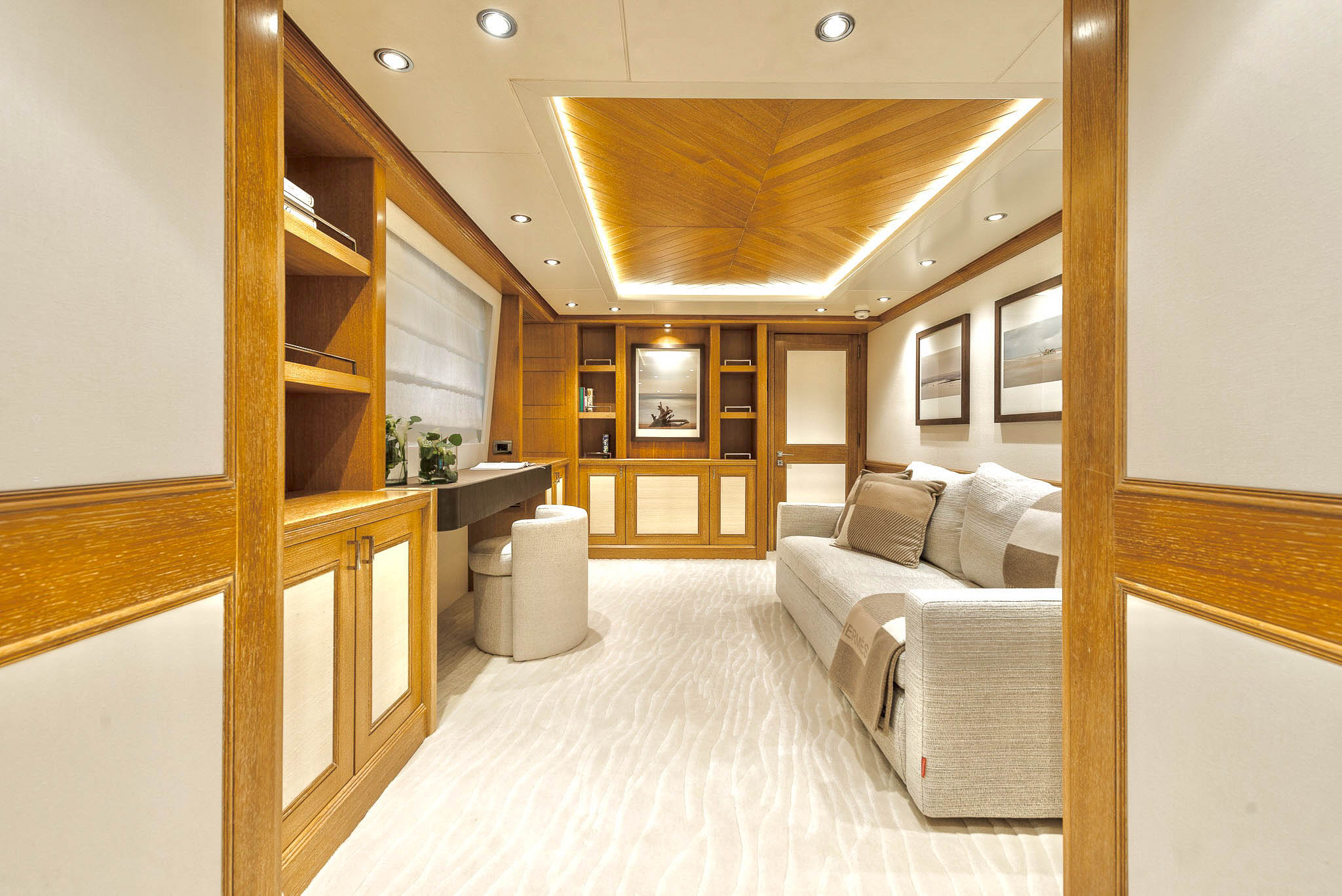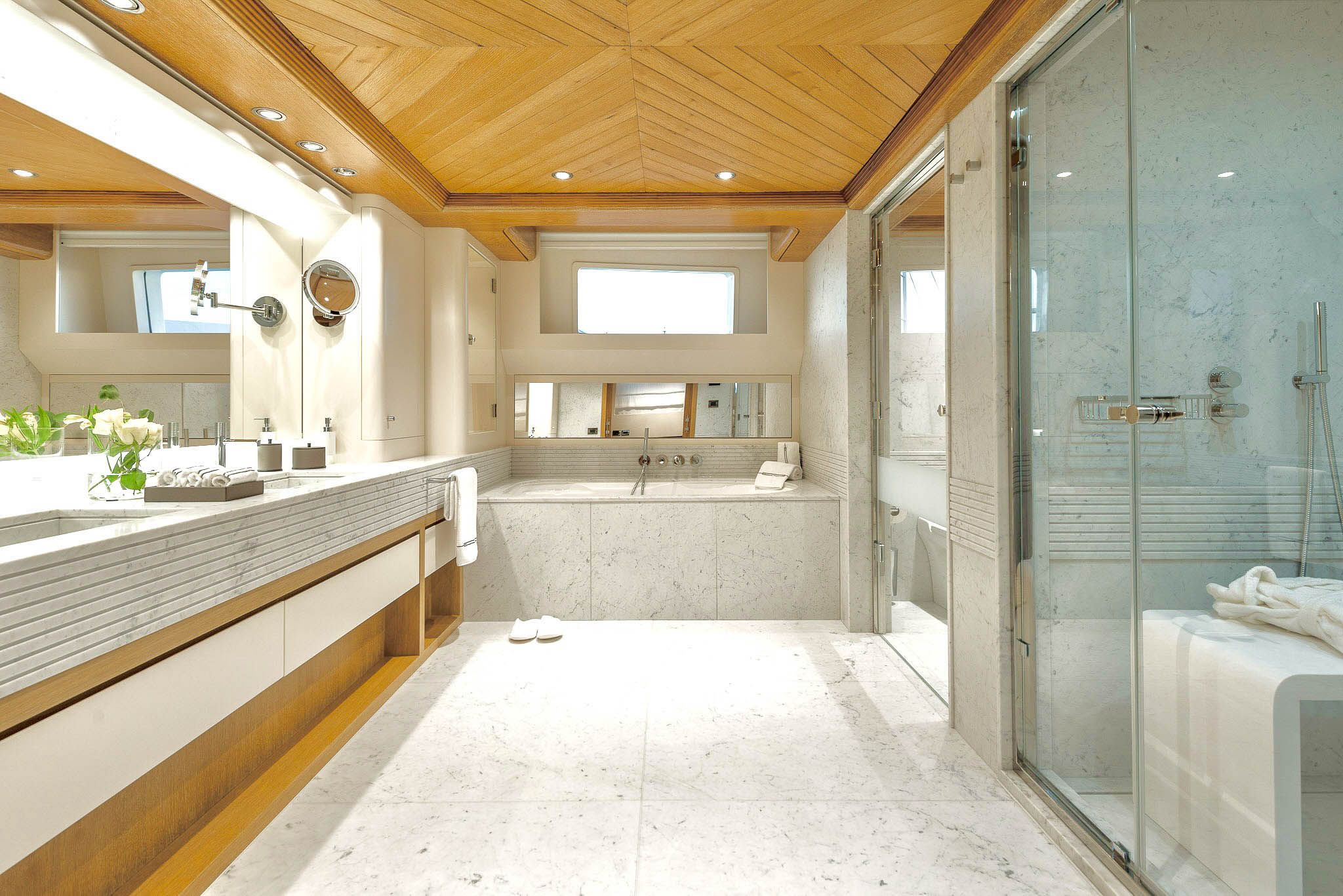 The Main Deck houses a stunning master suite with an en-suite, dressing room, lounge area, office, and bonus features like a sauna and a frame TV. The Lower Deck offers guest accommodation with two spacious double cabins, each with en-suite, and two twin cabins convertible into a double. All bathrooms are luxuriously finished in marble and wood, ensuring top-notch pampering onboard SOLAFIDE.