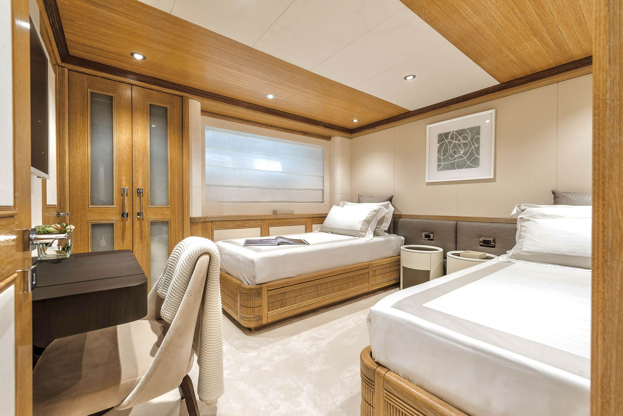 The yacht also includes a twin cabin, offering a serene space with a refined ambiance. All cabins are thoughtfully designed, providing guests with an idyllic setting to rest, relax, and revel in the lavishness that SOLAFIDE has to offer.