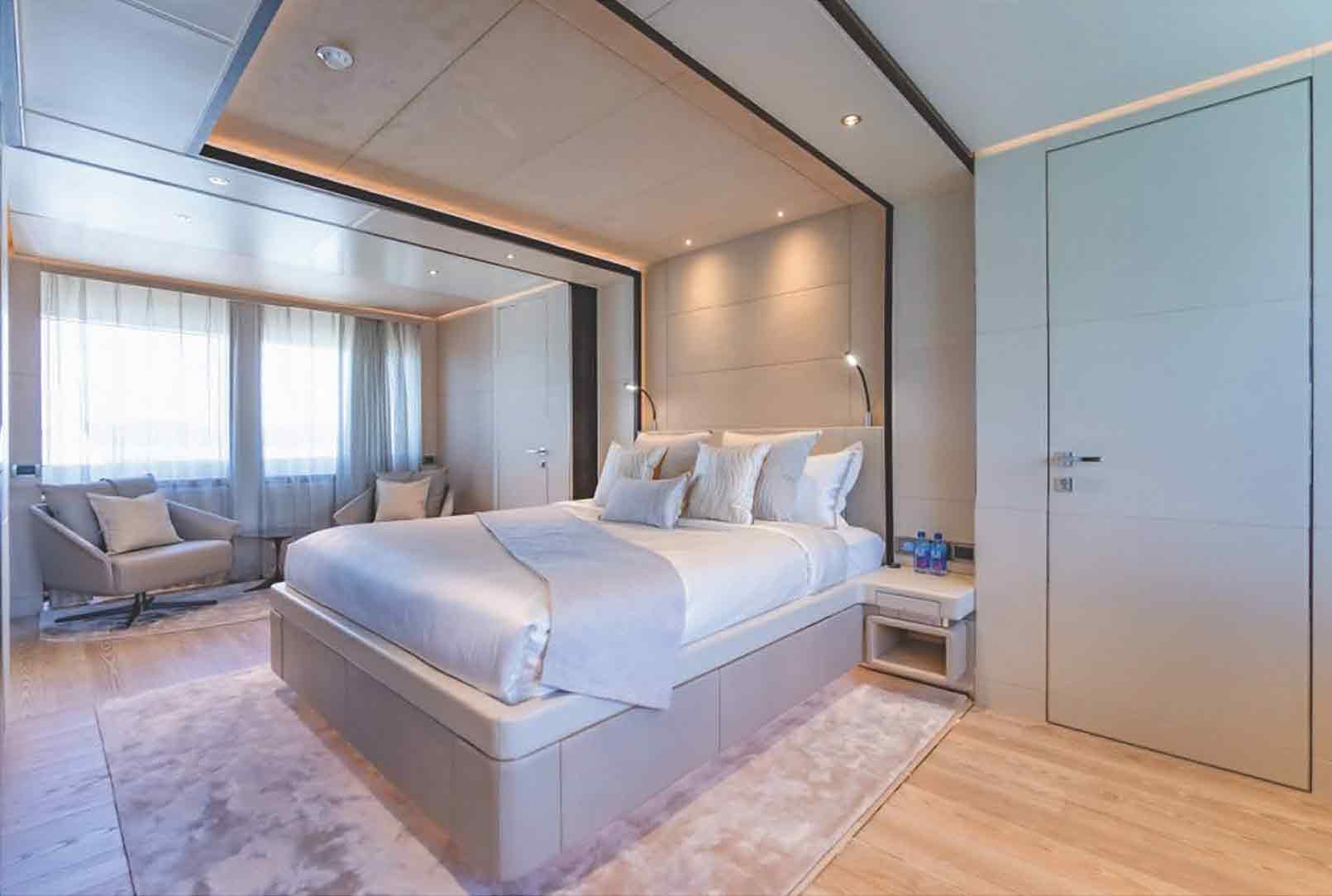 SONG OF SONGS accommodates up to twelve guests across six elegantly designed cabins. The upper deck is home to the Owner’s suite, complete with a lavish marble bathroom and sweeping ocean views that create a true sense of serenity. A second master cabin on the main deck features a king-size bed, walk-in wardrobe, and a luxurious en suite, offering a refined retreat for additional guests. On the lower deck, four beautifully appointed cabins — including a flexible convertible double — provide exceptional comfort and versatility, making the yacht perfectly suited for families or multi-generational cruising.