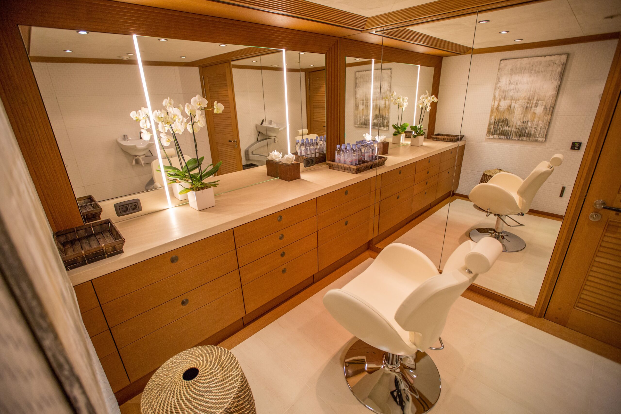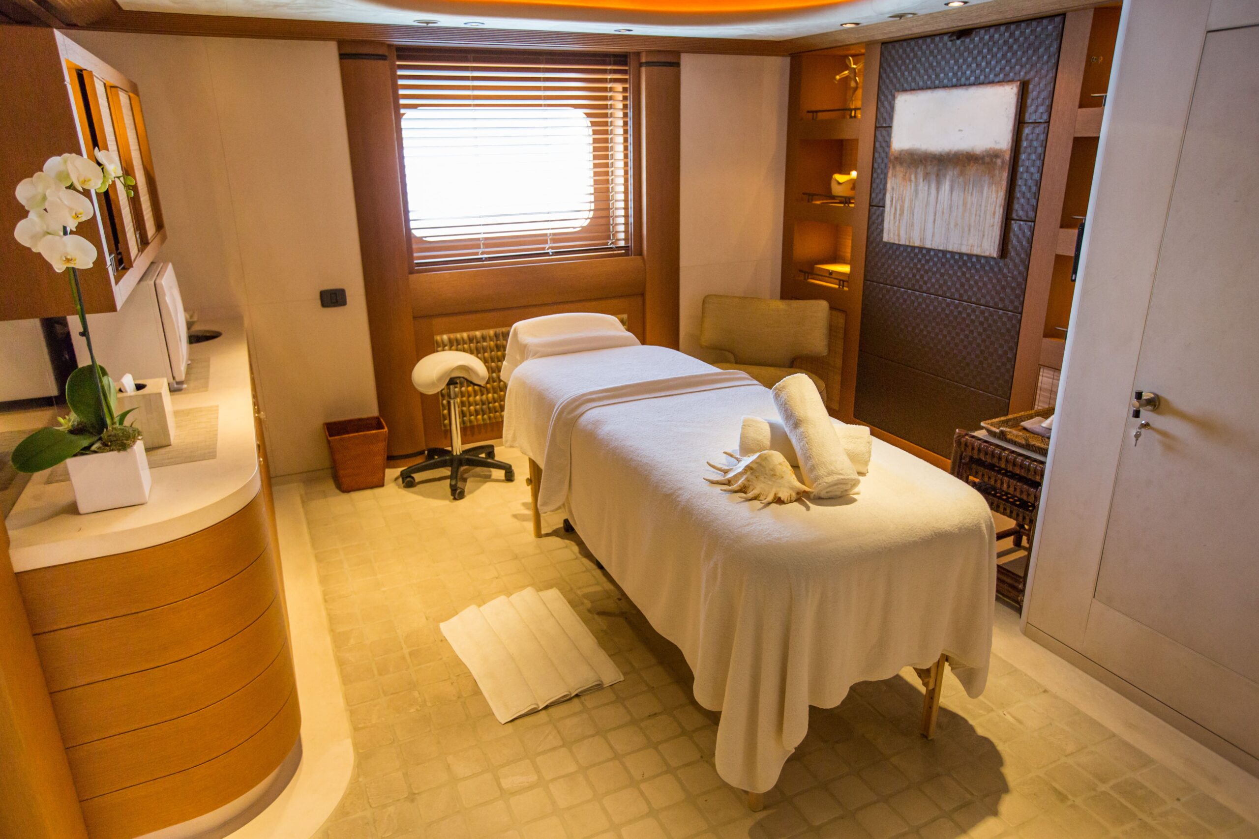 Take the elevator down to the lower deck and discover the wellness suite. A well-equipped gym invites fresh air via an elegant sea terrace. Recover in the steam room, plunge pool, relaxation area, or massage and treatment rooms.