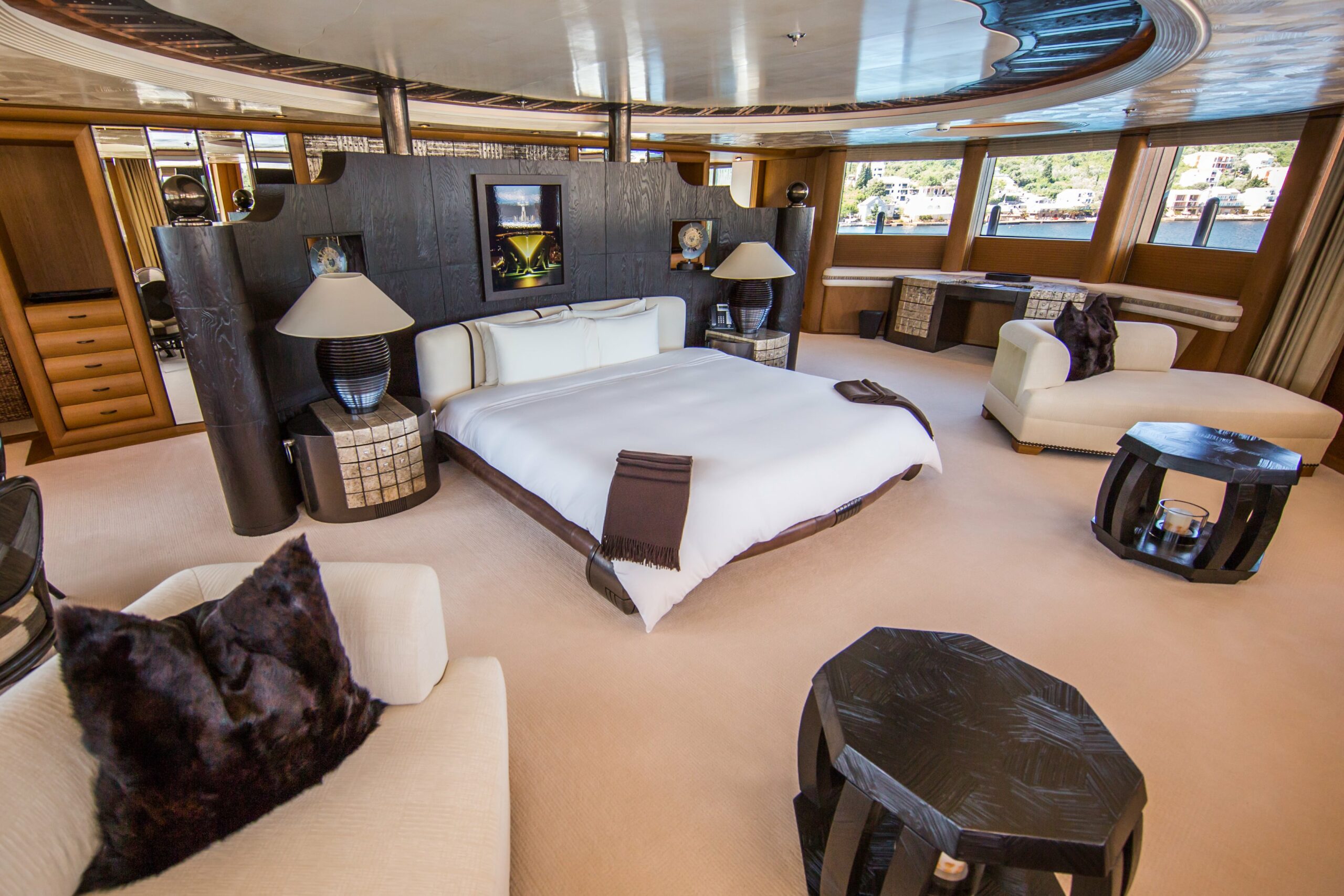 A resplendent dining room can open up into the main salon. On movie night, head to the tiered cinema with specialist audio, projection, and a 180” screen. For livelier functions, the sweeping lounge and bar becomes a nightclub with a sound system and illuminated dancefloor. Carry the party outside onto the huge aft deck (also suitable for open-air dining).