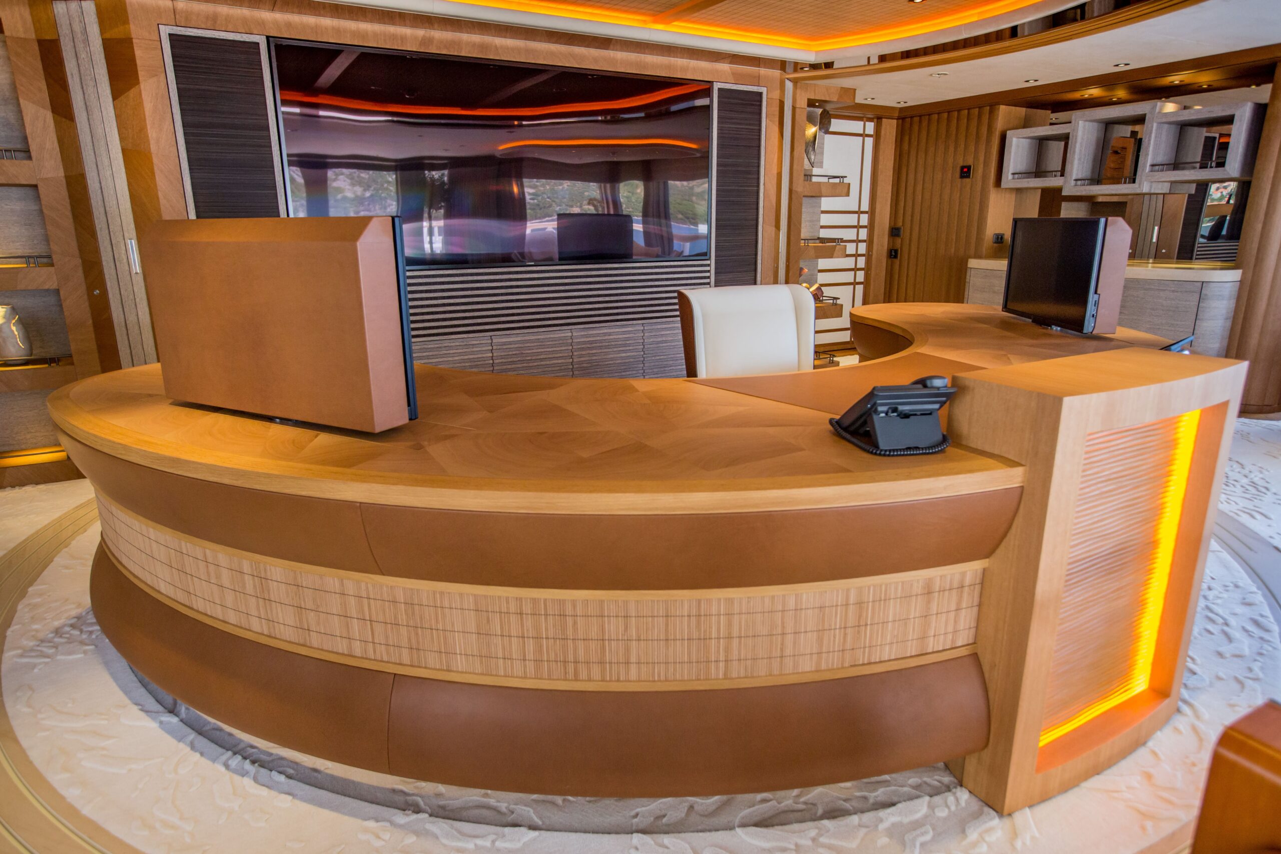 A helipad allows discrete access to one of two private terraces and a sumptuous full-beam master suite. Calm, spacious rooms include a bathroom, dressing room, and lounging area make for laid back living. The office aft features curving privacy screens and guest seating make this area truly flexible. A butler’s cabin is the only other accommodation on this level, ensuring your every need is met.