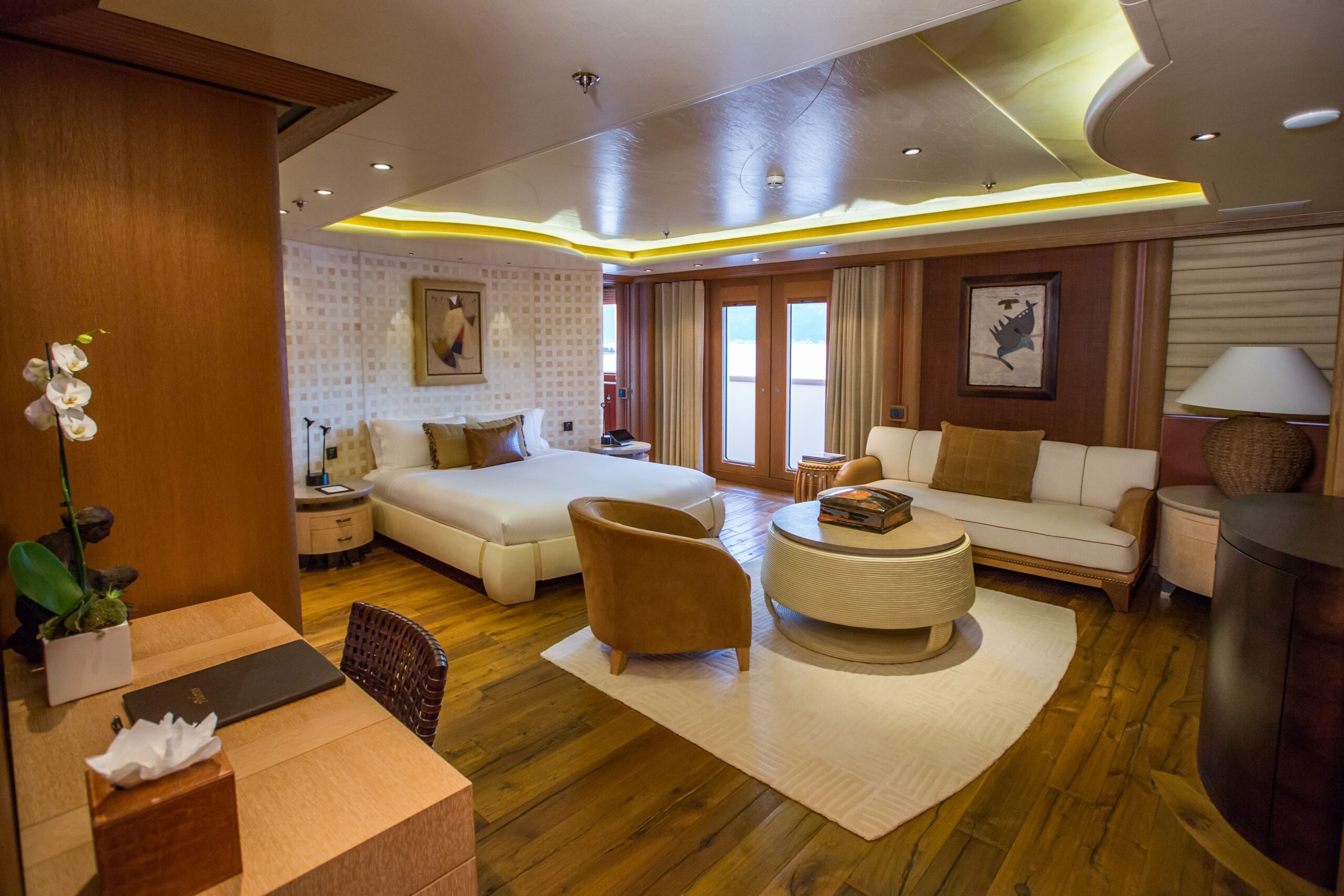An array of versatile rooms promote socialising, celebration, and entertainment aboard PELORUS. Warm, natural colours and textiles showcase the beautiful interior design of Terence Disdale.