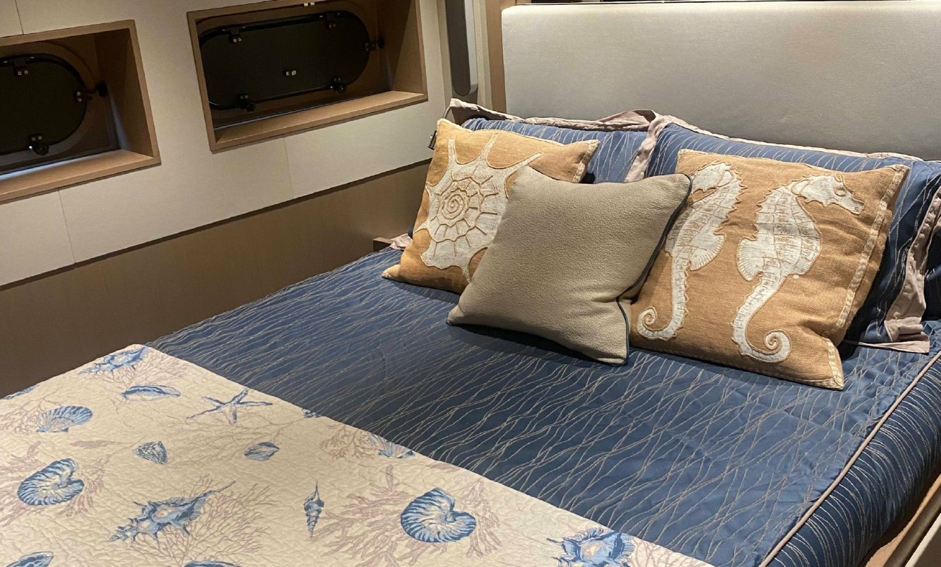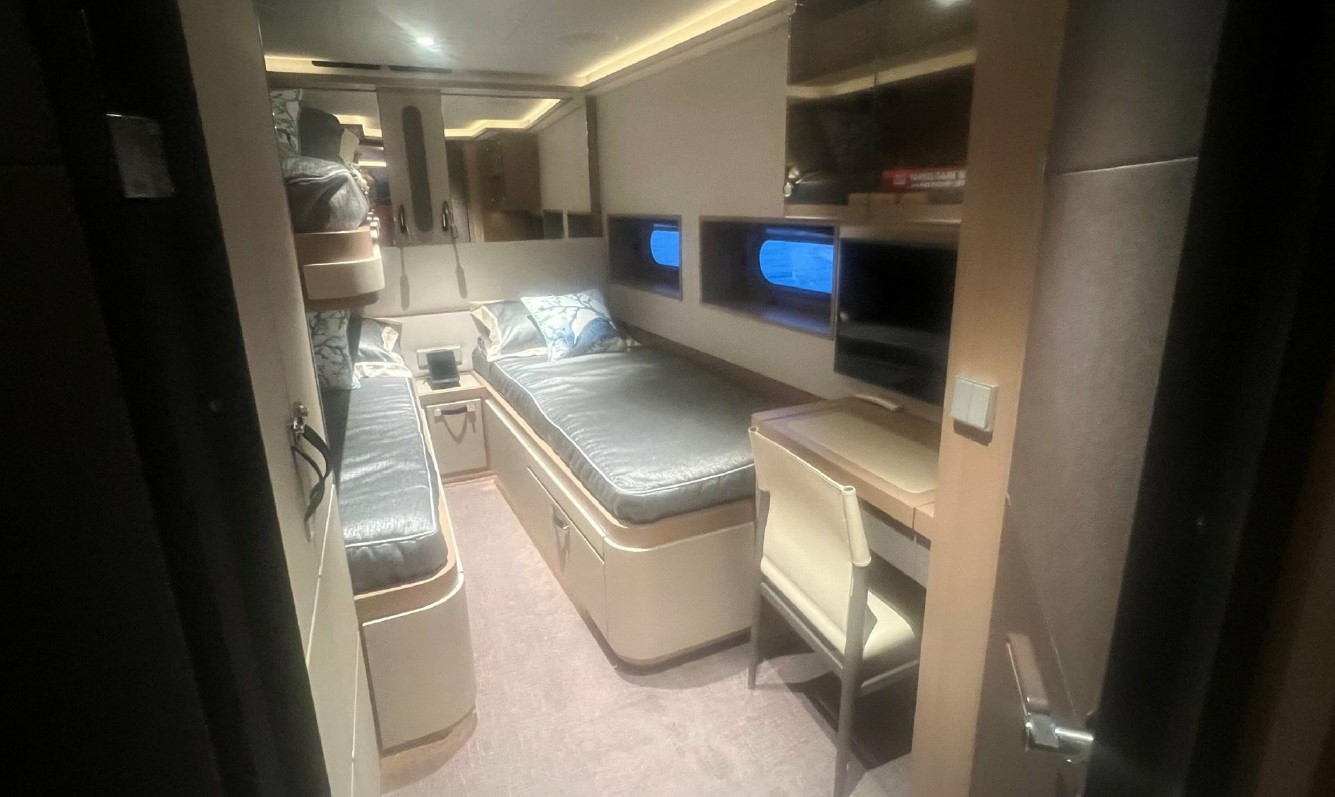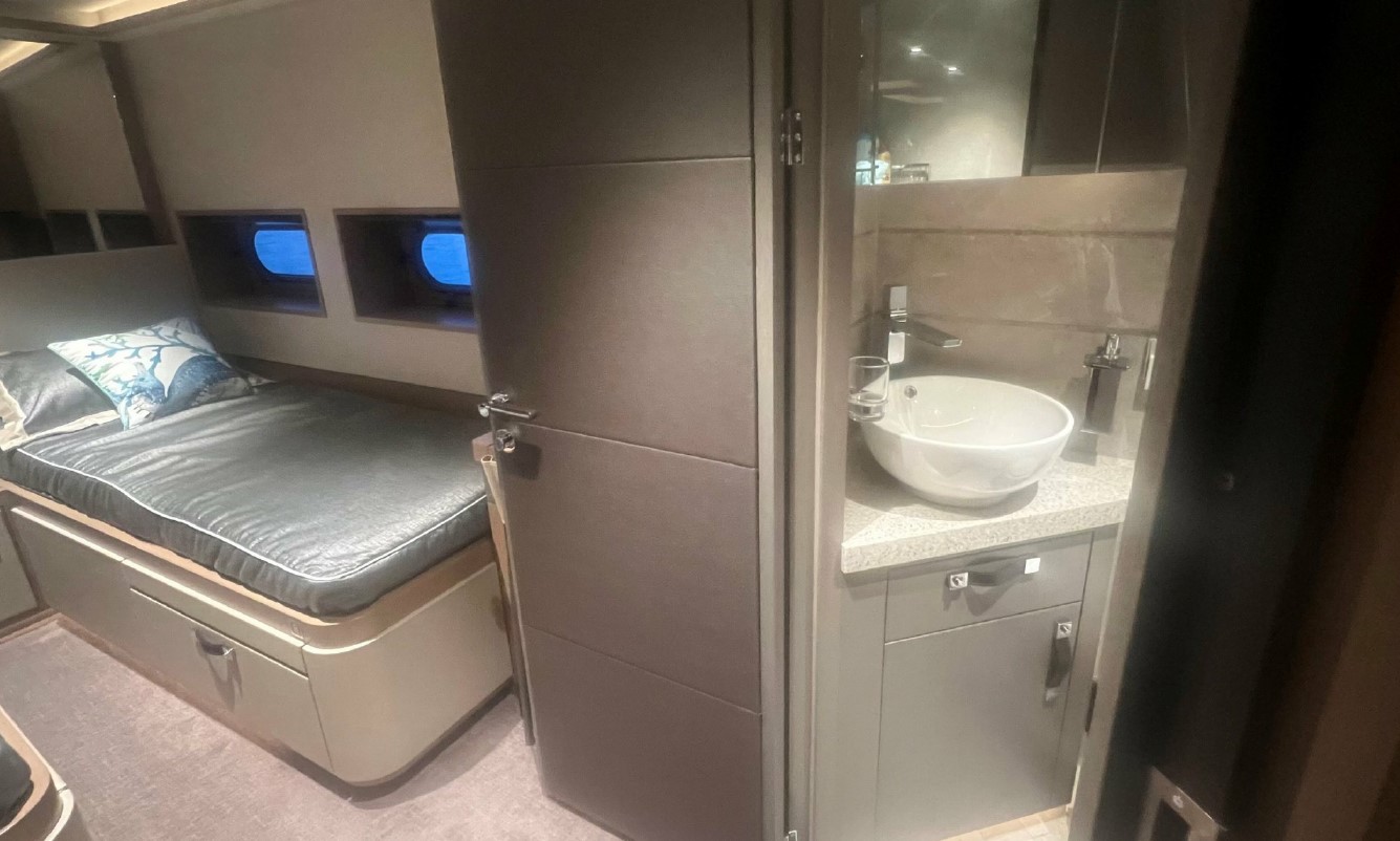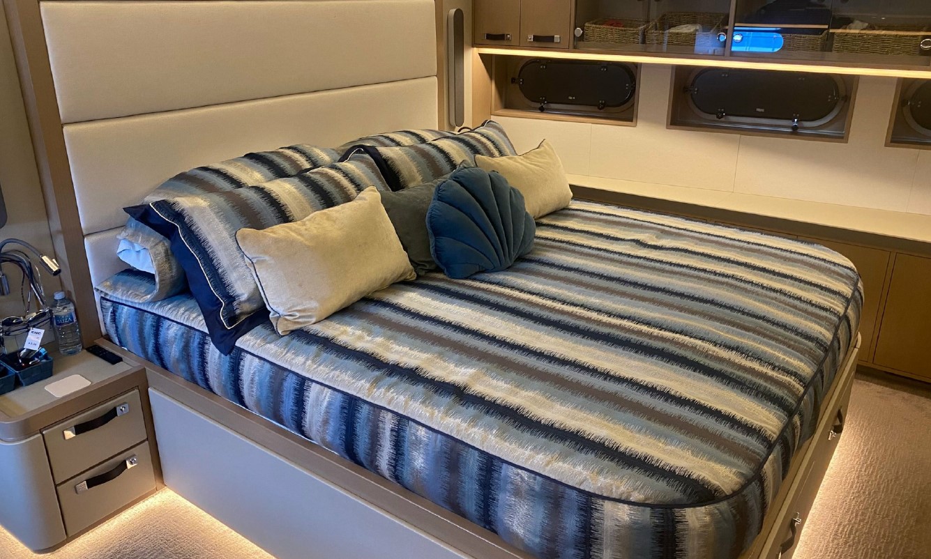 Her interior, redesigned by Just Design and Super Nova Luxury Interior, reflects understated sophistication, with rich textures, ambient lighting, and refined furnishings. Accommodation includes a spacious full-beam master suite, a queen guest cabin, and a twin — all equipped with modern entertainment systems and private en suites. Every inch of her 196GT has been thoughtfully optimised to support long-range cruising without compromising comfort.