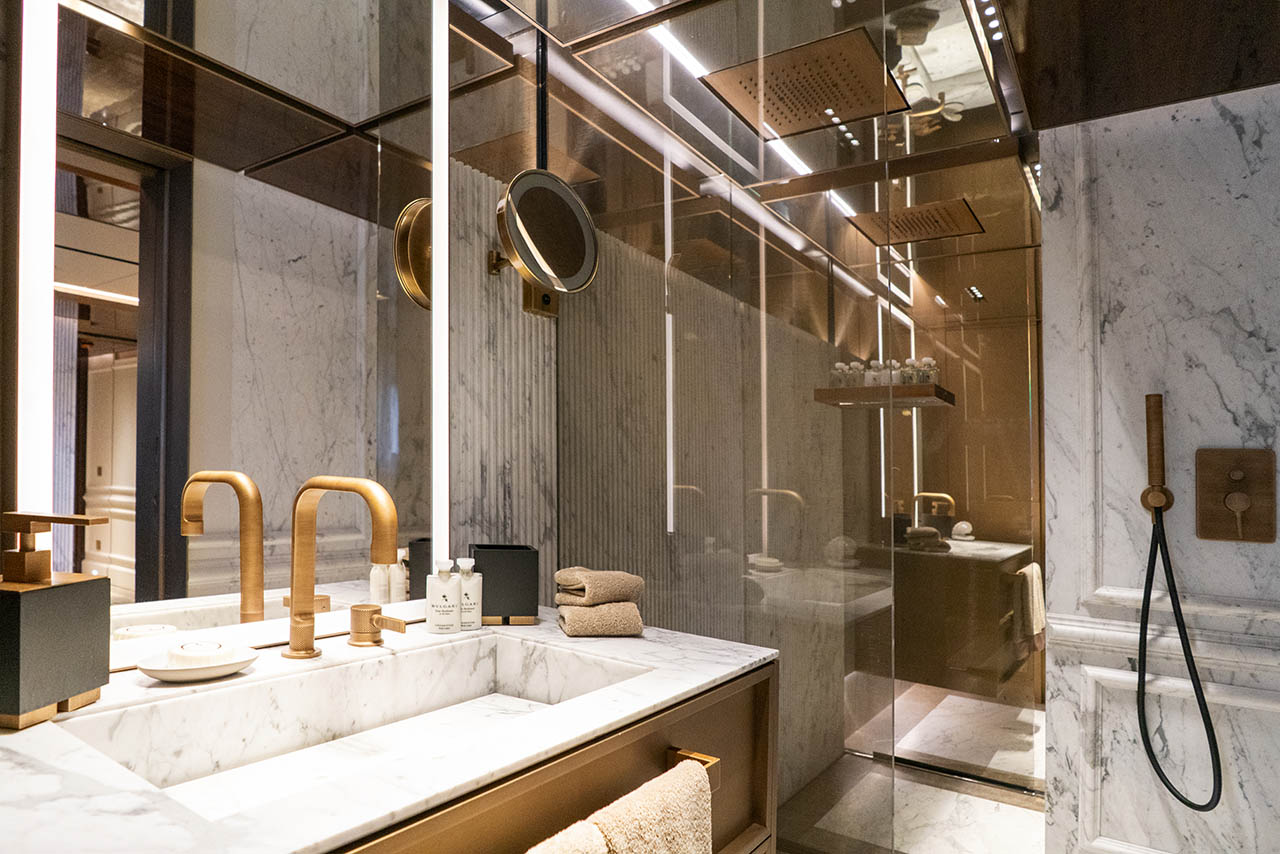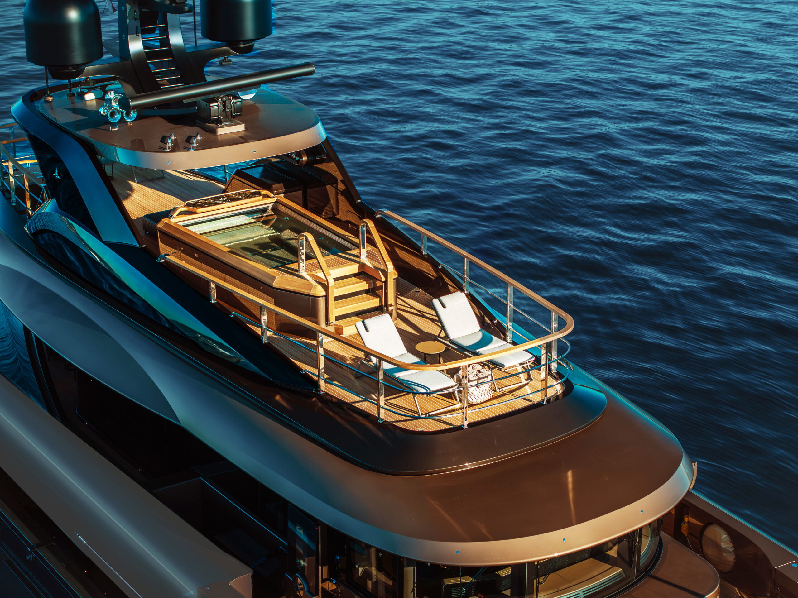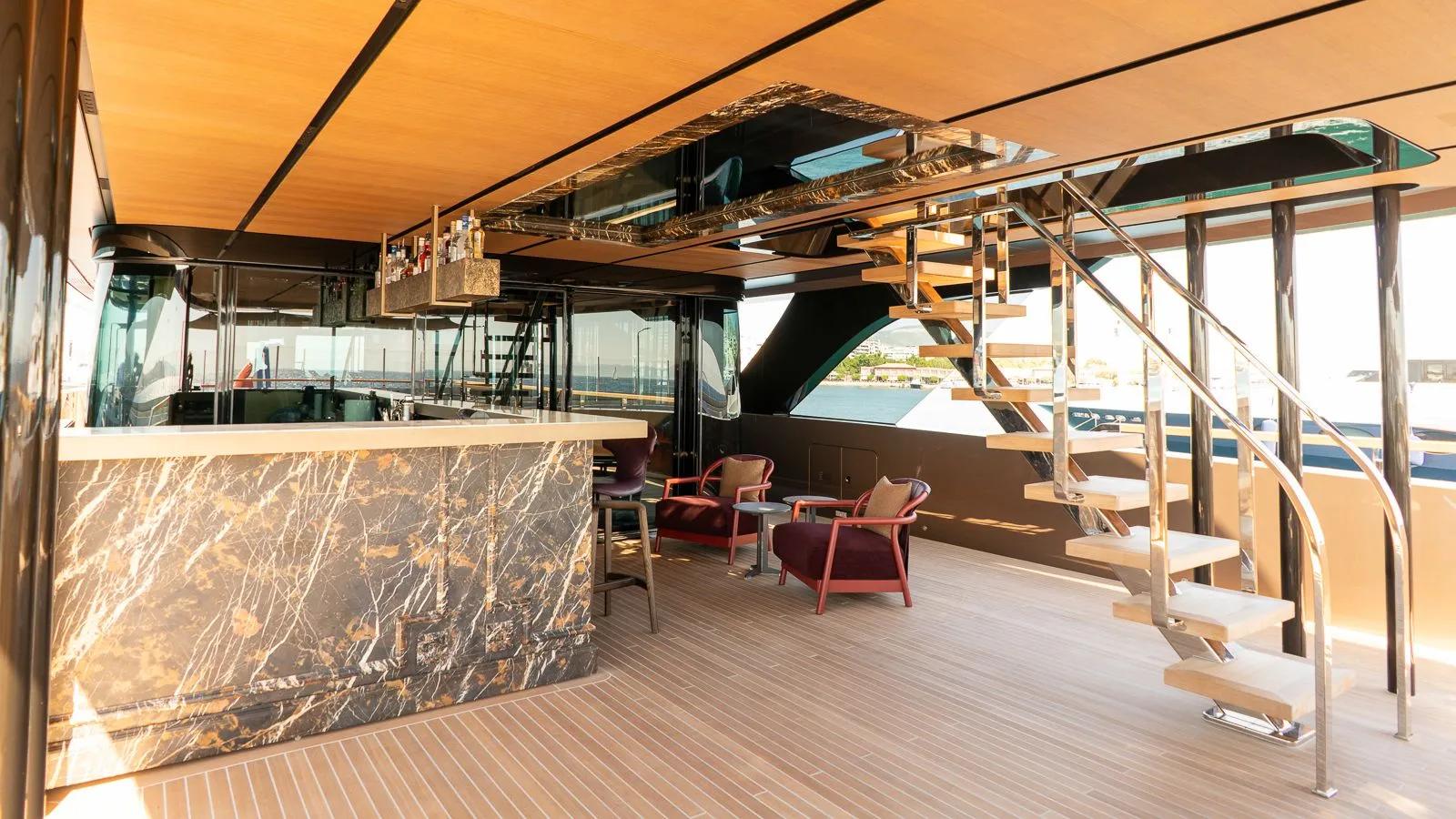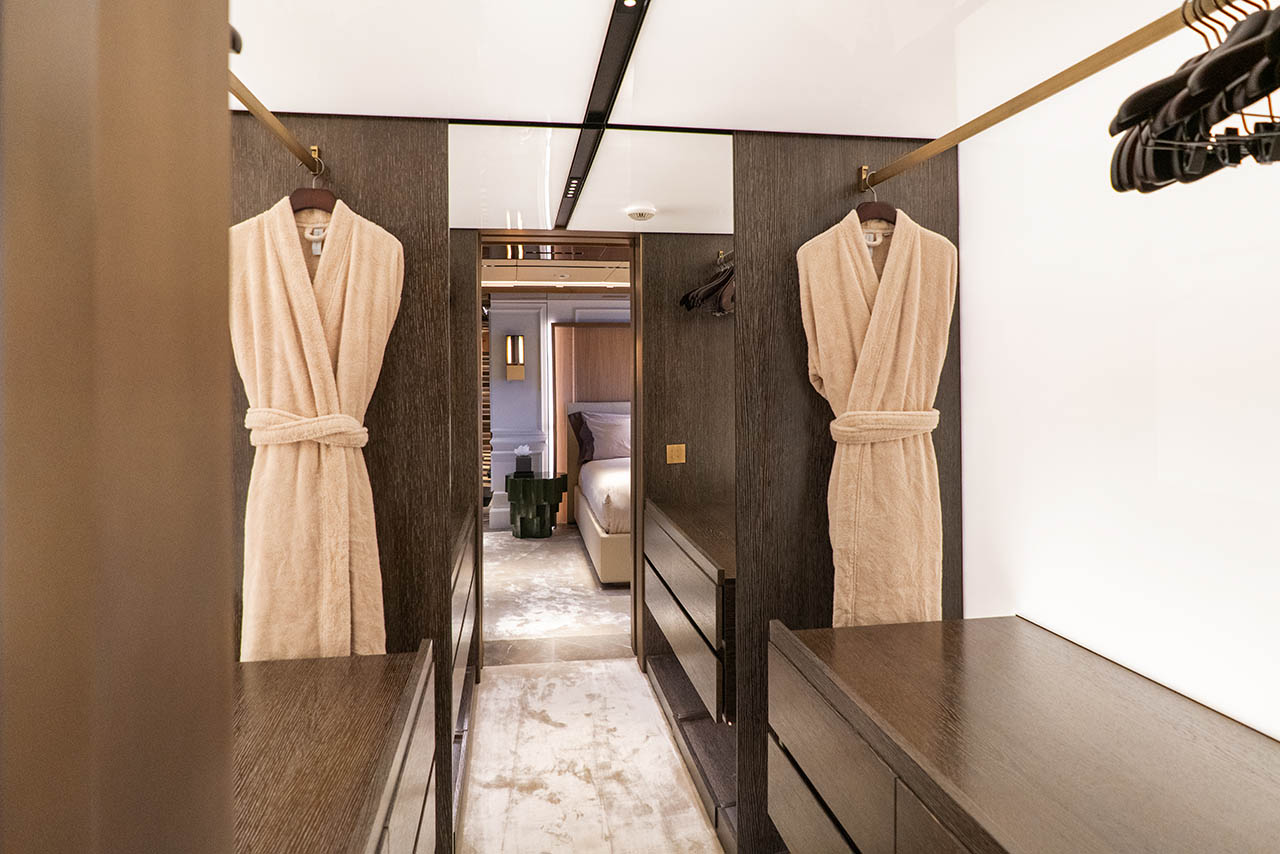 Her expansive exterior decks are thoughtfully designed for both entertainment and relaxation. From the sweeping sundeck with a gold-detailed mosaic swimming pool to the stylish beach club at water level, RAJA² invites you to immerse yourself in the yachting lifestyle. Whether you’re sipping cocktails at sunset or enjoying a private moment by the sea, every space is curated for memorable moments.