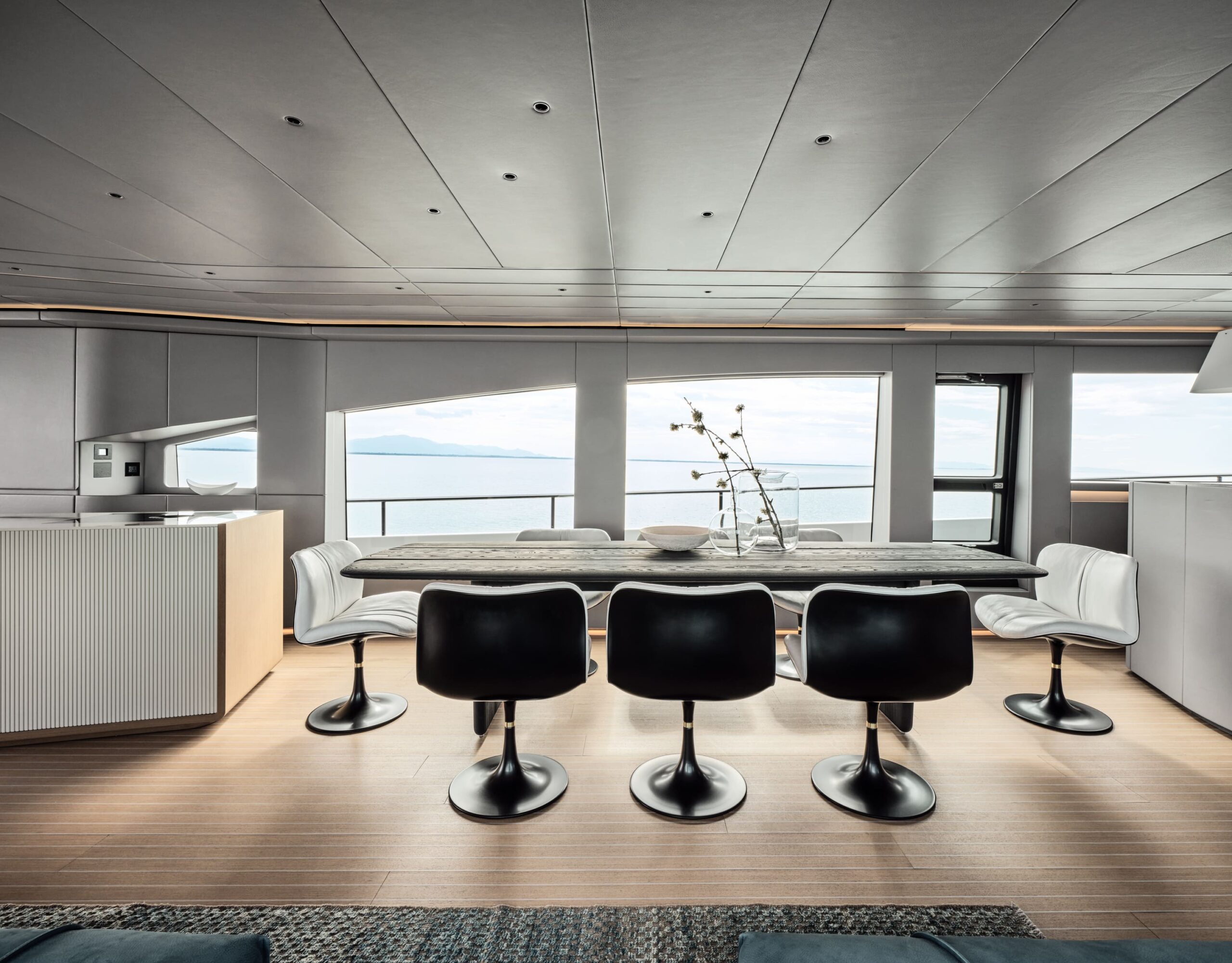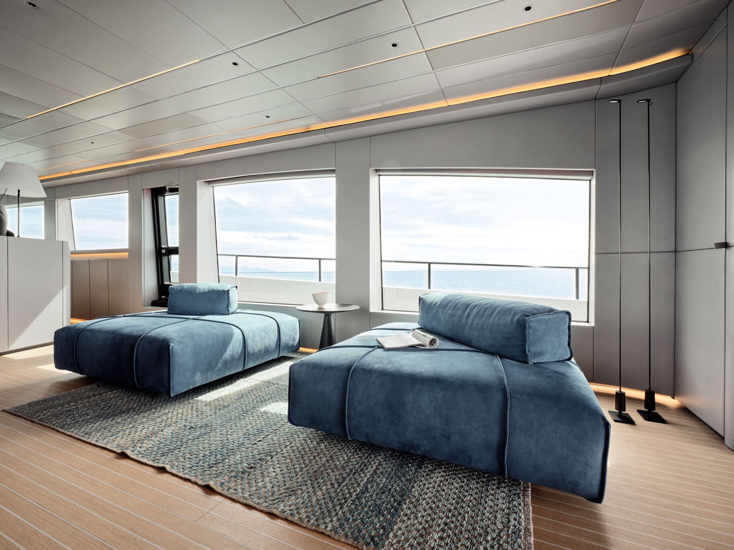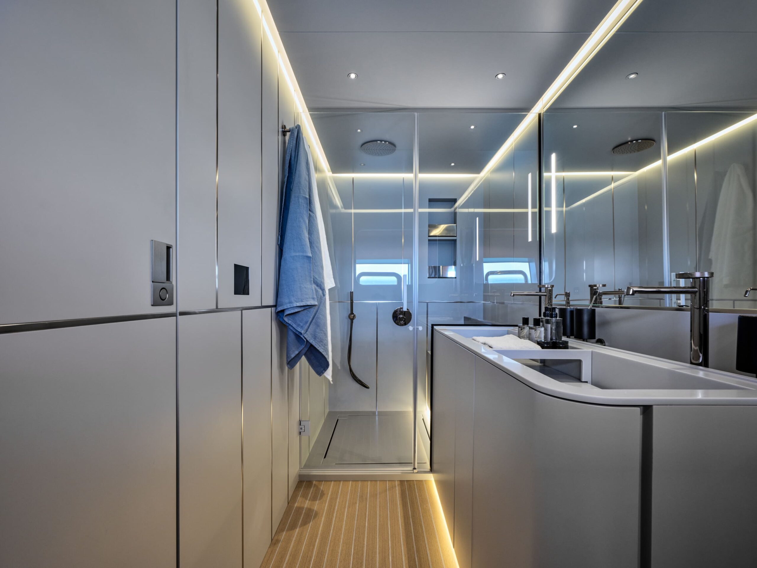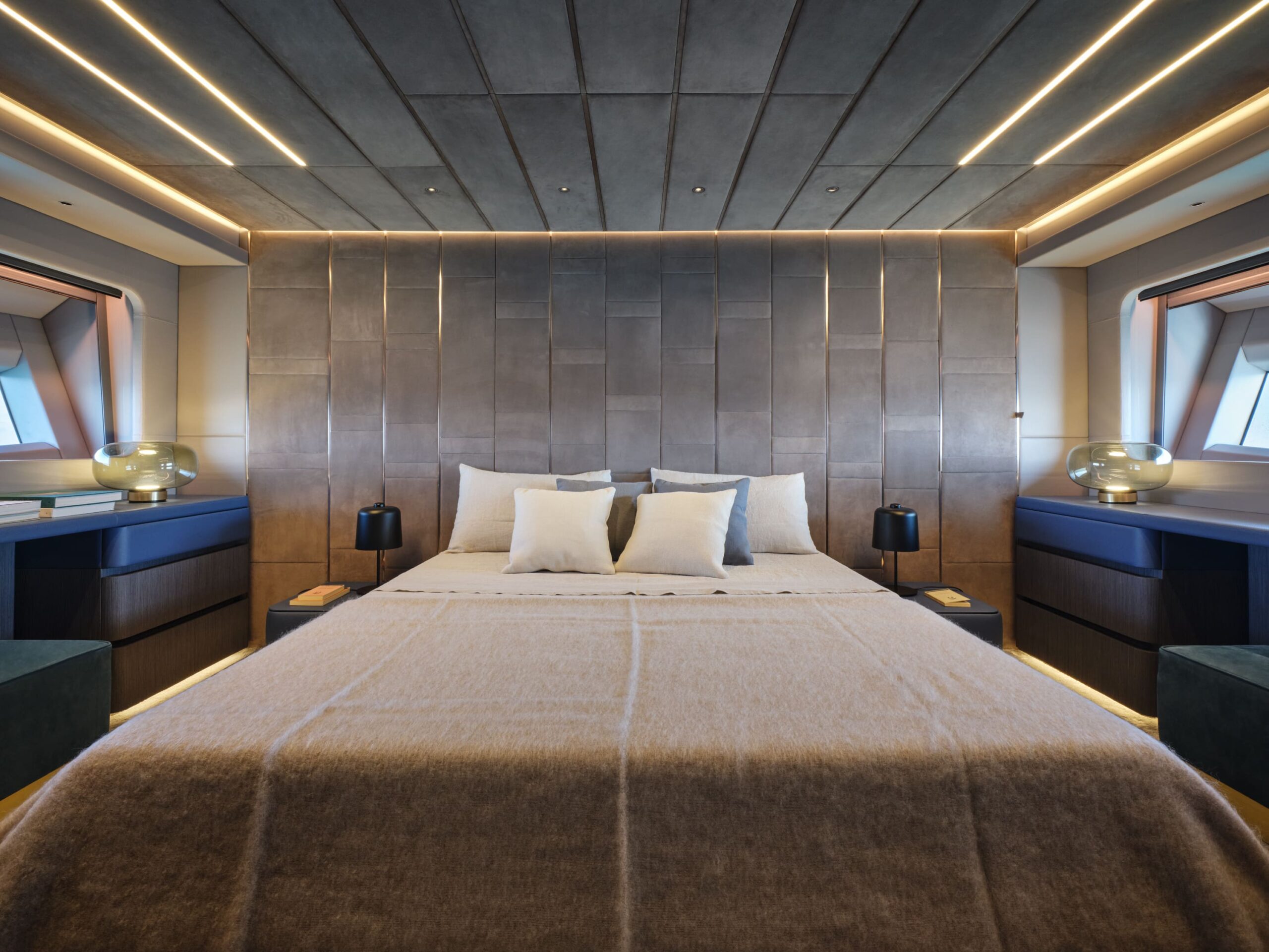 The AB 100's interiors are elevated by contemporary materials, ambient lighting, and electric blinds throughout, complemented by a seamless Crestron smart AV system with iPads in each cabin. The main salon features a 65” 4K Smart TV, a dedicated wine fridge, and an elegant dining area—blurring the lines between comfort, technology, and performance.
