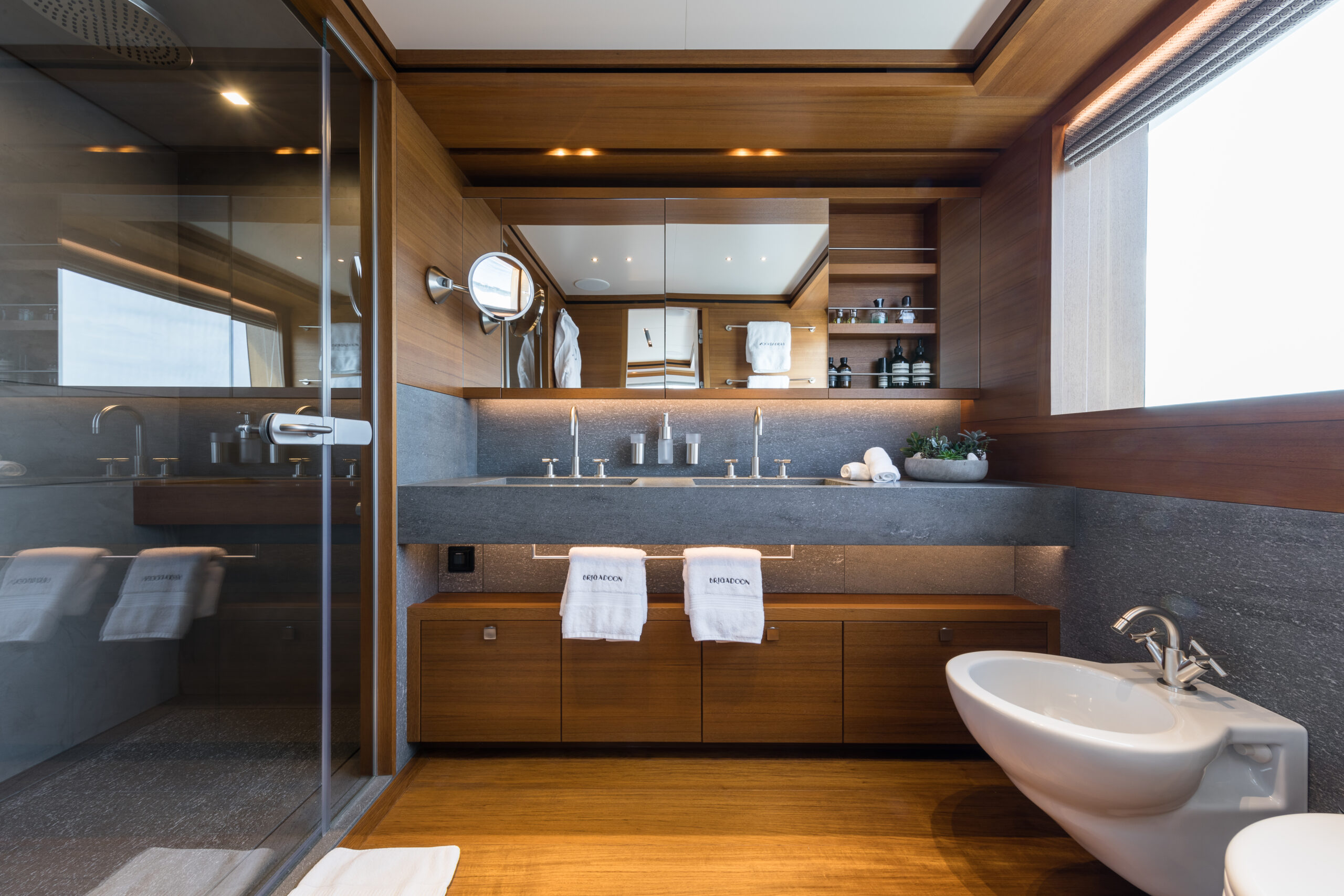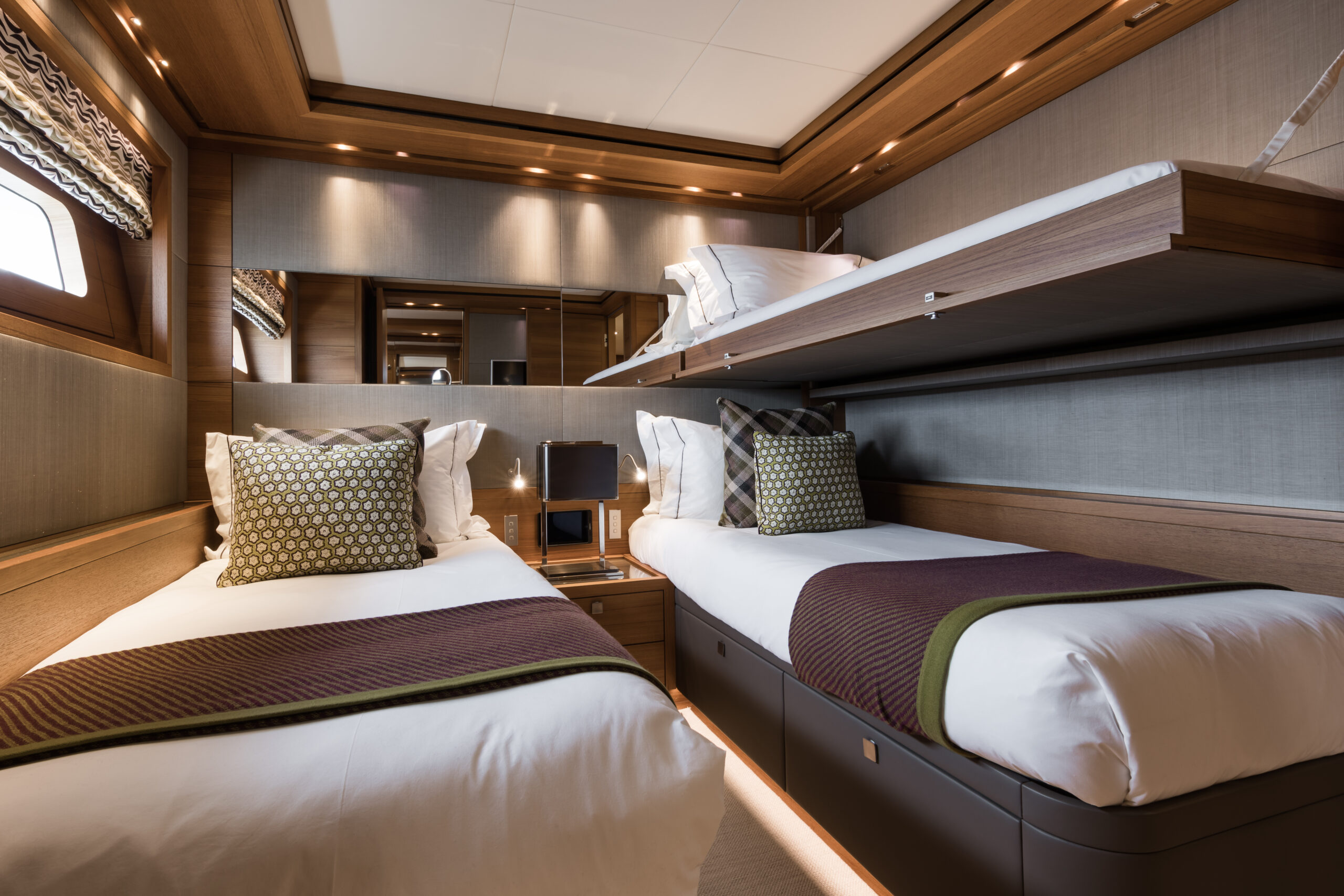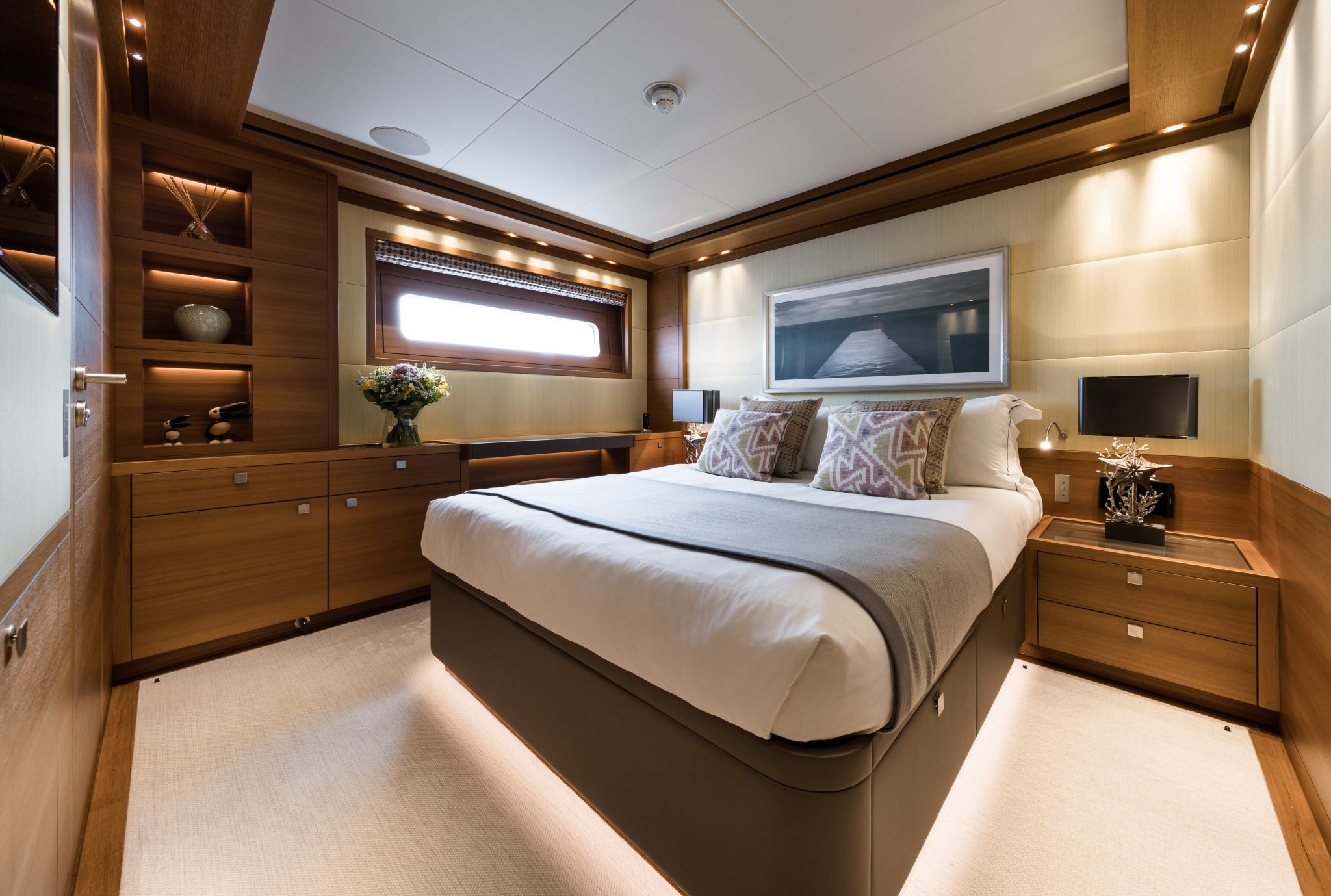 BRIGADOON accommodates twelve guests across five beautifully appointed staterooms, including a full-beam master suite that serves as a private, spacious retreat. The additional guest cabins, comprising a VIP and generous twins, are all equipped with ensuite facilities, ensuring exceptional comfort and privacy for all on board.