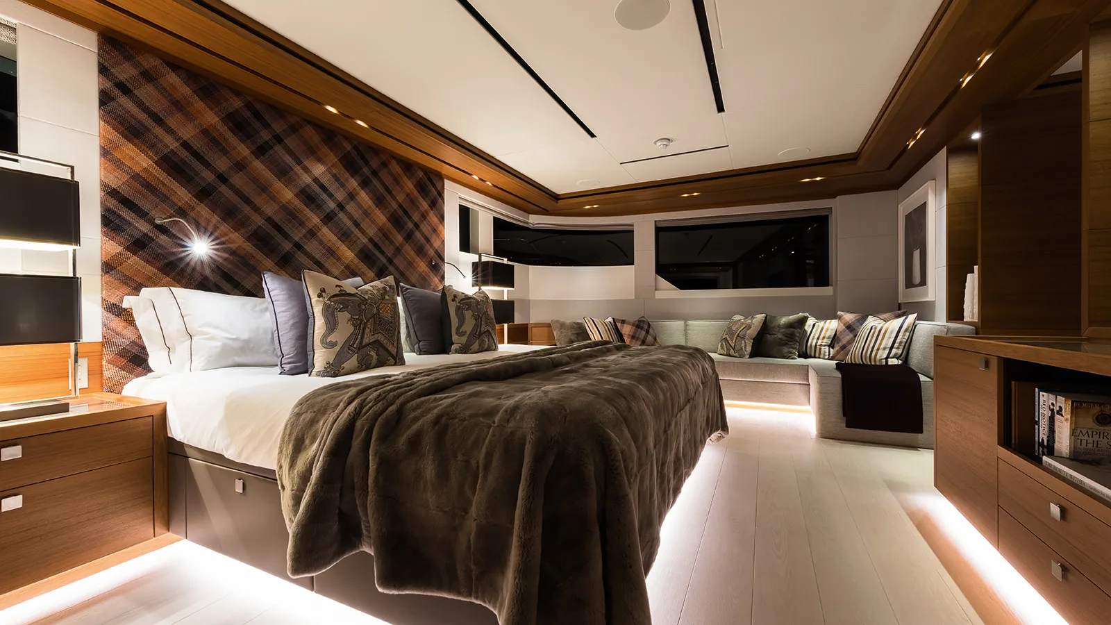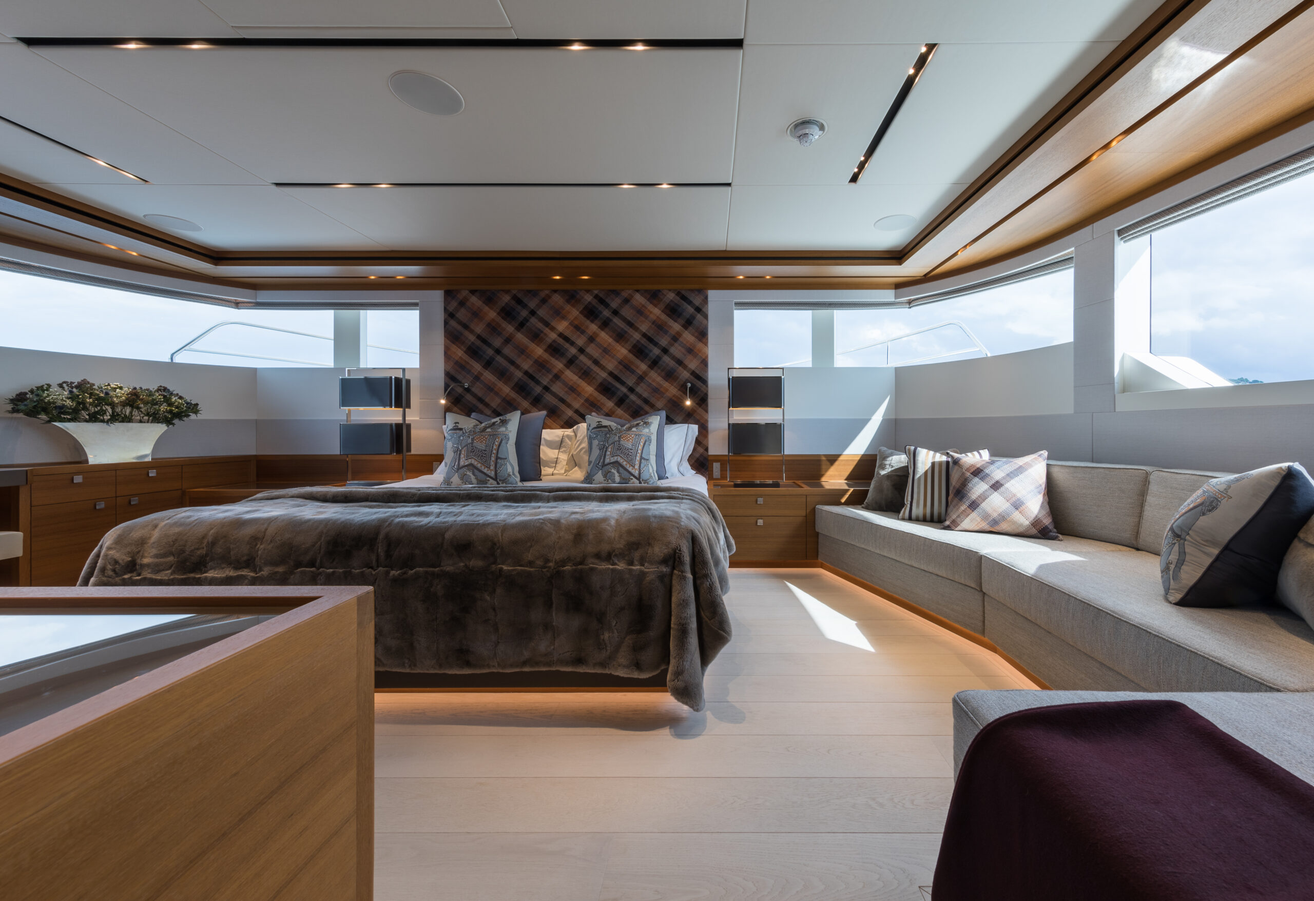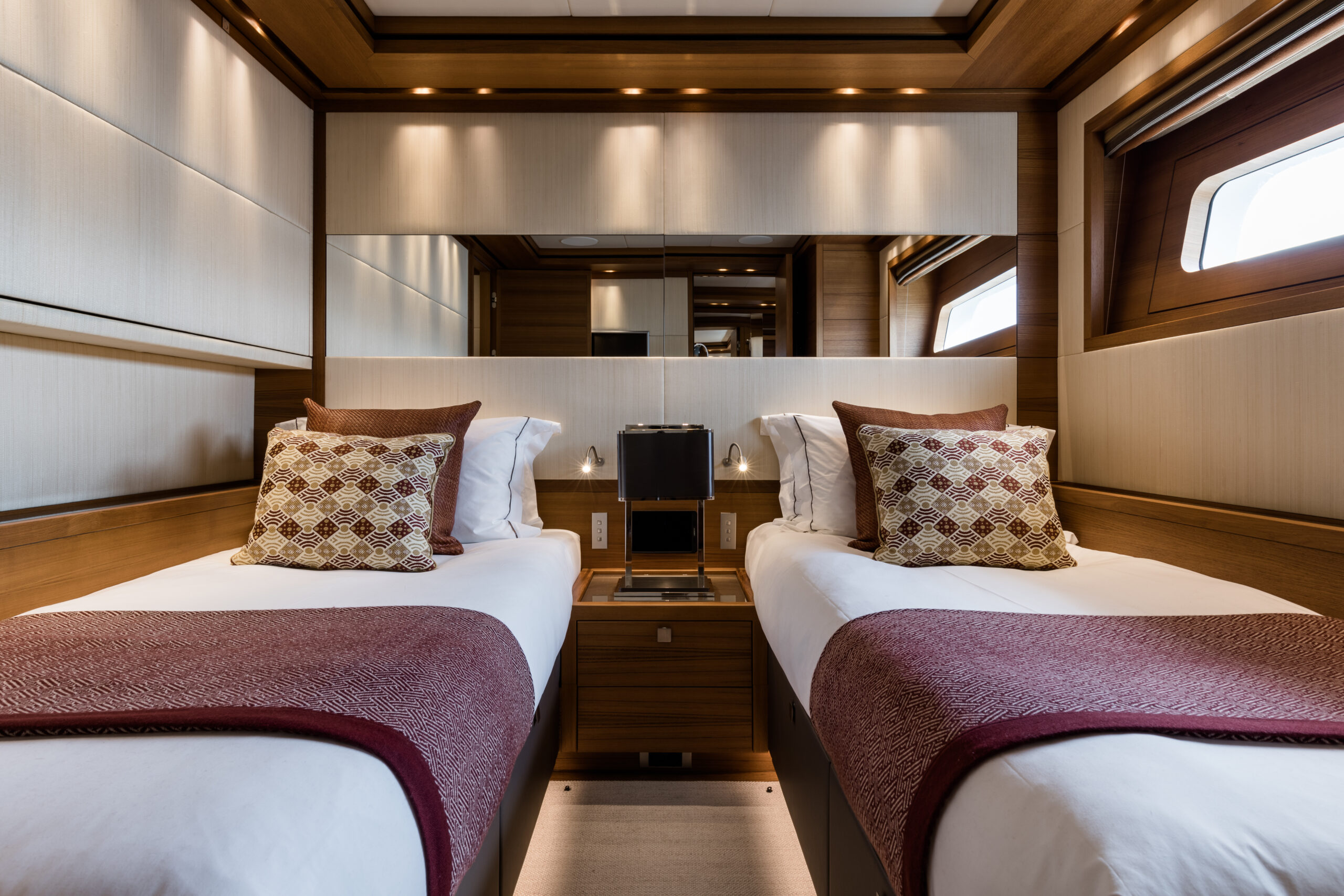 BRIGADOON accommodates twelve guests across five beautifully appointed staterooms, including a full-beam master suite that serves as a private, spacious retreat. The additional guest cabins, comprising a VIP and generous twins, are all equipped with ensuite facilities, ensuring exceptional comfort and privacy for all on board.