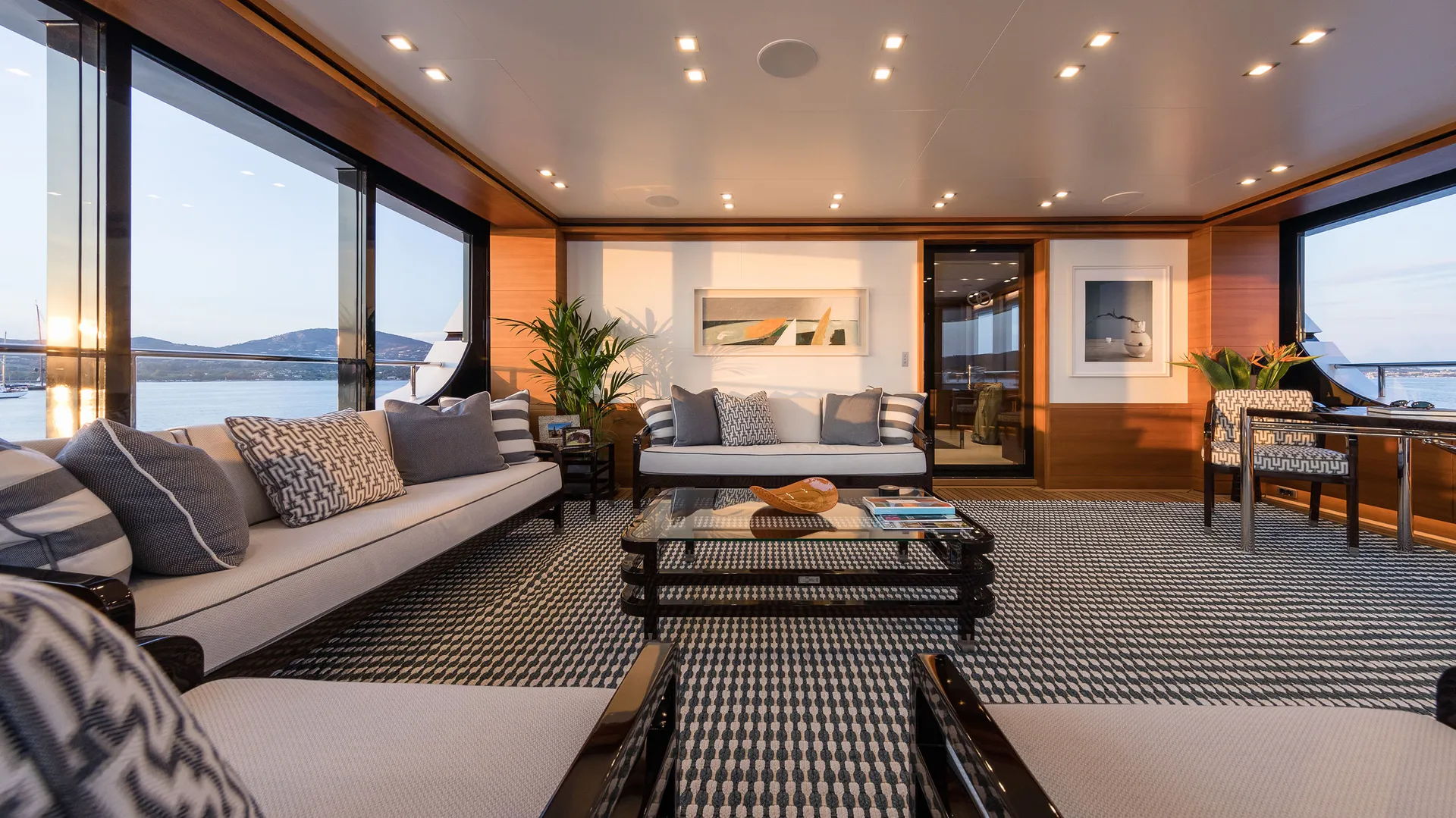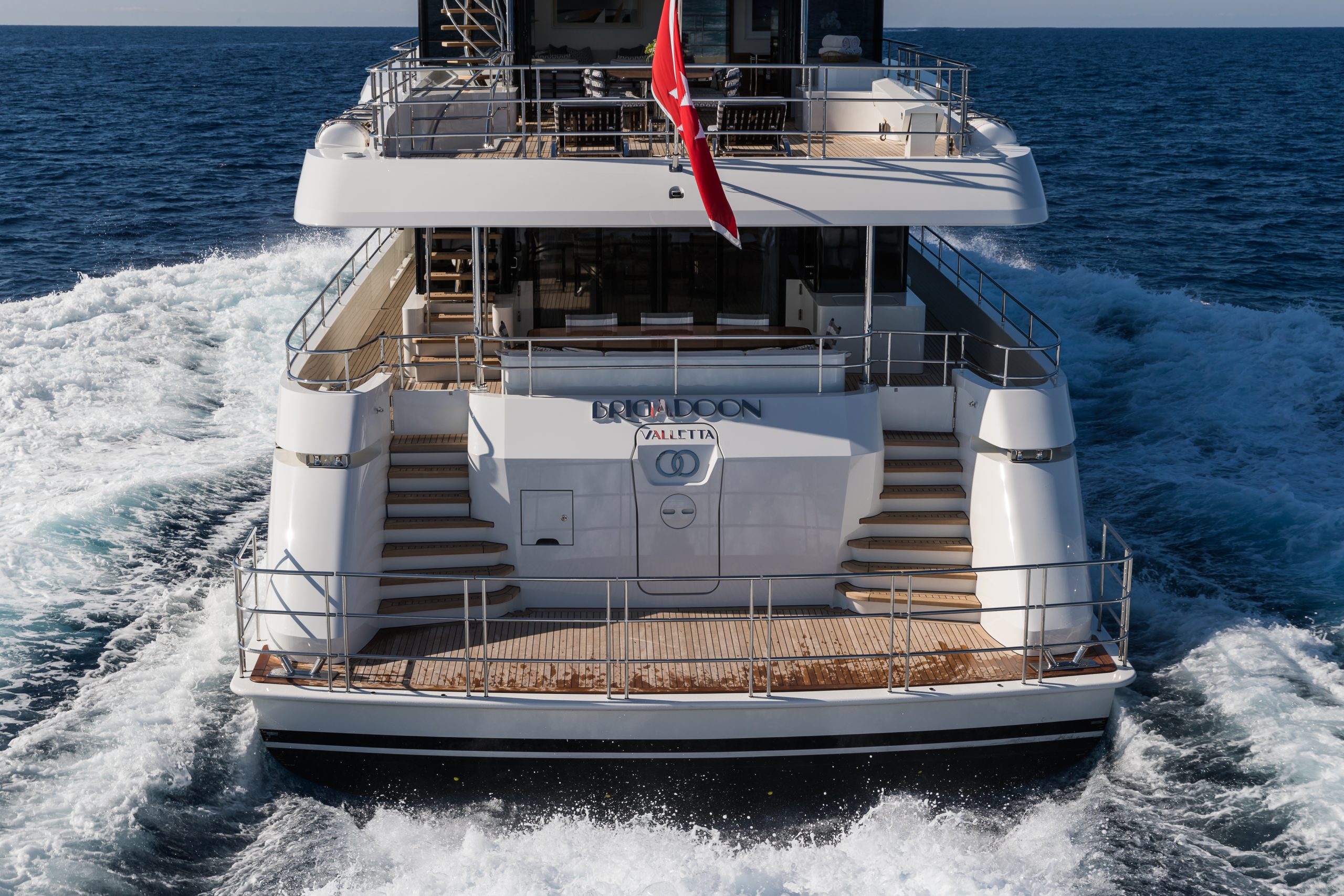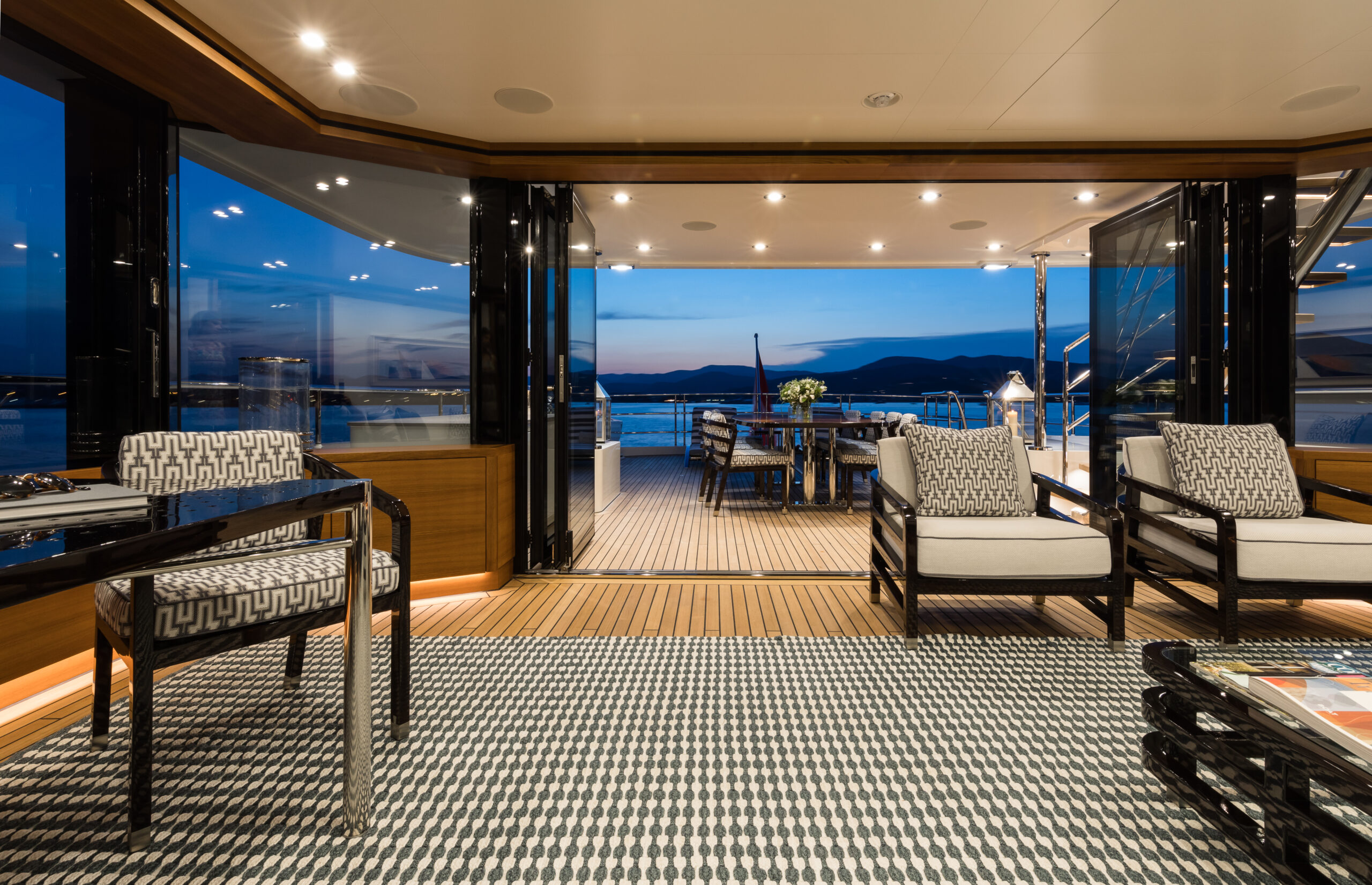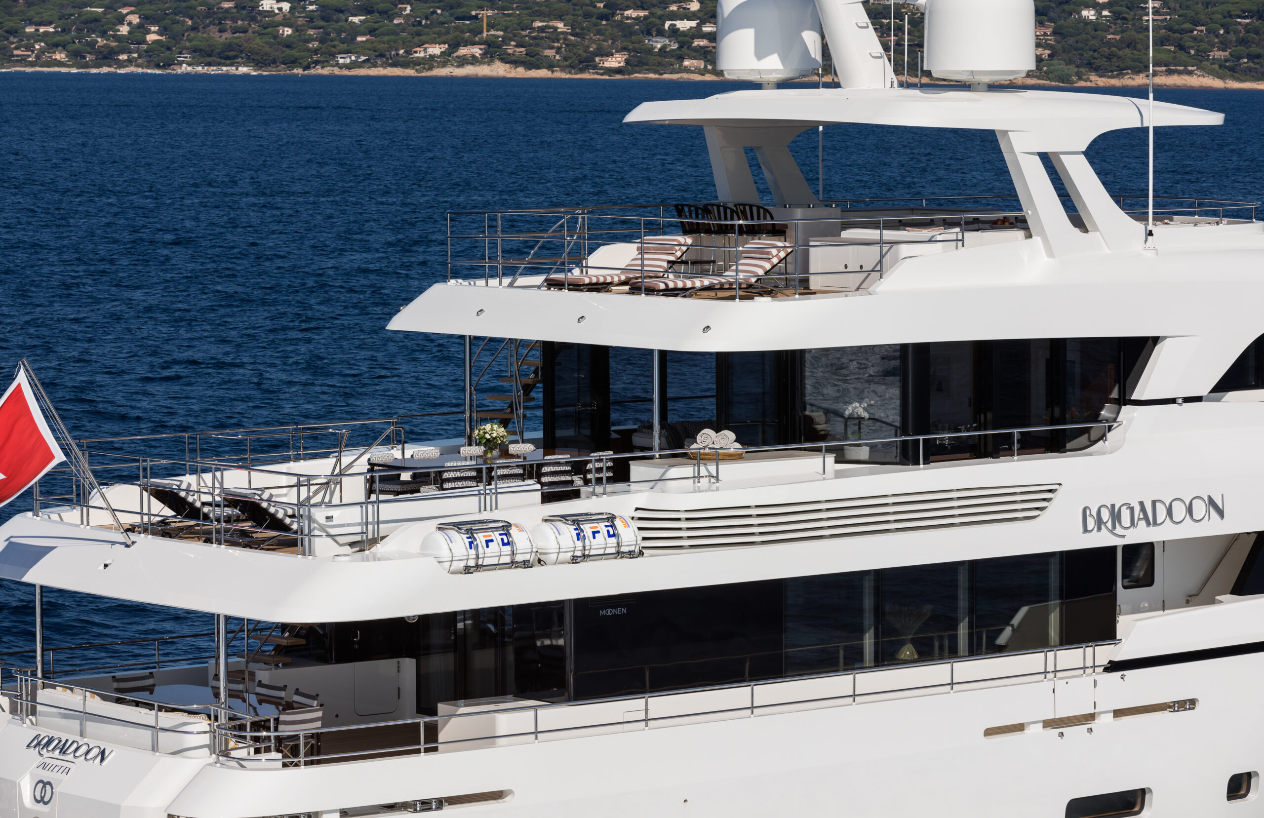 BRIGADOON’s sophisticated outdoor areas are designed for seamless entertainment. Her sun deck features a bar and loungers, while the innovative enclosed Winter Garden on the bridge deck offers a climate-controlled space with panoramic views. The main deck aft provides ample space for alfresco dining, creating a perfect flow for socialising at anchor or underway.