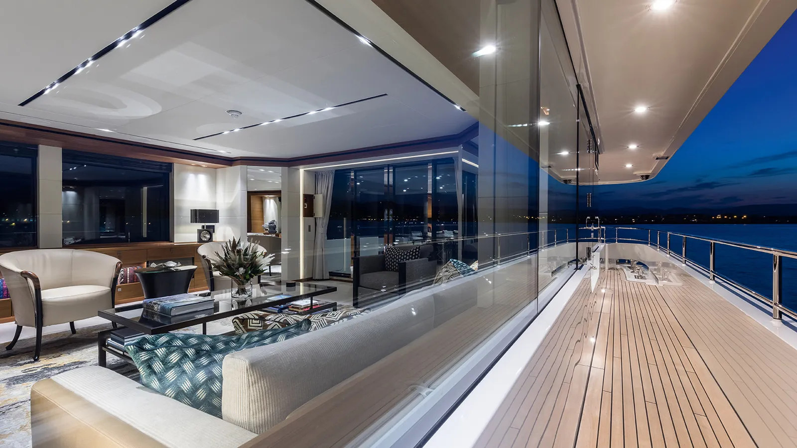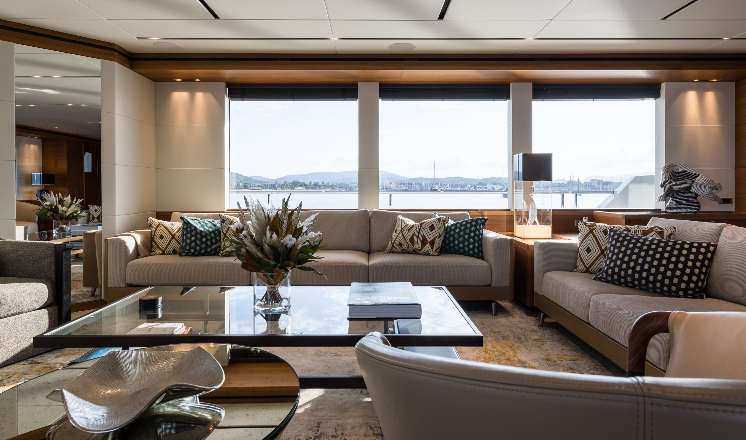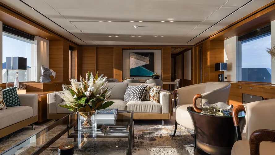 Inside, the artistry of London's Studio Indigo is revealed in a light-filled interior that blends classic and contemporary elegance. The use of natural oak, soft leather, and rich stone creates a warm and inviting atmosphere throughout the main saloon and guest areas, offering a serene and timeless sanctuary at sea.