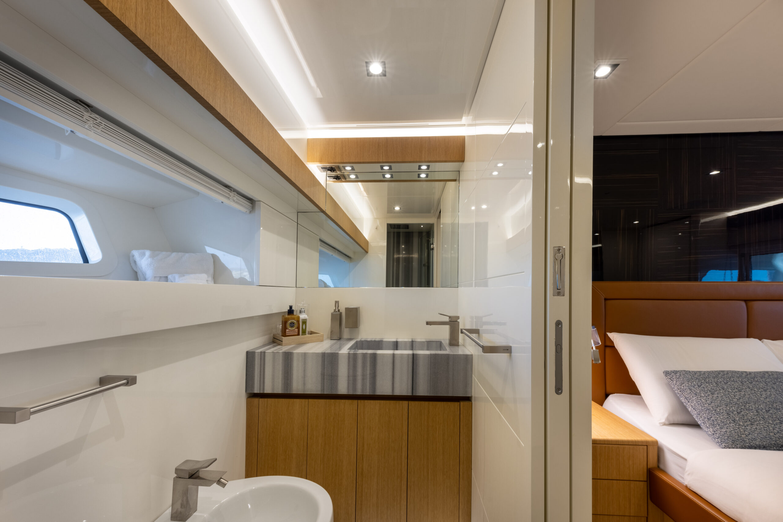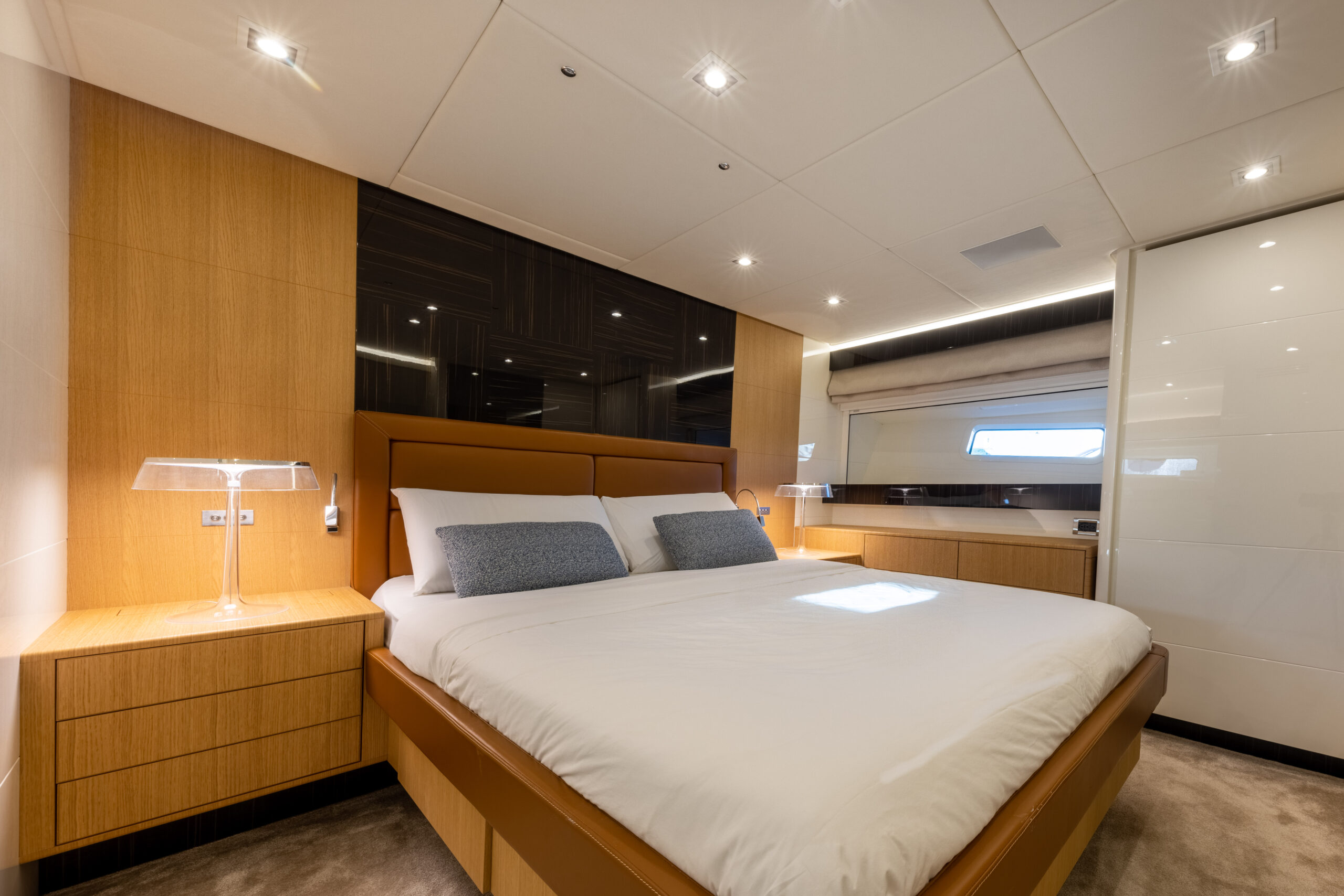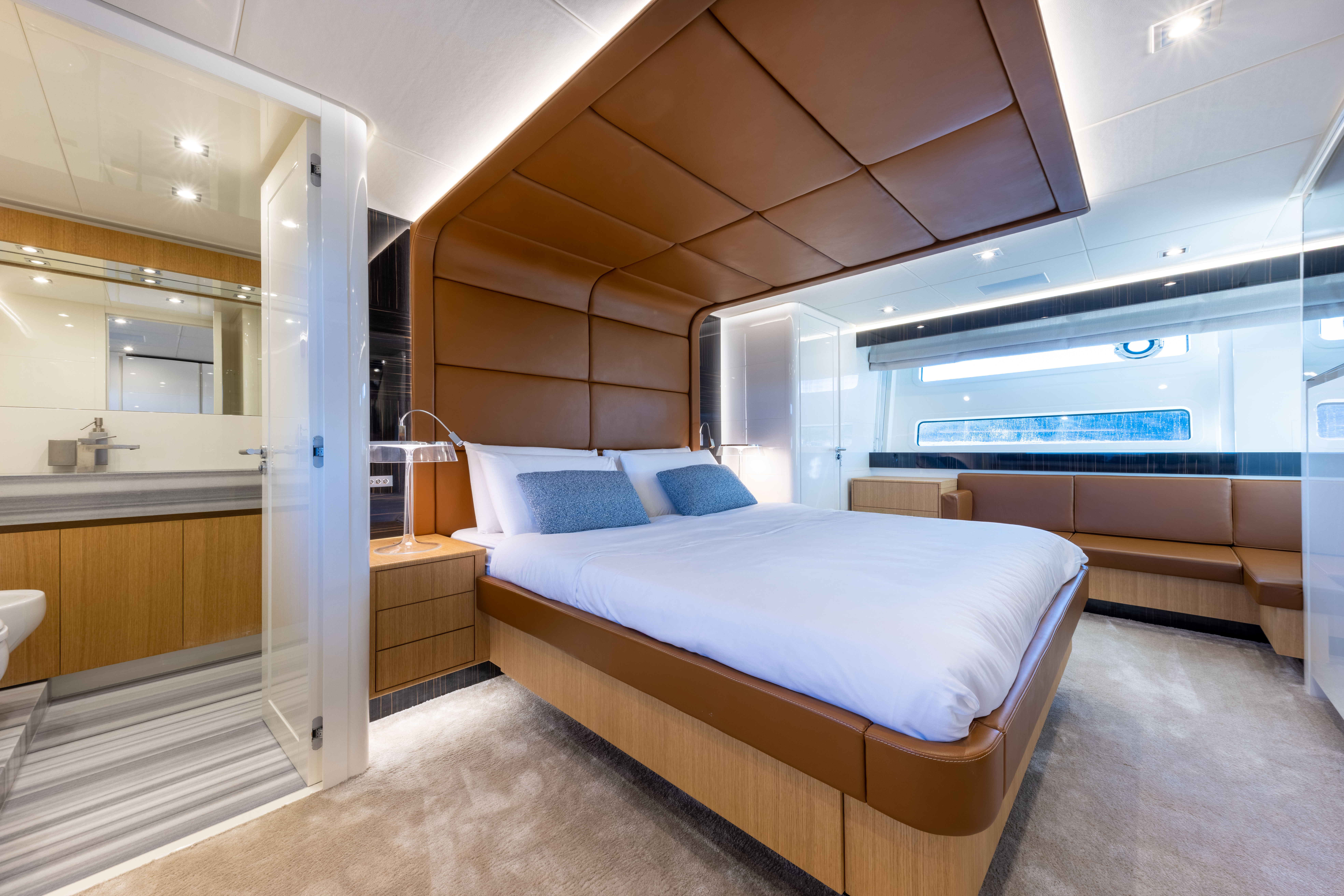 With a cruising speed of 27 knots and a top speed of 32 knots, driven by twin Caterpillar C32 Acert engines, she is designed to deliver both exhilaration and poise. Her lightweight Aramat/Kevlar hull and carbon fibre hardtop speak to a relentless pursuit of innovation and structural refinement.
