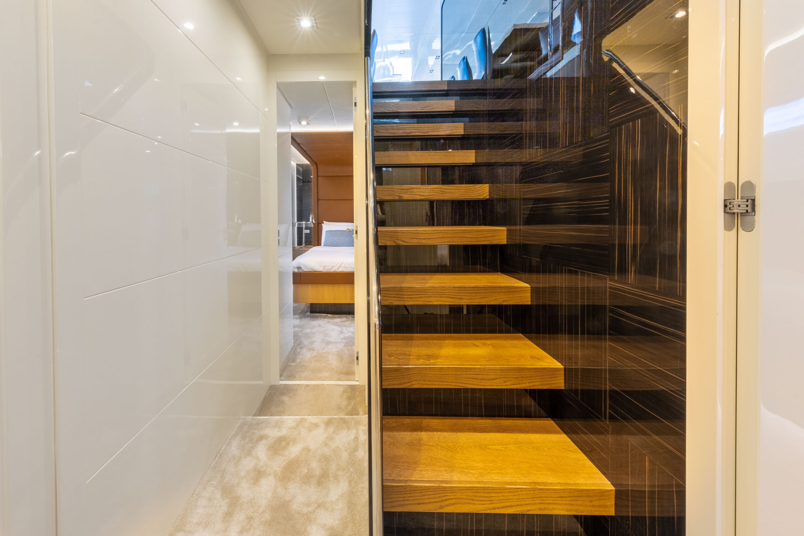 She accommodates up to 9 guests across four luxurious en-suite staterooms: a full-beam master, a VIP cabin, and two twin cabins (one with a Pullman berth). Crew quarters for three ensure discreet, full-time service and operational ease.