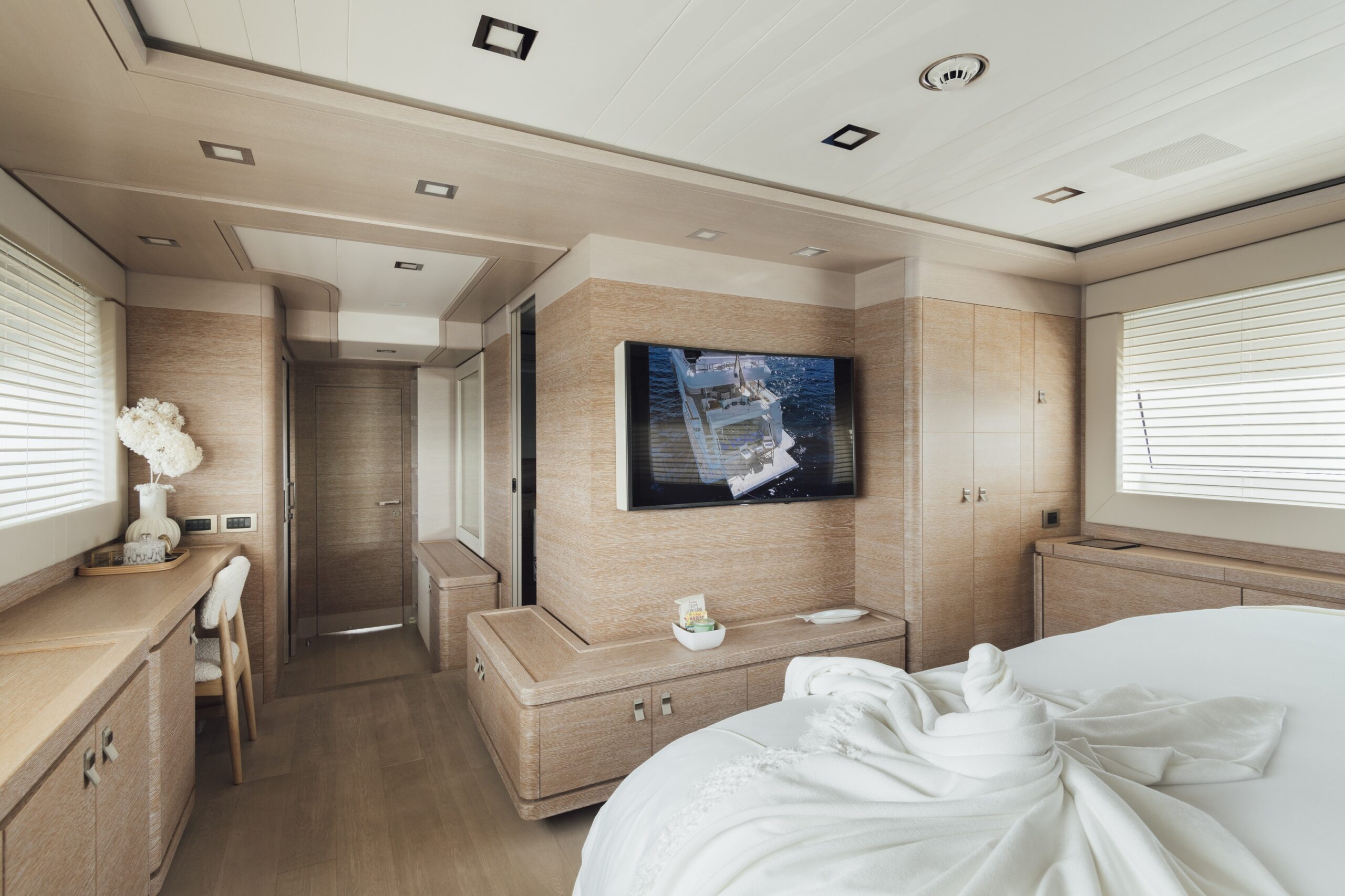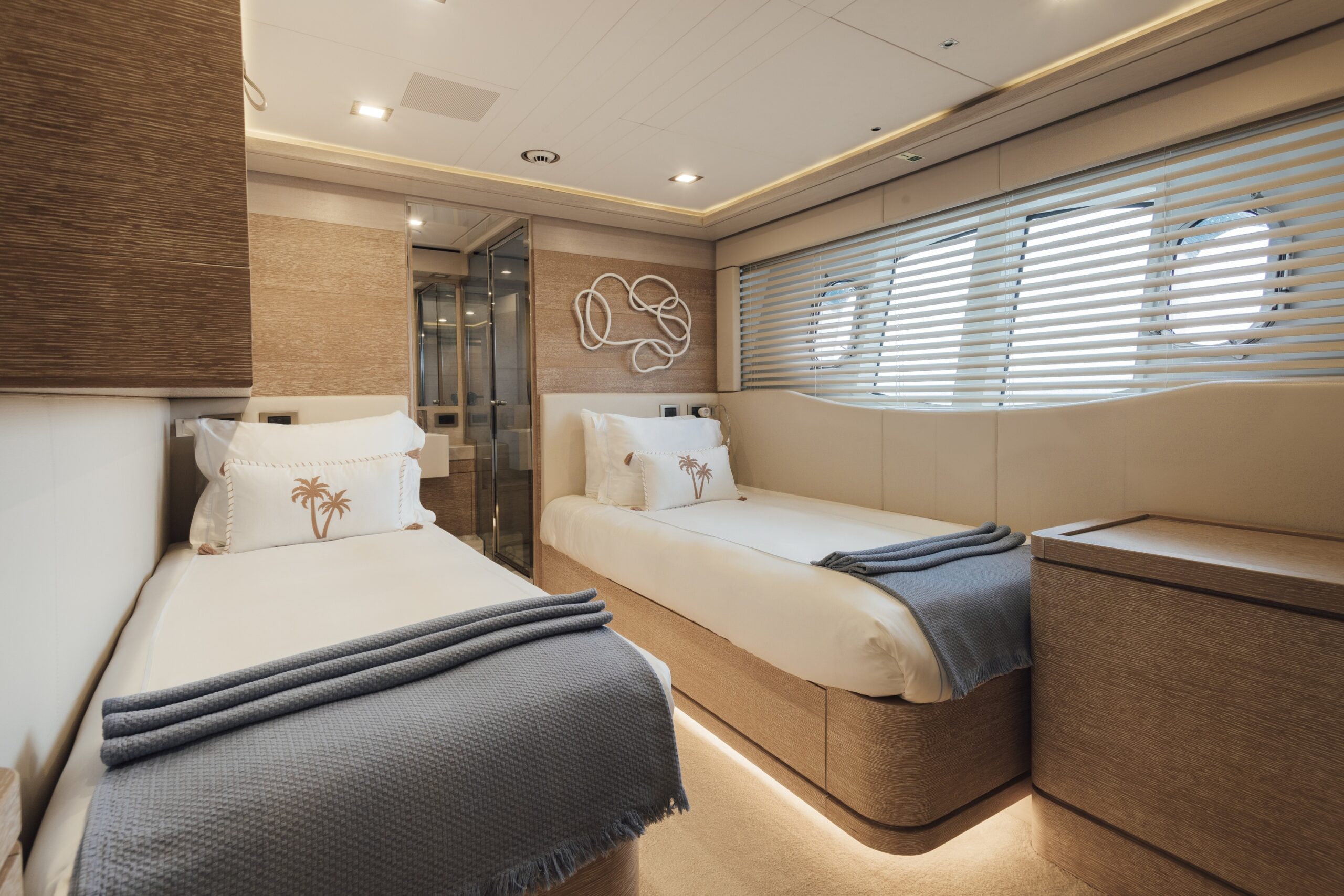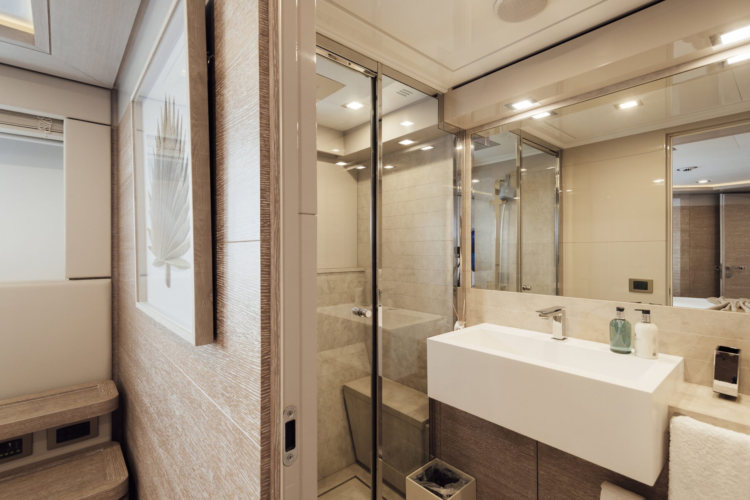 Perfect for use as a family yacht, CENTURION’s guest accommodation is located on the lower deck and includes one double, two convertible and one twin cabin set around a central lobby. Light and open, each of the guest cabins comes with built-in storage plus ensuite bathroom facilities.