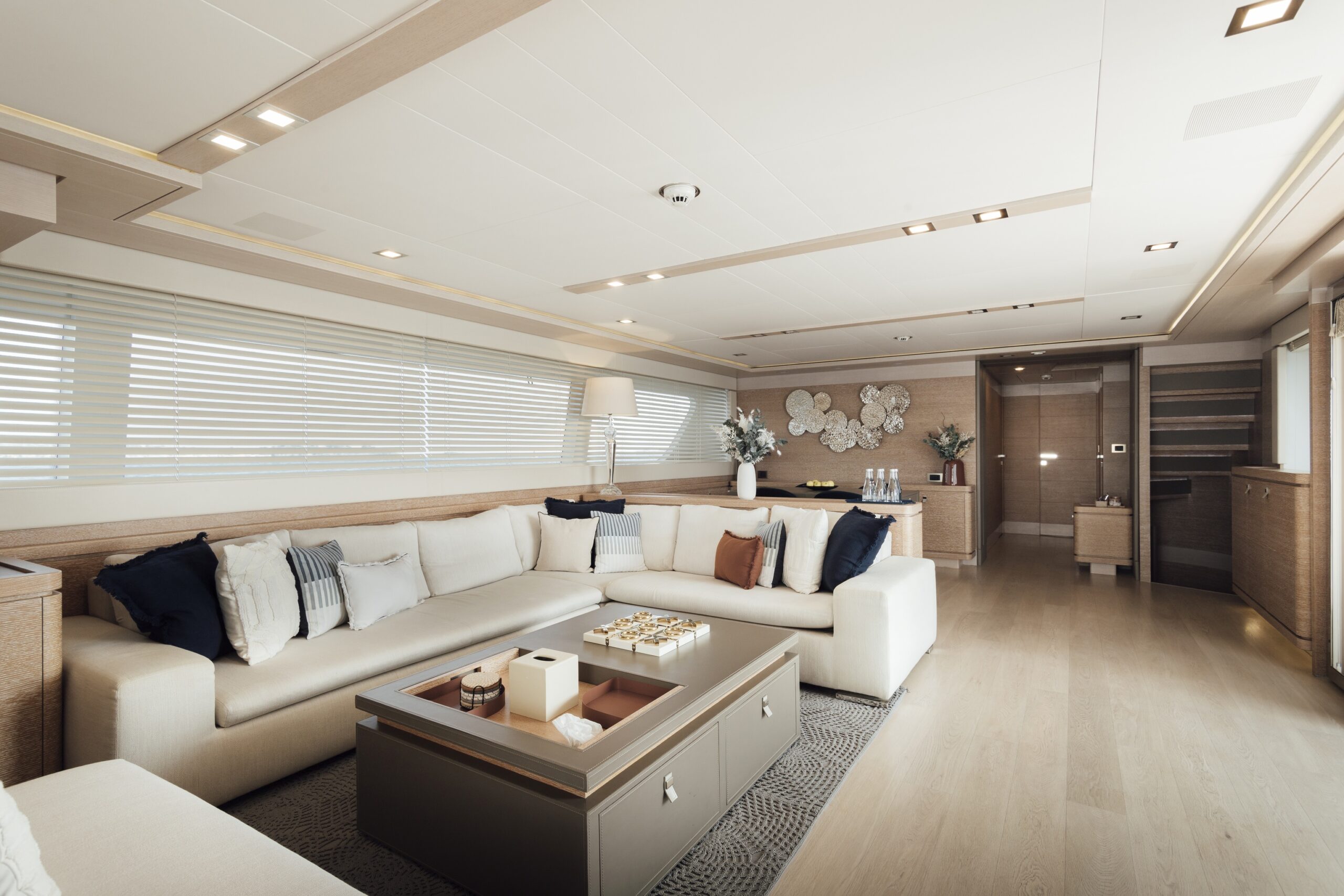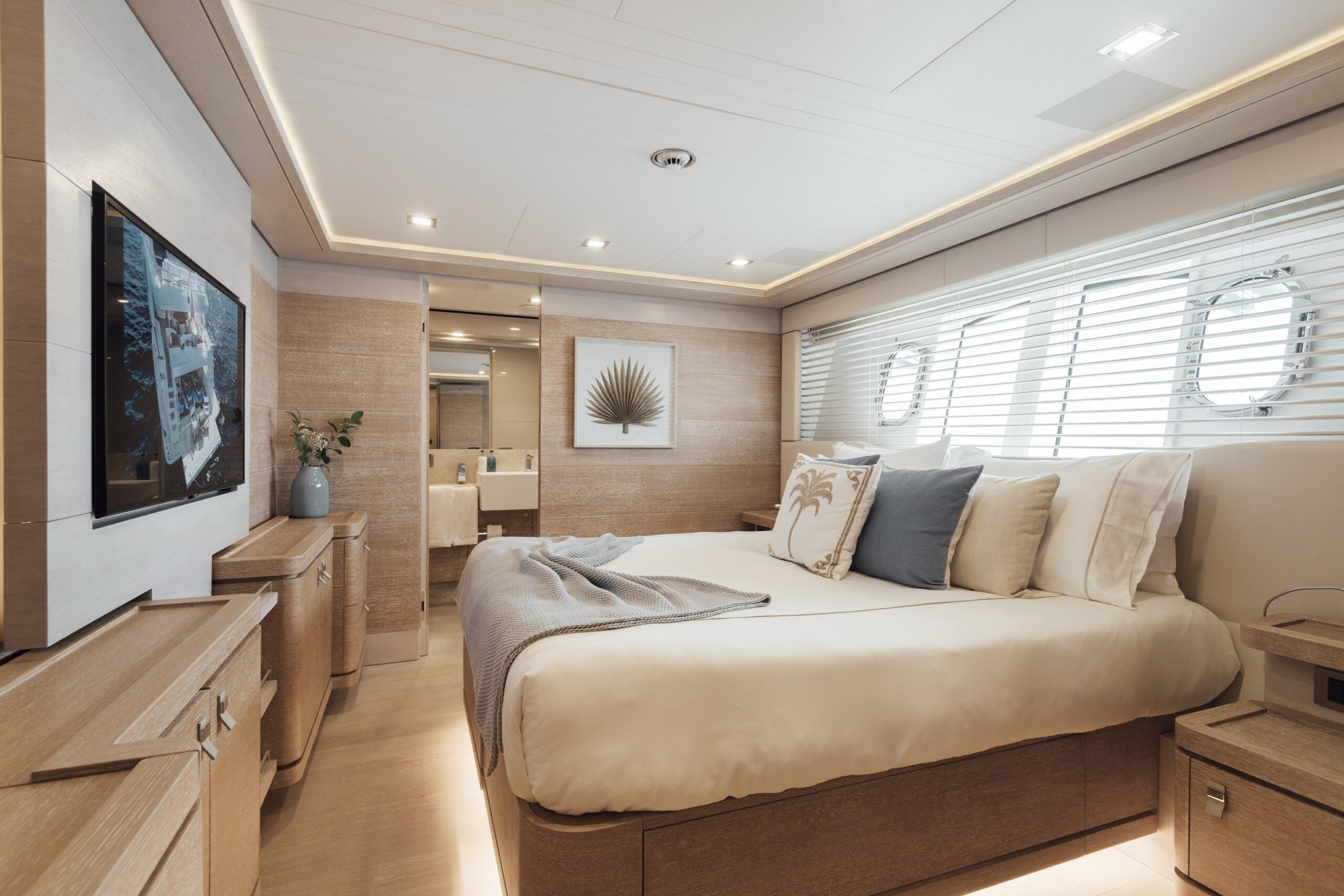The interior of the Navetta 33 features high-quality materials with a modern design sensibility. Neutral tones are paired with luxurious finishes, creating a warm and inviting atmosphere that balances sophistication with comfort.