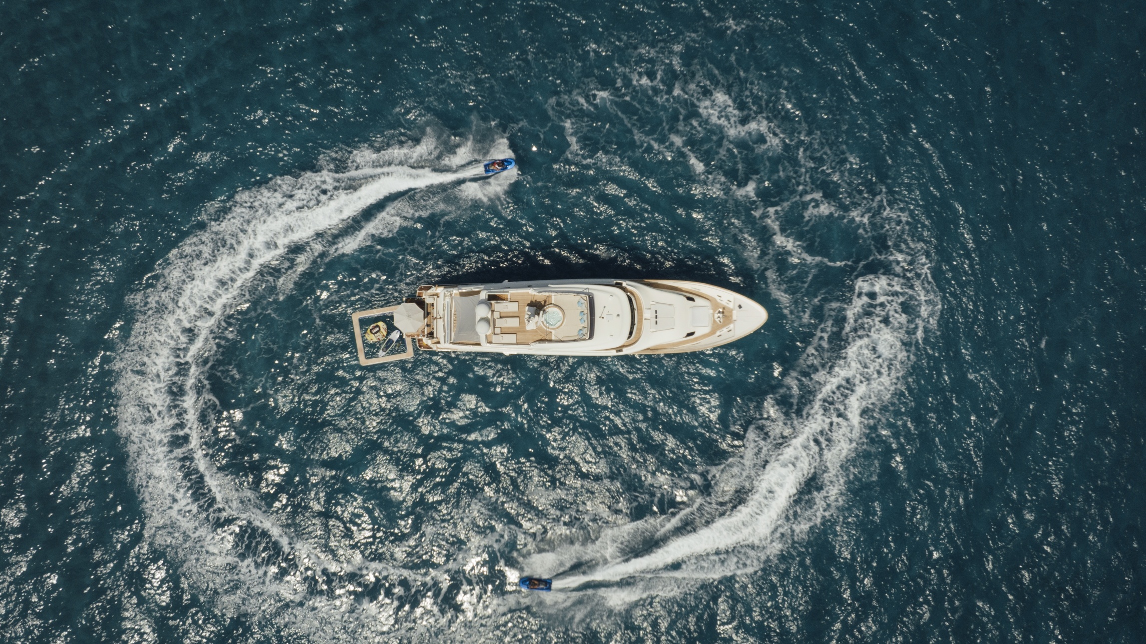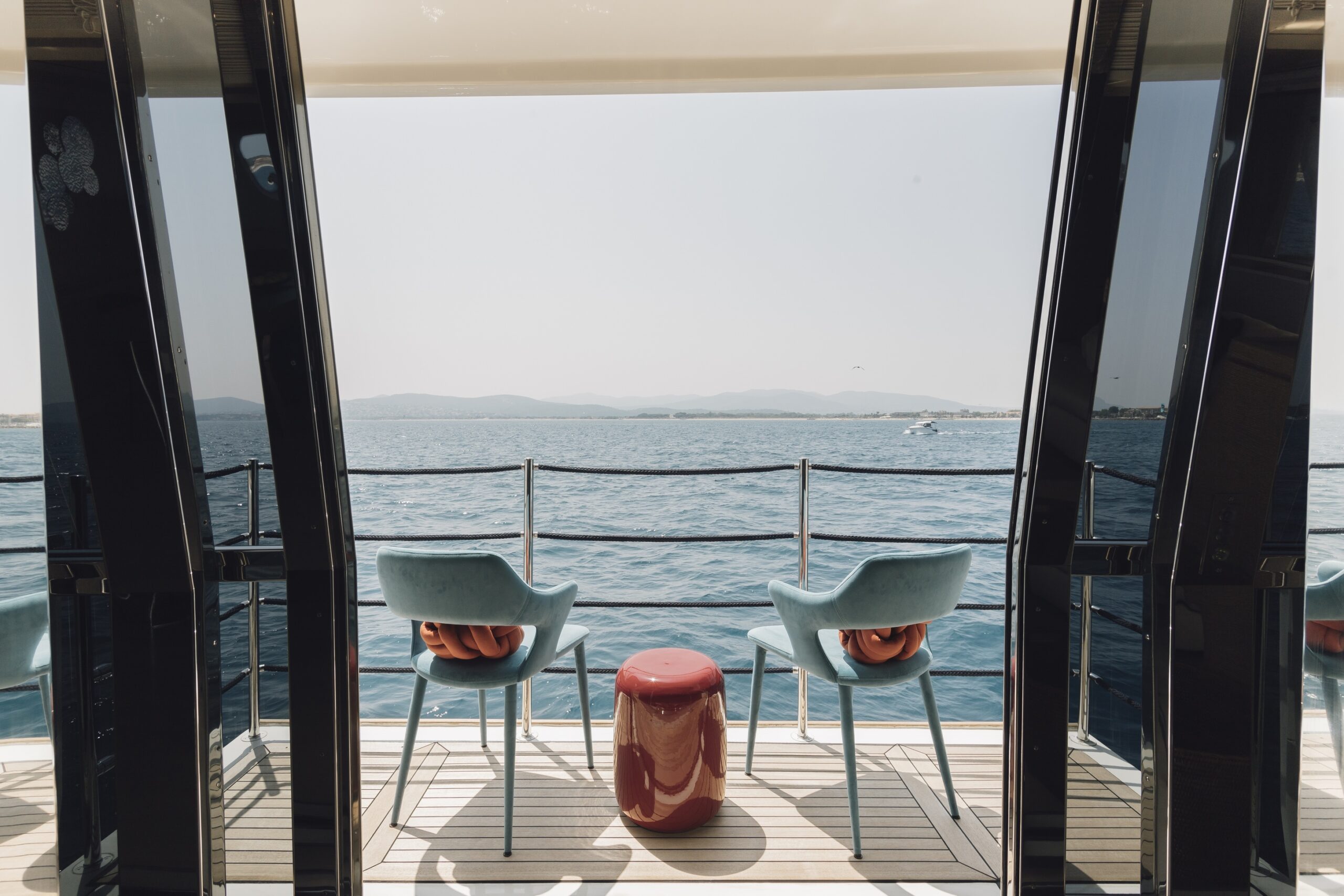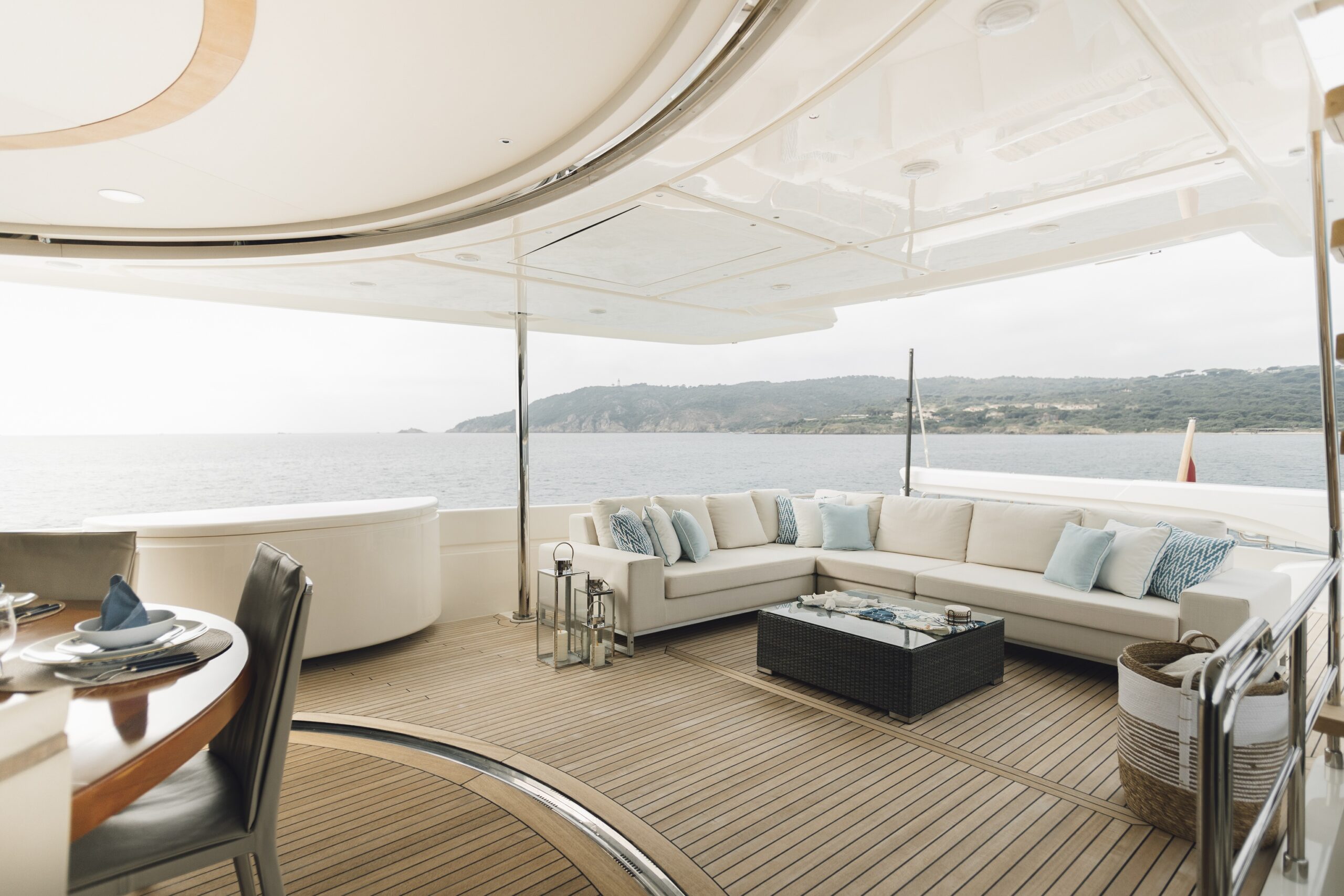 The top sundeck holds three individual sunbeds and a sprawling open sofa – plenty of room for everyone to relax together. In the center of the sundeck is a fold-open grill and cooking area, perfect for informal alfresco dining. Beneath is a further teak-topped deck with an outdoors-to-indoor flow, allowing for shelter from the heat of the day while benefitting from any cool breezes.