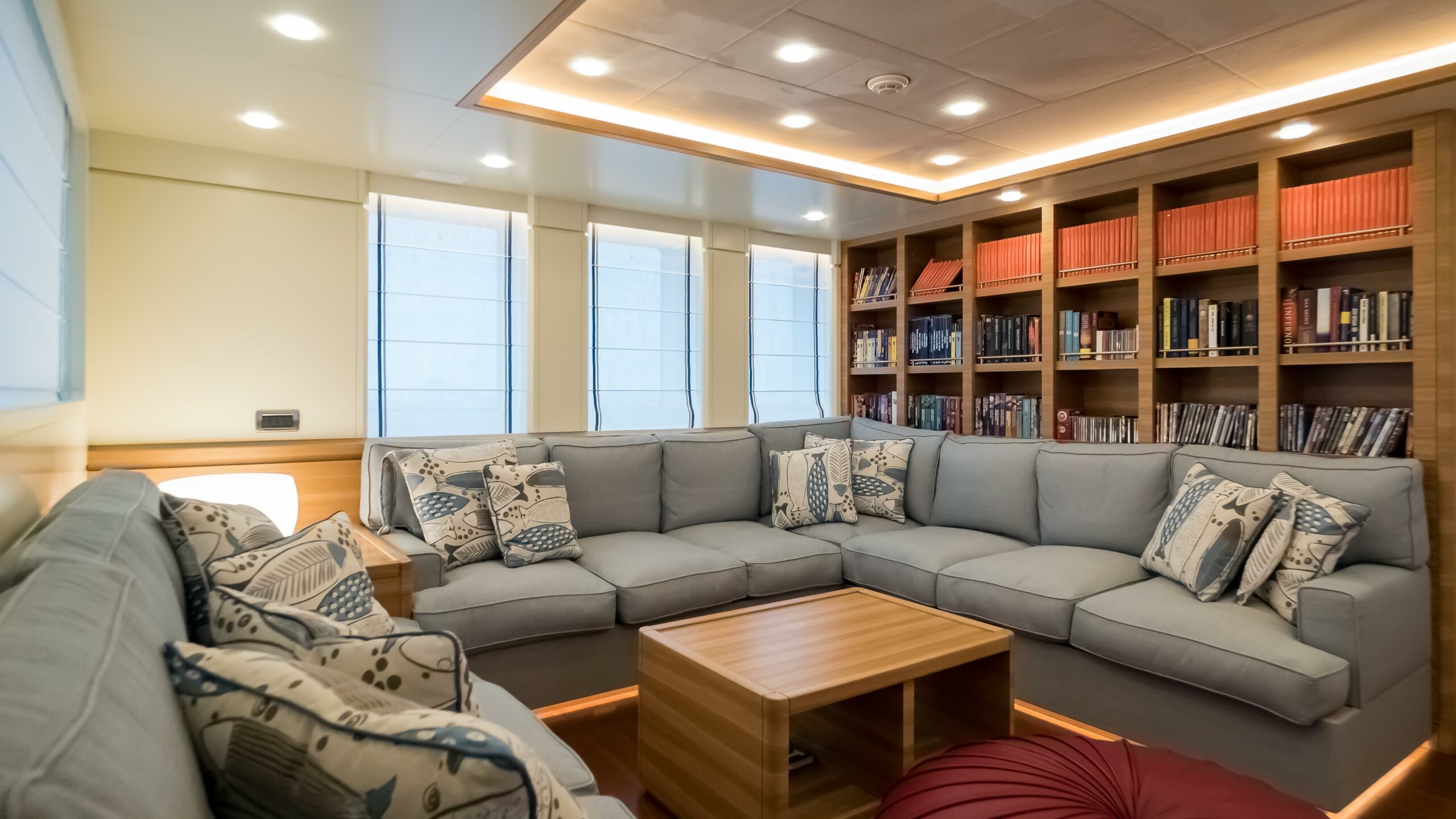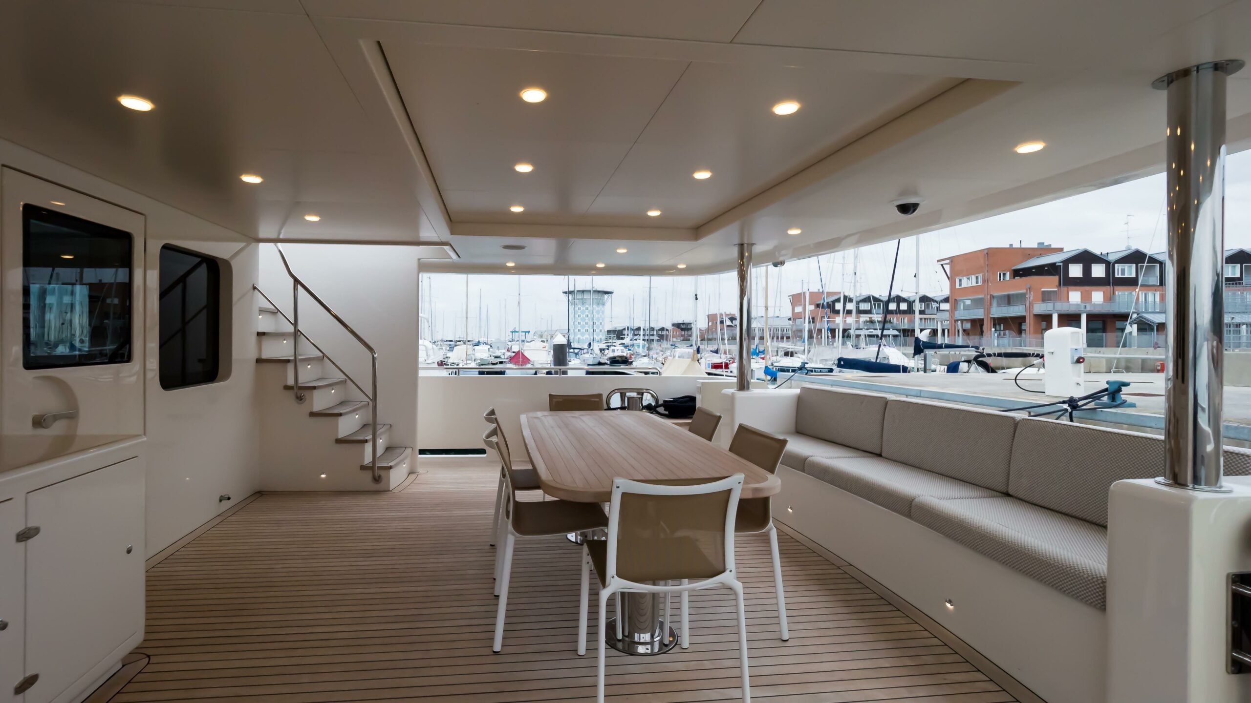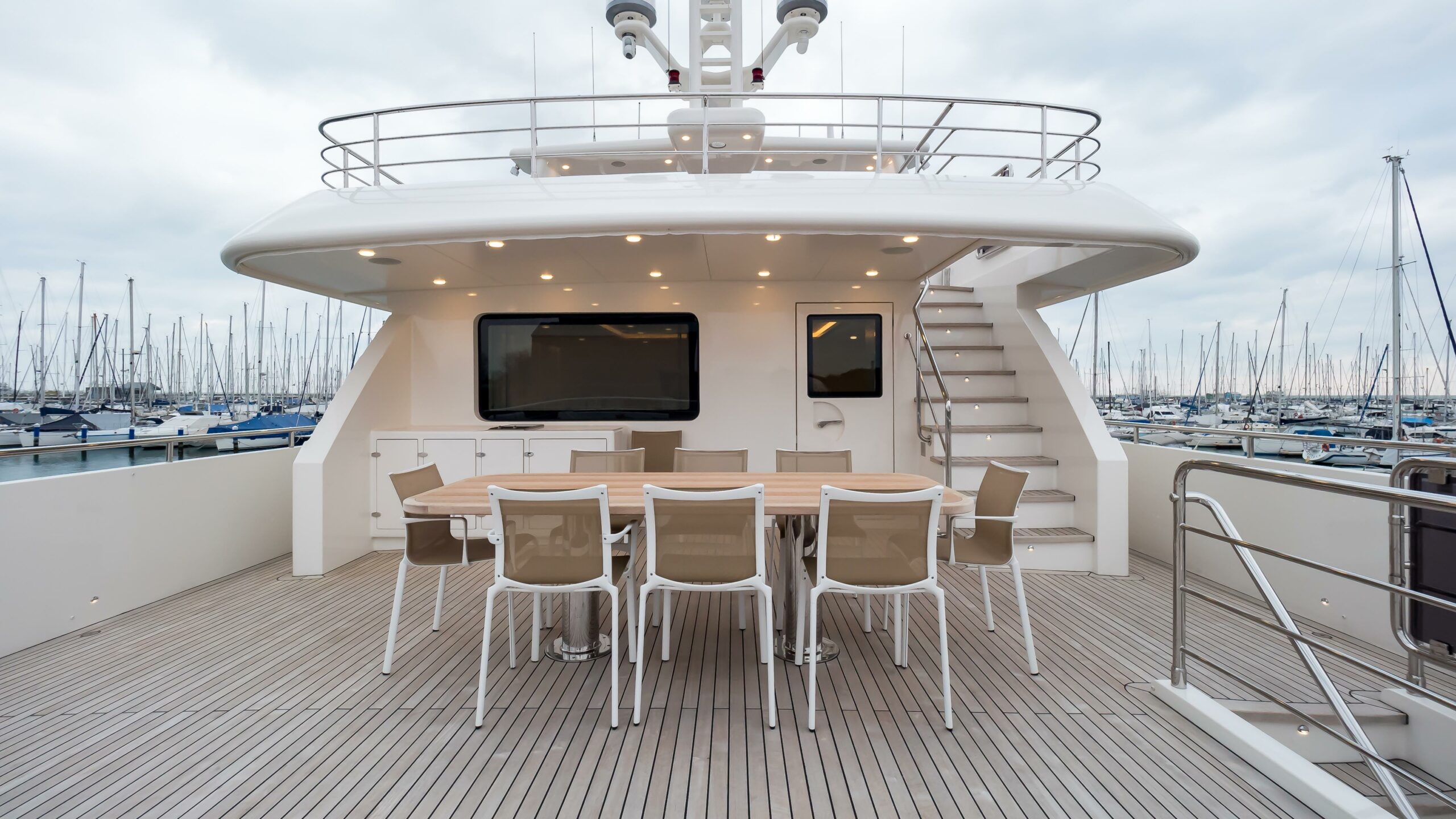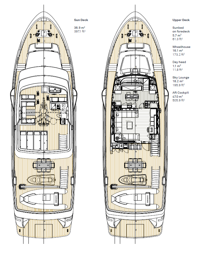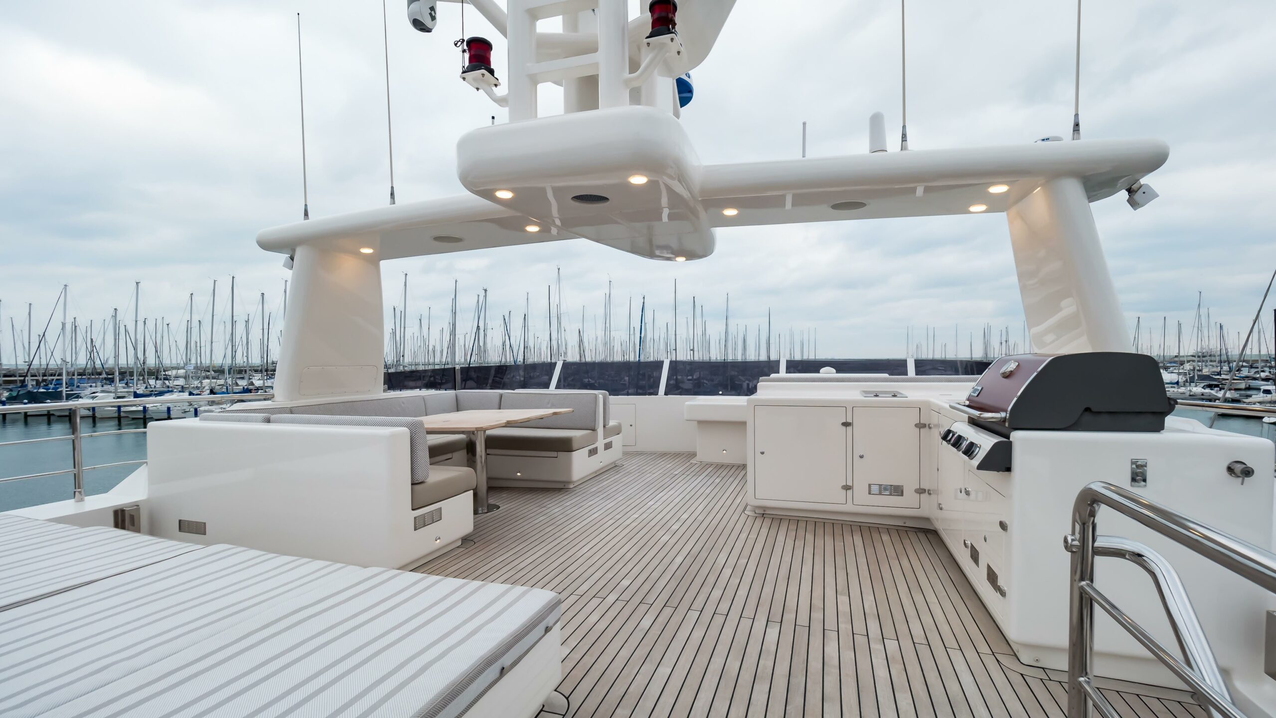 Outdoor living is equally well considered, with a 6m tender stored on the bridge deck, expansive teak-decked lounging and dining areas on the sundeck and foredeck, and multiple wet bars, BBQs, and fridges throughout. Entertainment is served via a full suite of Bose surround systems, Samsung smart TVs, and an integrated Sonos audio network across all decks.