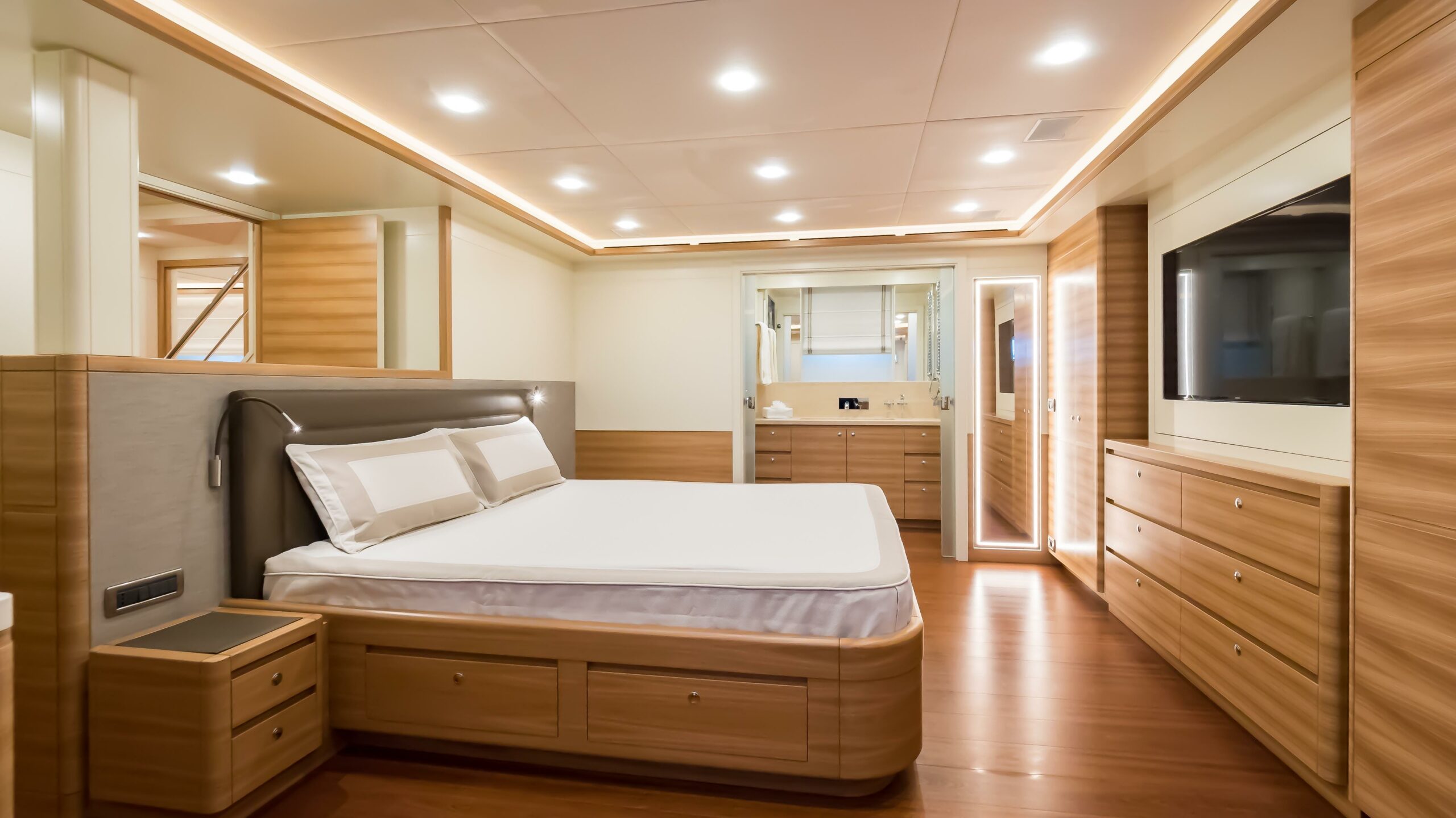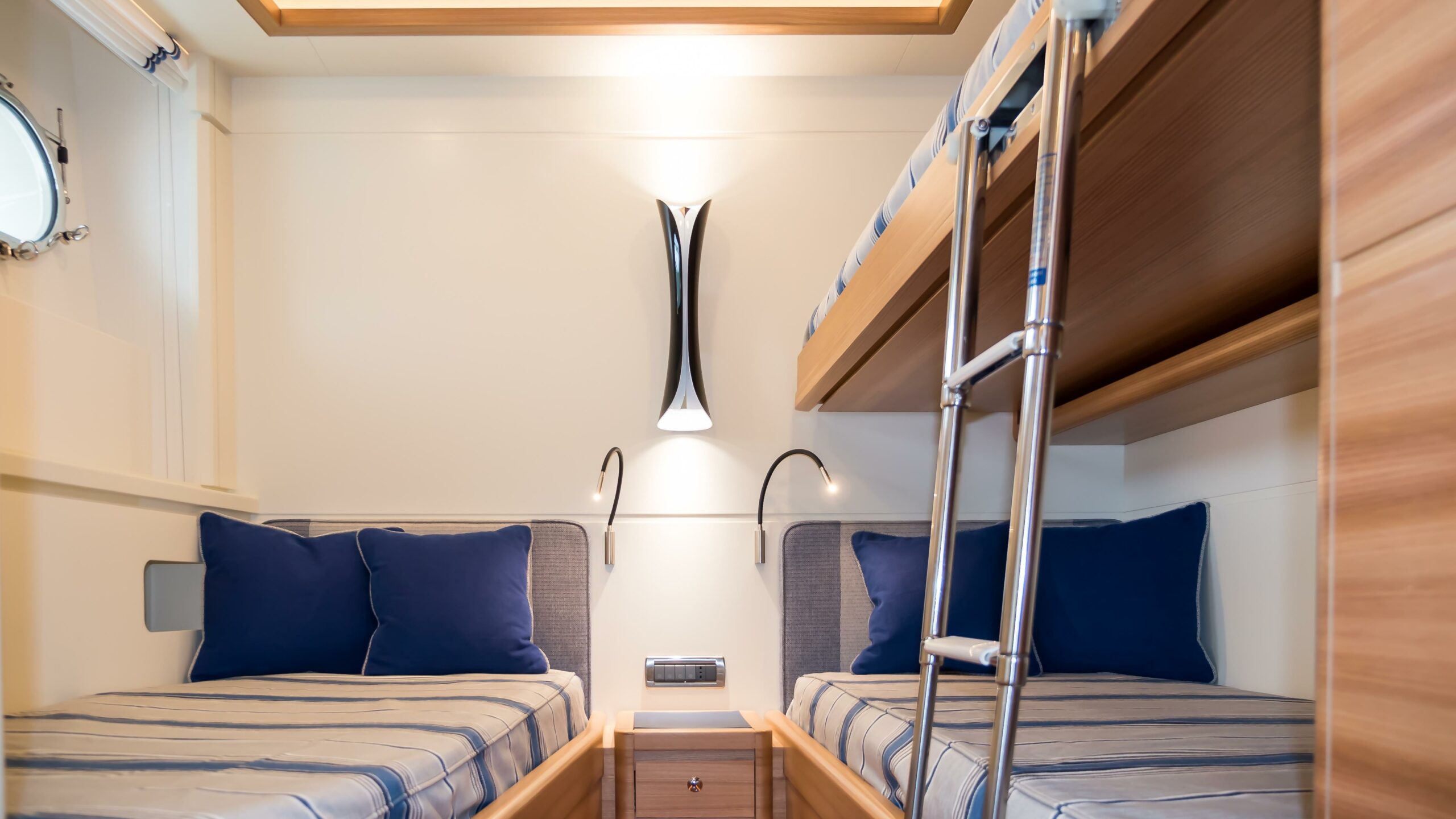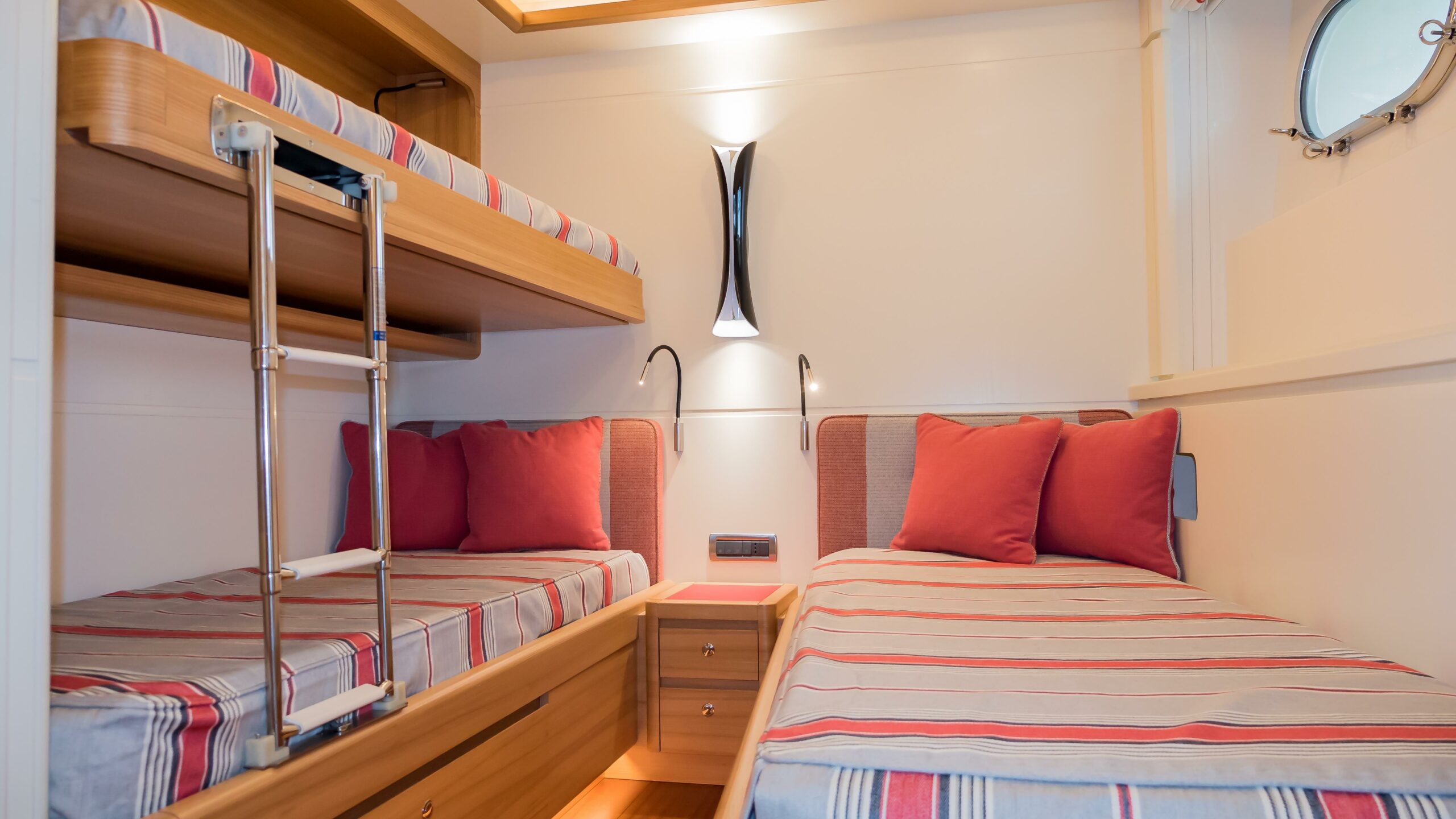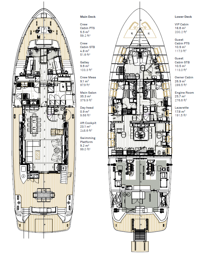Accommodating up to 10 guests in 4 en-suite staterooms, including a full-beam master suite positioned amidships in the most stable part of the yacht, her interior features natural elm wood, iroko floors, and high 2.10m ceilings. Two double guest cabins and one twin with Pullman berths complete the guest layout. Separate crew quarters for 4 crew in 2 en-suite cabins, along with a dedicated crew mess and galley access via the side decks, ensure smooth and discreet service onboard.