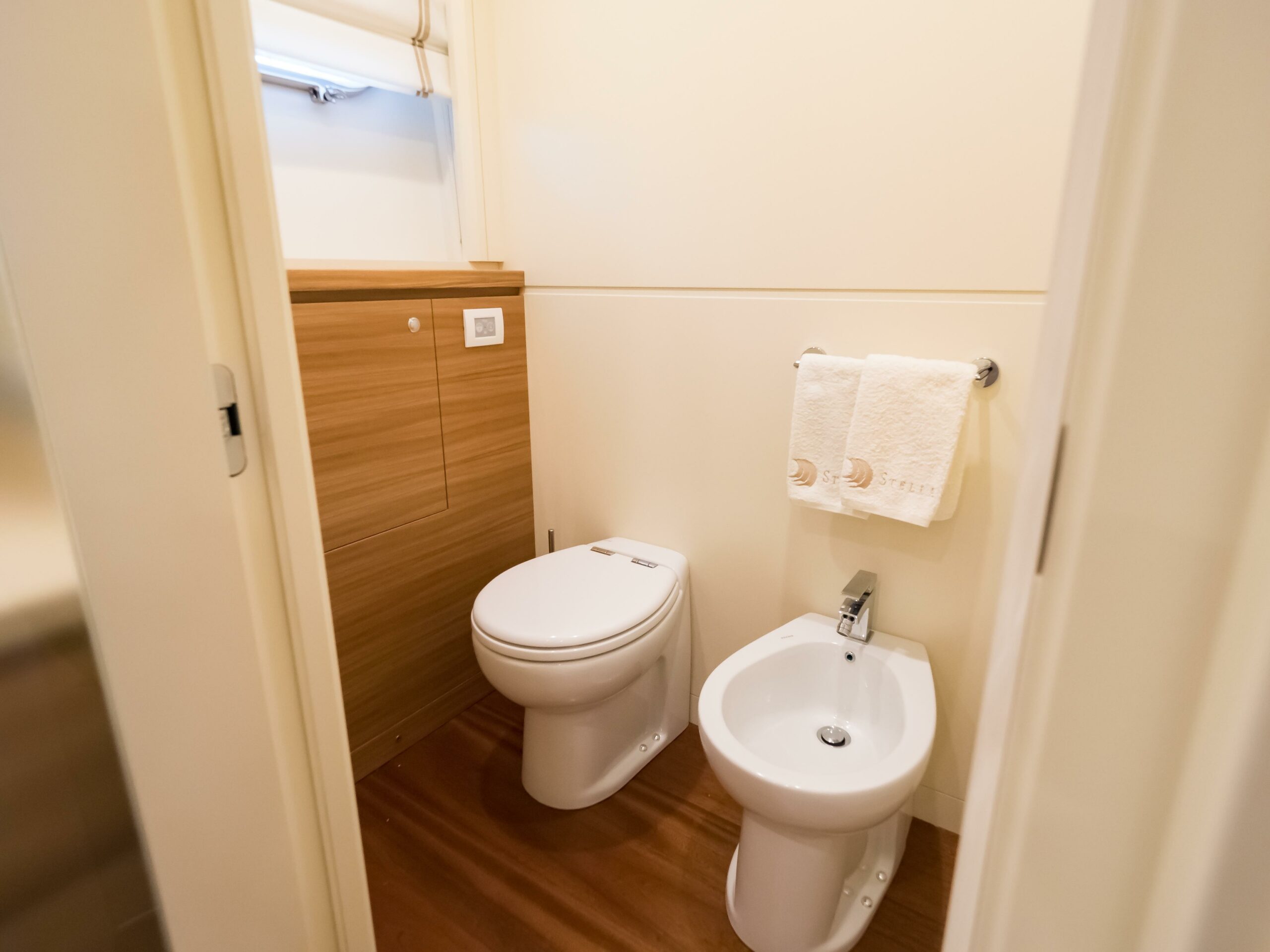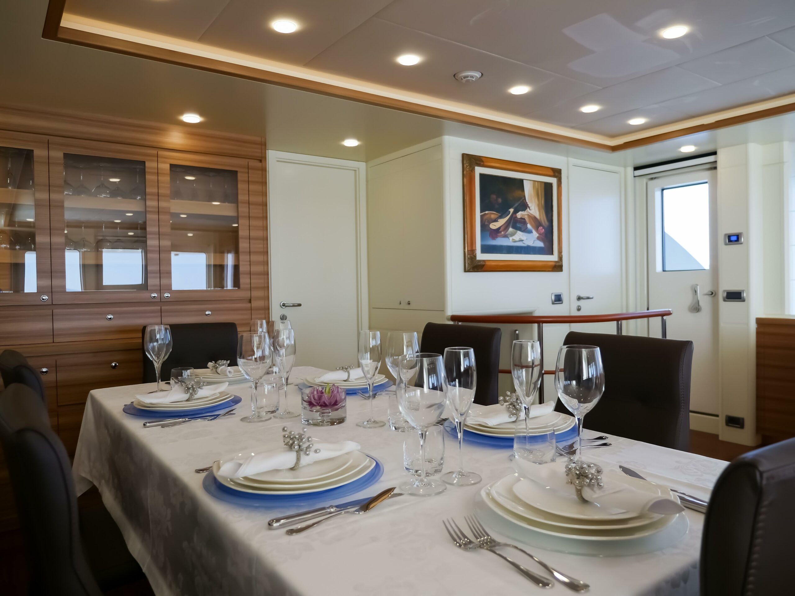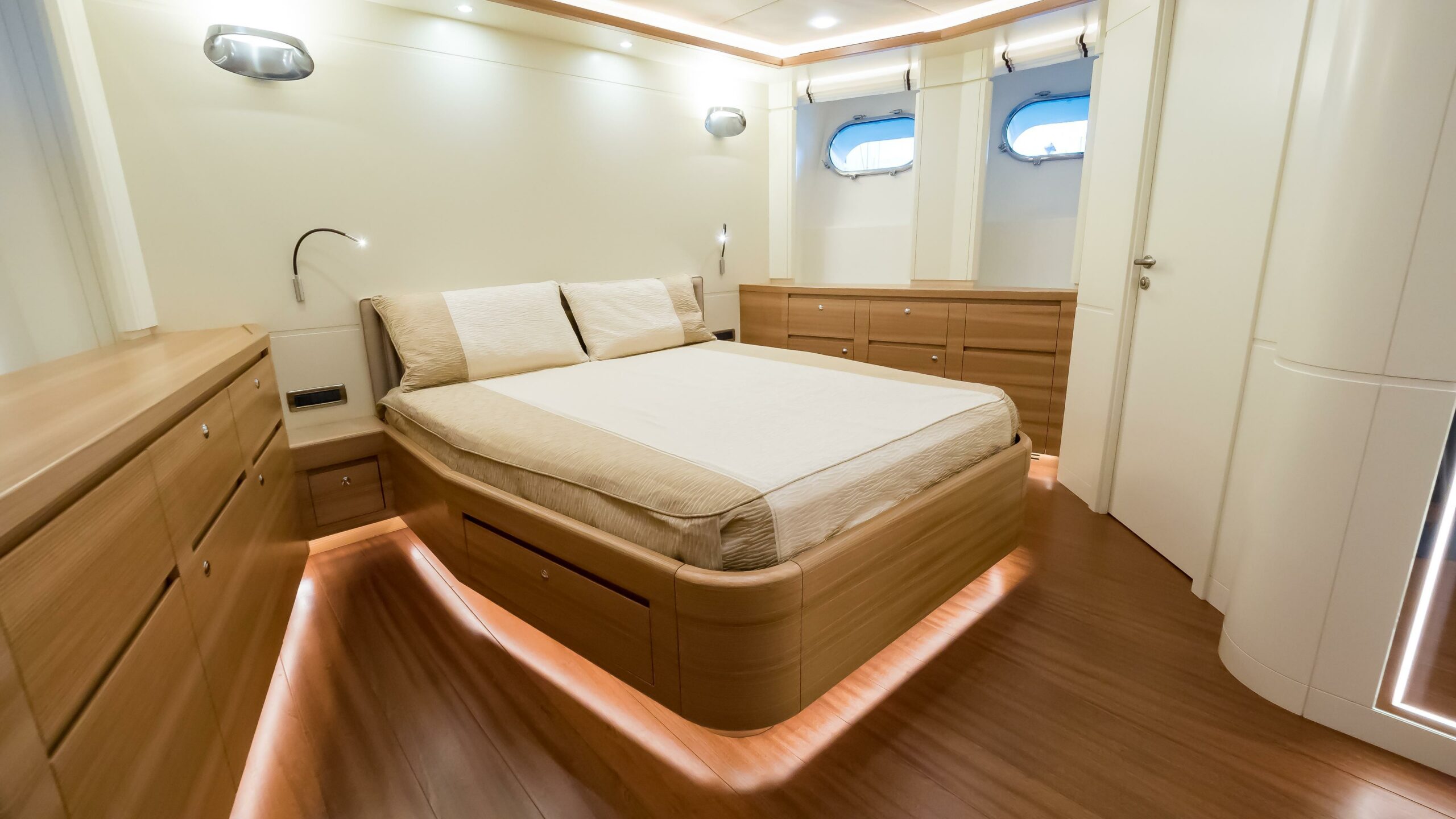 Accommodating up to 10 guests in 4 en-suite staterooms, including a full-beam master suite positioned amidships in the most stable part of the yacht, her interior features natural elm wood, iroko floors, and high 2.10m ceilings. Two double guest cabins and one twin with Pullman berths complete the guest layout. Separate crew quarters for 4 crew in 2 en-suite cabins, along with a dedicated crew mess and galley access via the side decks, ensure smooth and discreet service onboard.