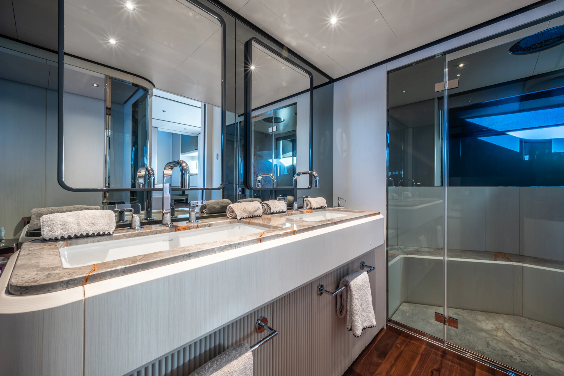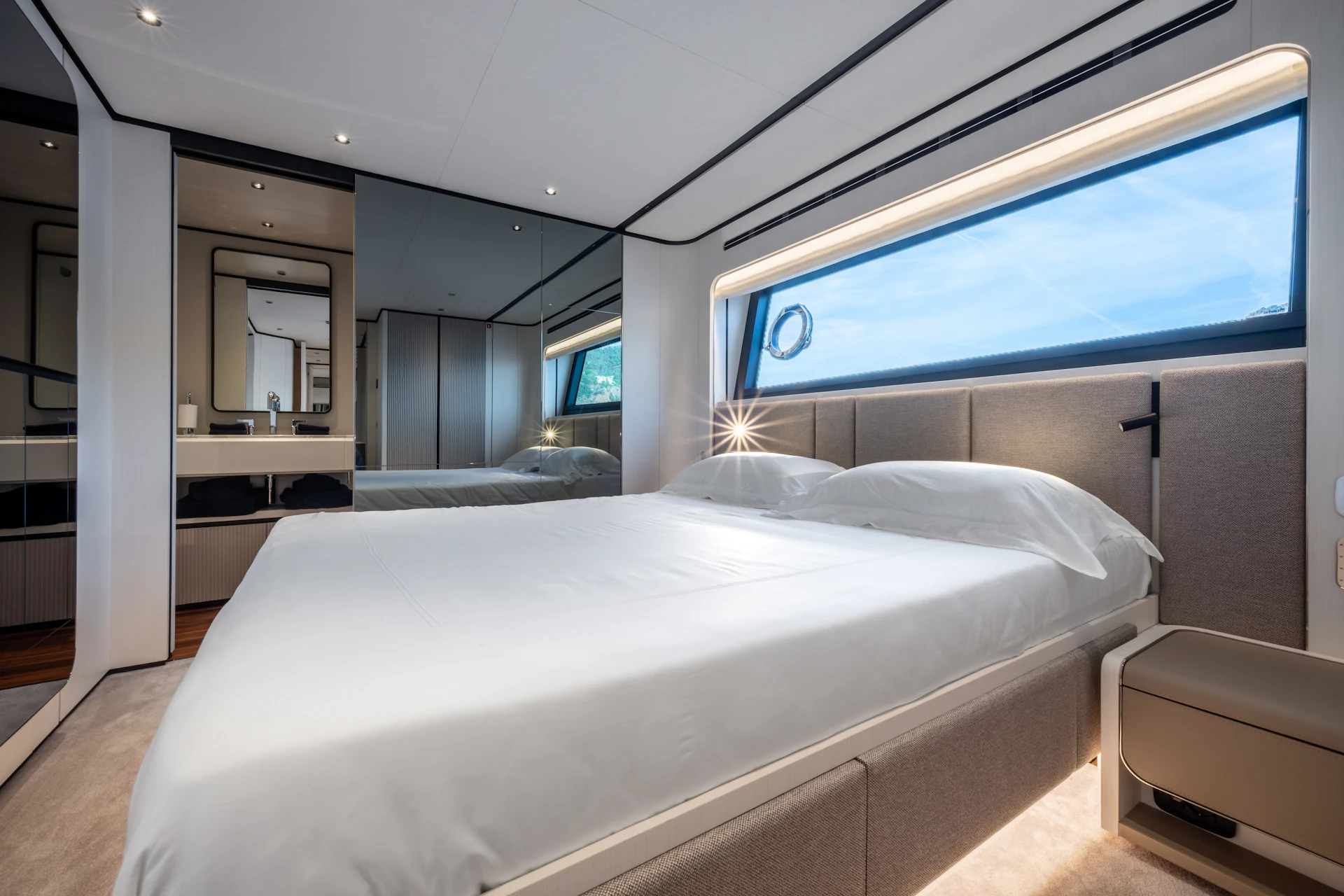 Inside, the Ferretti 940 for sale boasts a five-cabin layout that’s exceptionally rare in her size class. The main-deck full-beam master suite offers privacy and panoramic views, while the lower deck hosts three VIP doubles and one twin cabin, all finished in a contemporary palette by Ideaeitalia. Large windows and clean lines give the interior a bright, open feel, and the layout has been carefully planned for both family use and light chartering, with separate crew access and a generous galley.